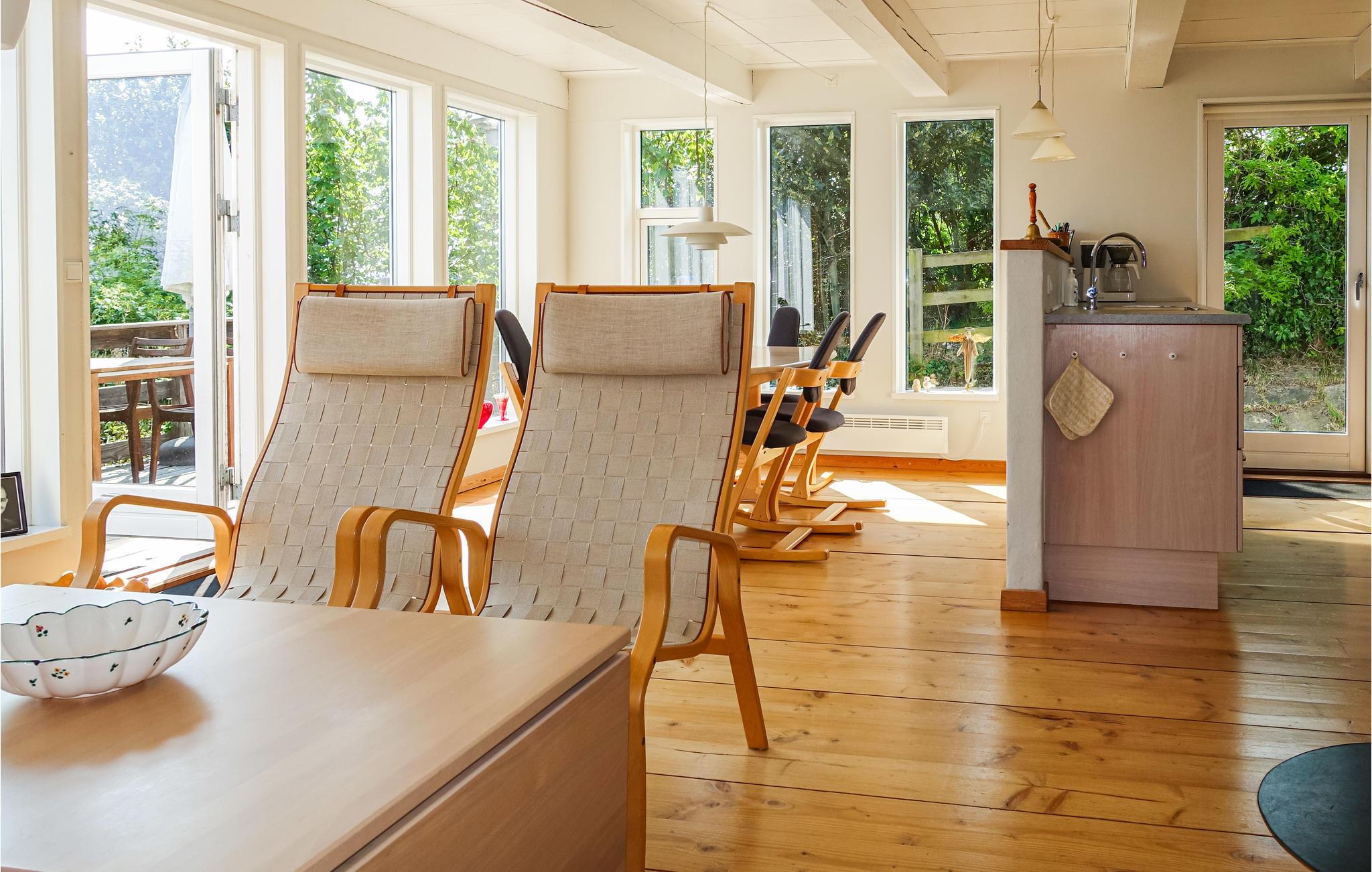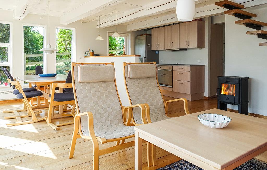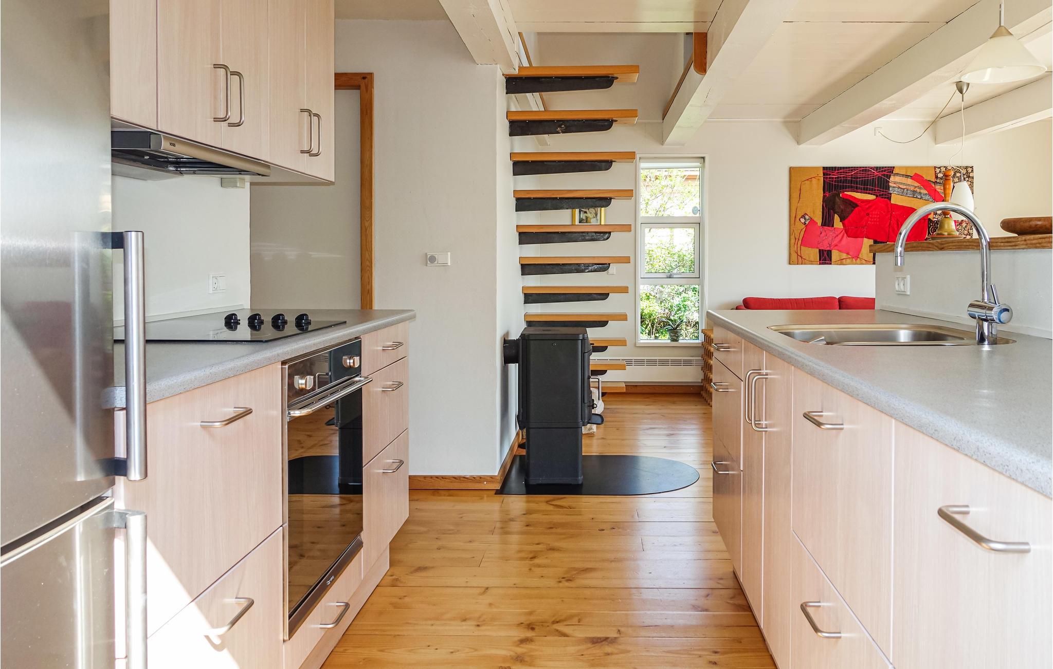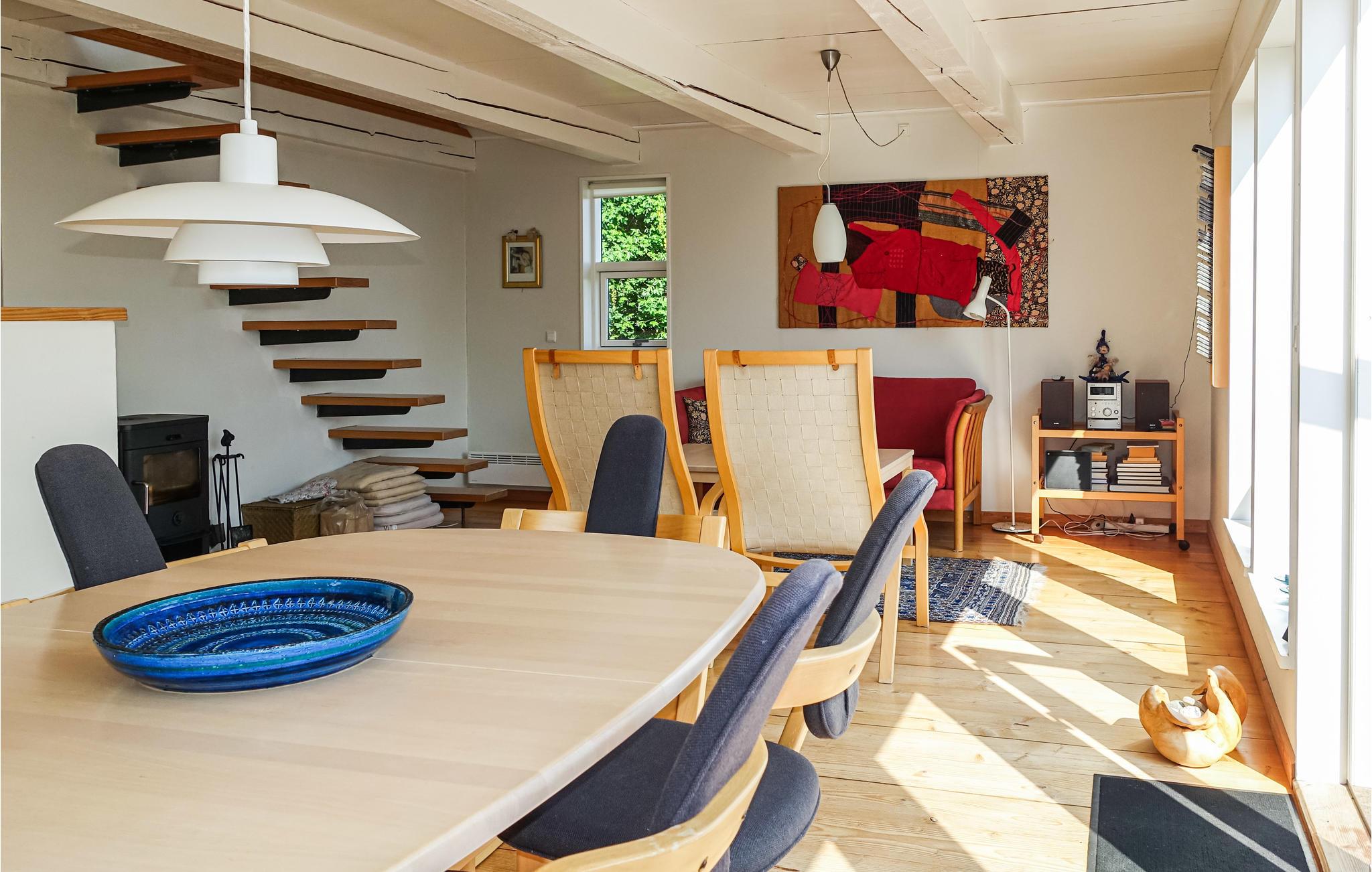 Sie wohnen in Sandkås, in der Nähe von Tejn, nur 50 Meter vom Meer entfernt. Hier finden Sie einen schönen Sandstrand, Klippen und Zugang zum schönen Küstenweg zwischen Allinge und Tejn. Freuen Sie sich auf eine Fülle an schönen Details, von der eleganten Treppe im Wohnzimmer bis hin zum herrlichen Meerblick. Heizen Sie den Kaminofen einem kühlen Herbsttag an, oder machen Sie es sich mit einem guten Buch im 1. Stock gemütlich.