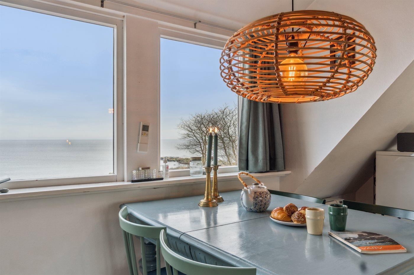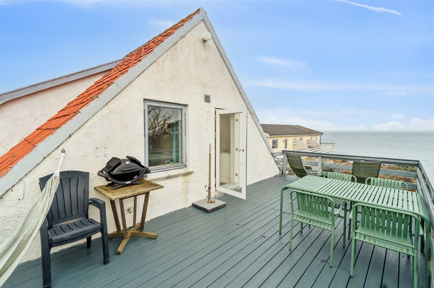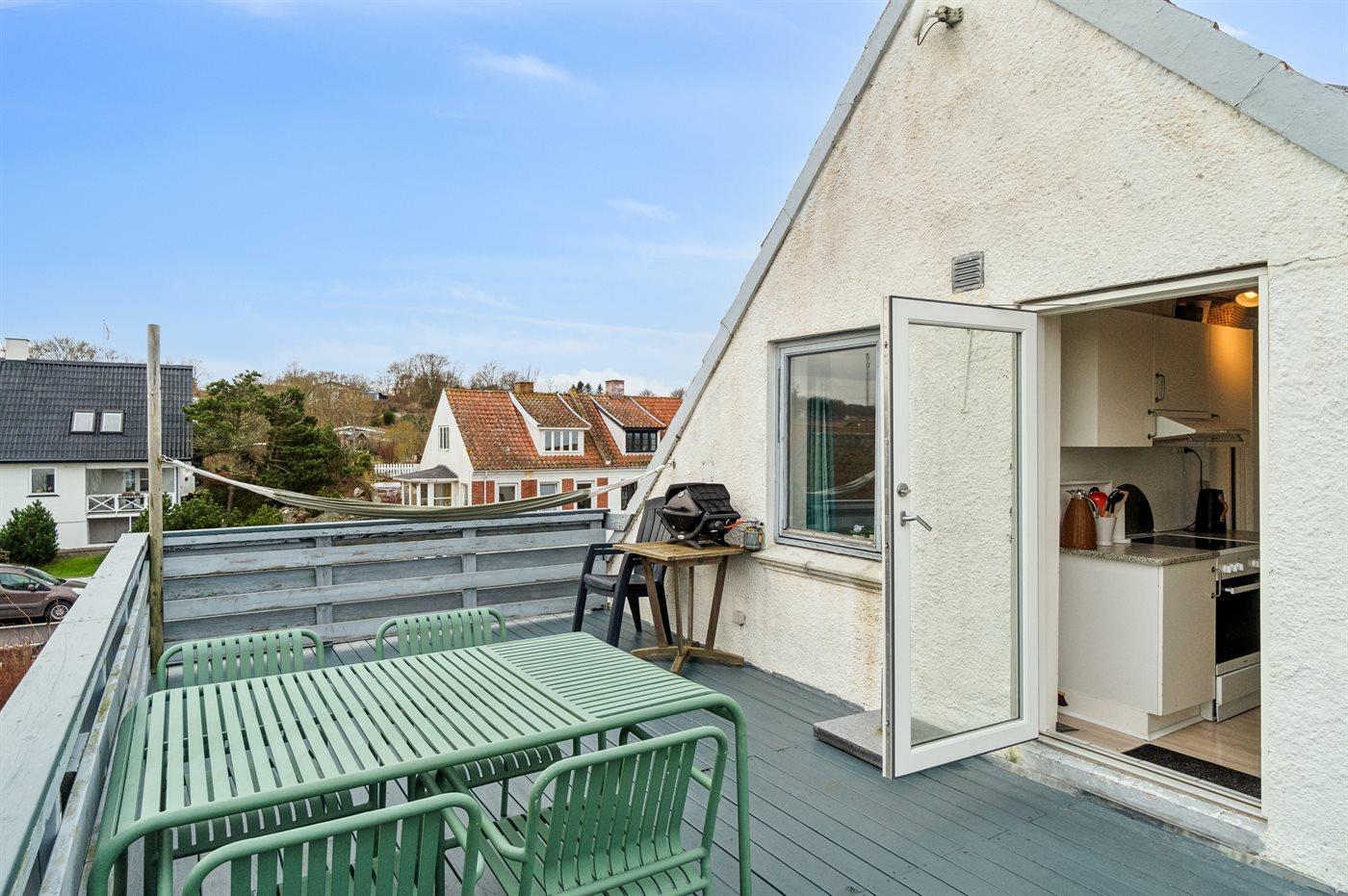 Gemütliche Ferienwohnung mit Meerblick und großer Dachterrasse in Allinge/Sandvig, perfekt für einen erholsamen Nordbornholm-Urlaub.