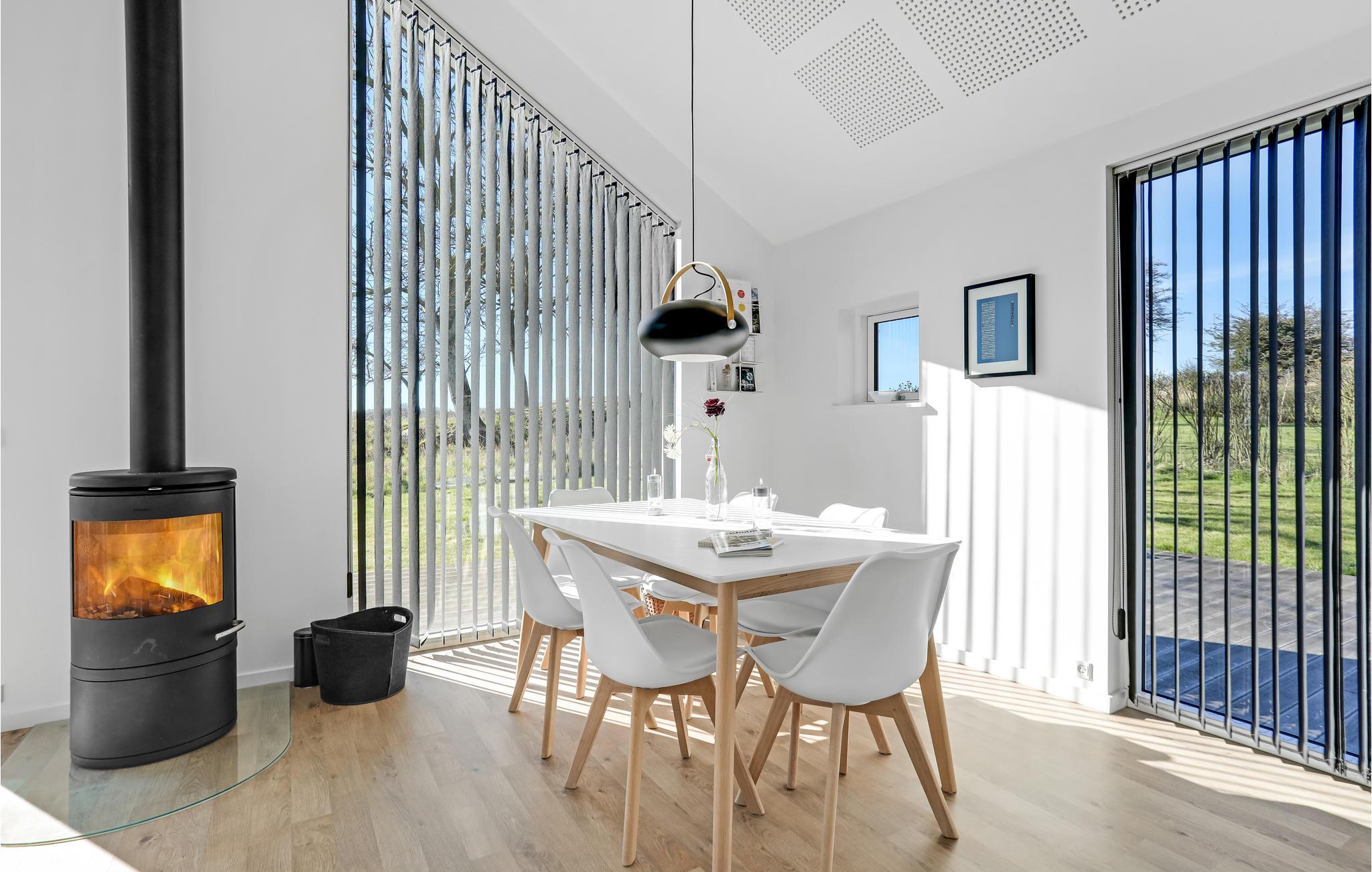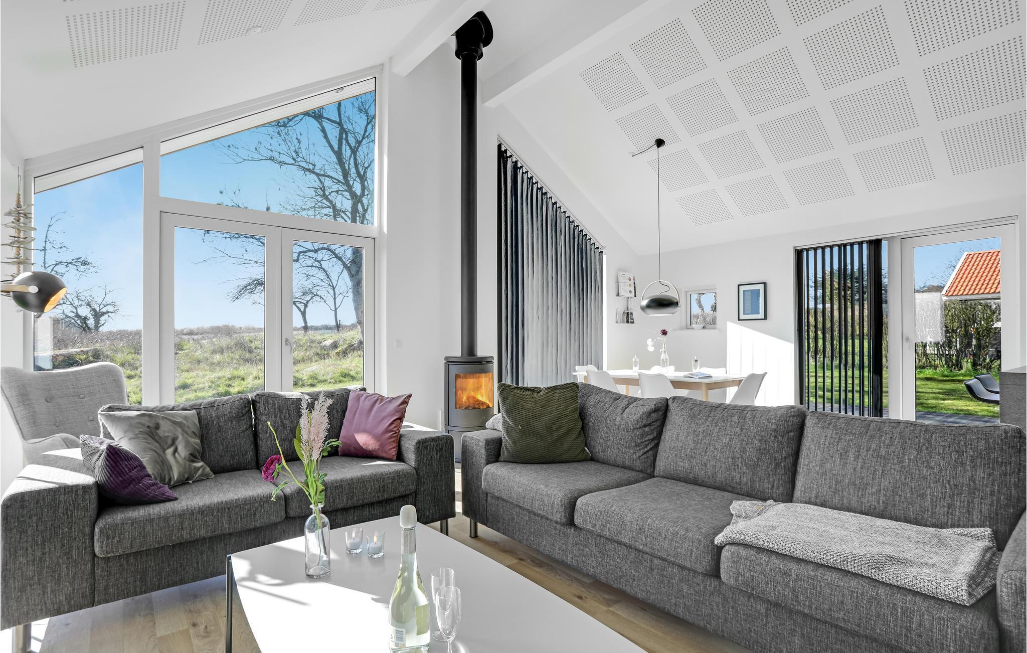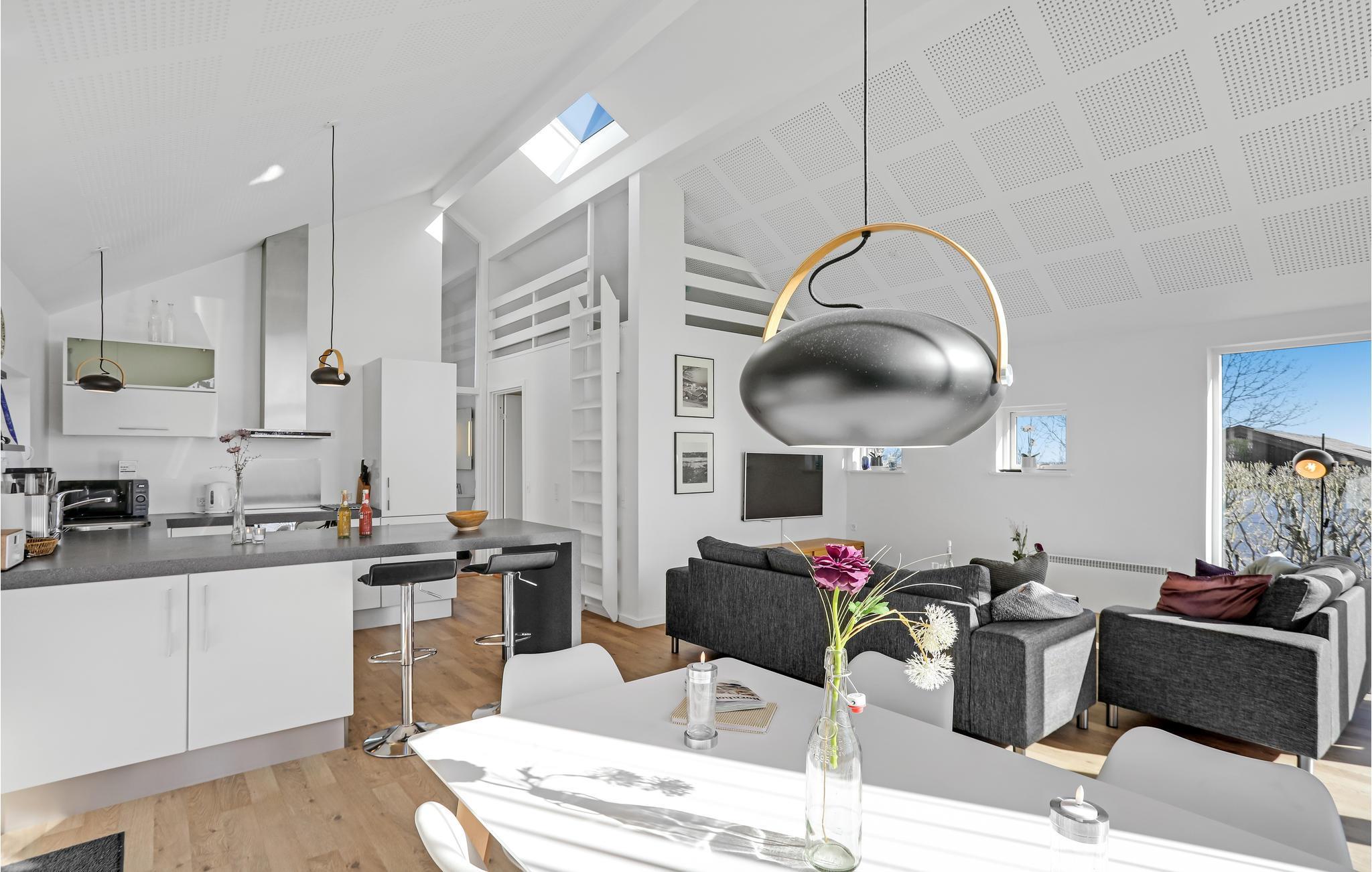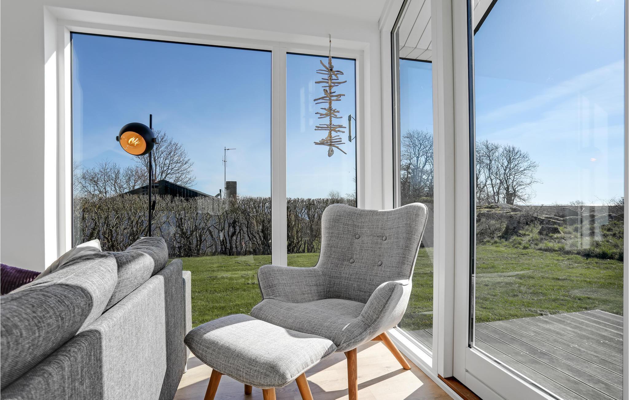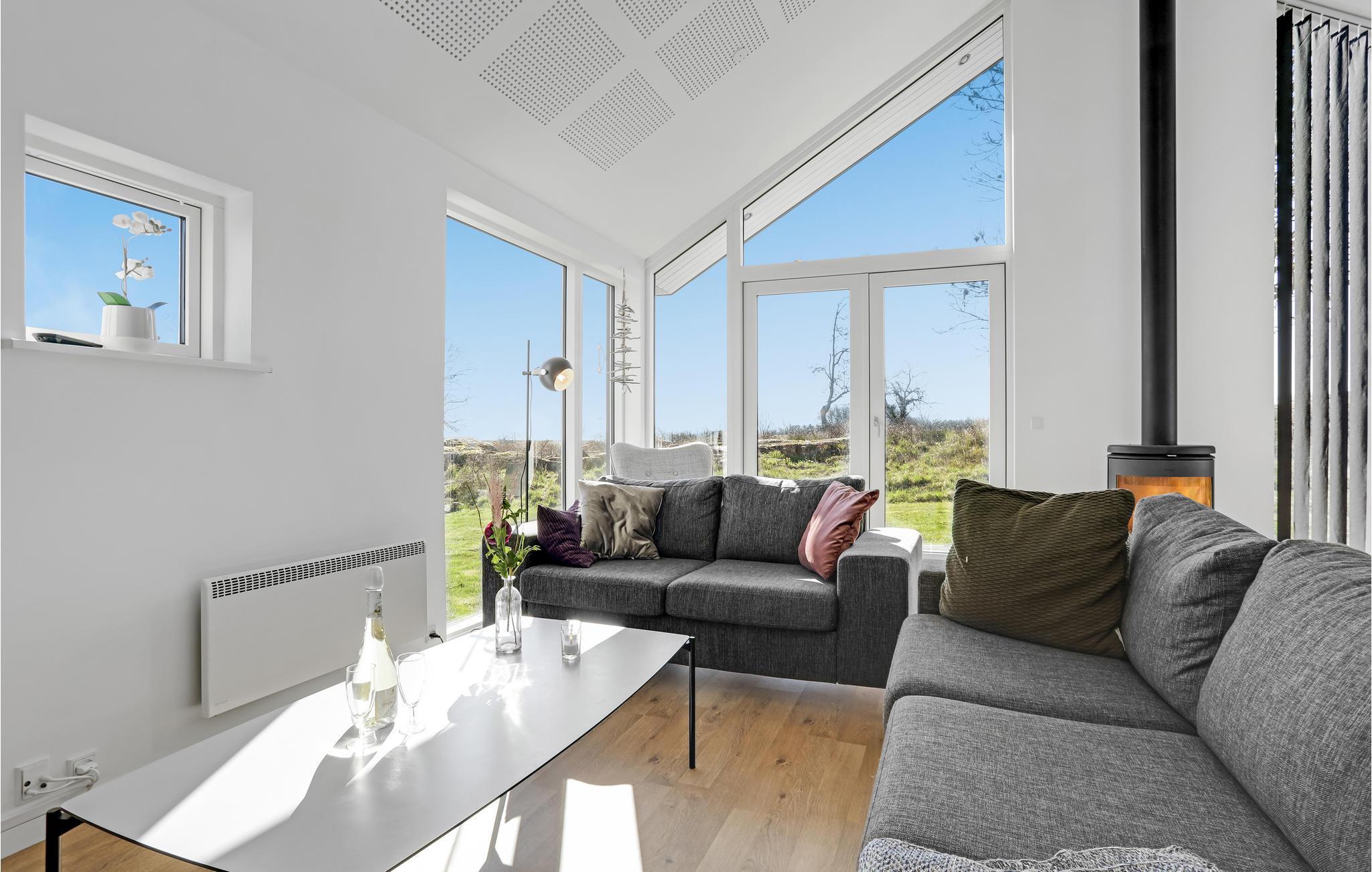 Modernes Architektenhaus mit Meerblick, Terrasse, Kaminofen und Elektroauto-Ladestation in Sandvig, nahe Strand und Natur.