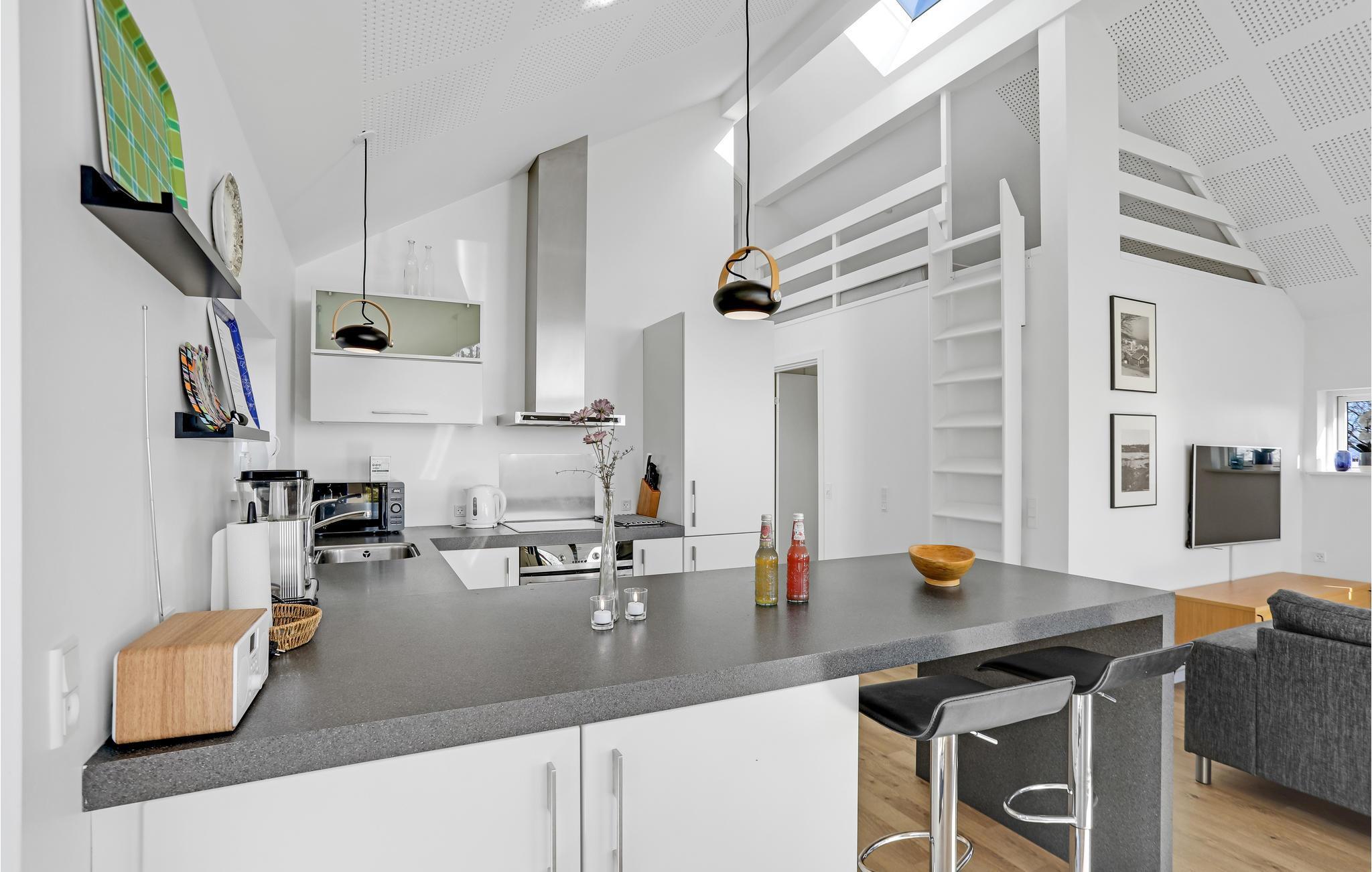 Das Haus ist hell und modern eingerichtet. Eine geräumige und sehr gemütliche Atmosphäre entsteht durch die Offenheit der Räume bis unter den Dachgiebel. Das schöne Wohnzimmer ist mit bequemen Sitzgelegenheiten, einem Holzofen für die kühlere Jahreszeit und einem Fernseher mit Apple TV für die abendliche Unterhaltung ausgestattet. Große Fenster lassen viel Licht herein und eröffnen einen schönen Blick auf das Meer und die grüne Umgebung. In der offenen, gut ausgestatteten Küche lassen sich köstliche Mahlzeiten leicht zubereiten. Im Badezimmer des Hauses befindet sich eine Fußbodenheizung.