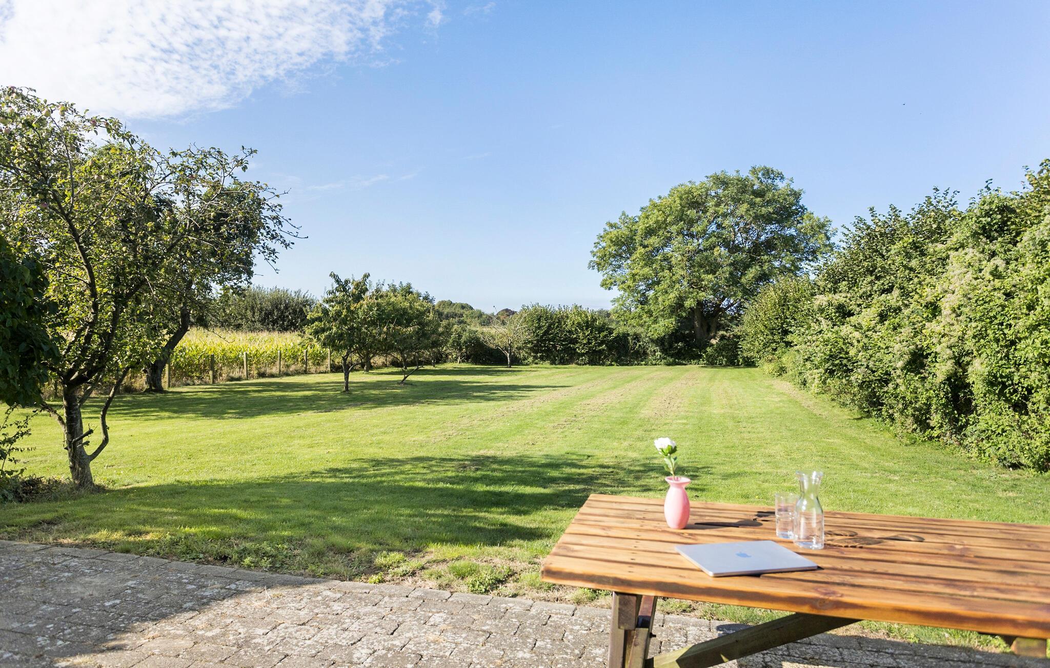 An warmen Tagen lädt die Terrasse dazu ein, den Grill anzufeuern und das Essen inmitten der grünen Gartenidylle zu genießen. Die große Naturgrundstück mit Rasenflächen und Obstbäumen teilen Sie mit Rehen und Damhirschen, die regelmäßig vorbeischauen.