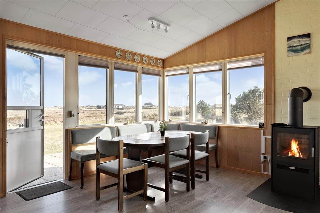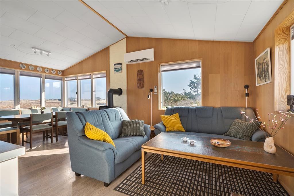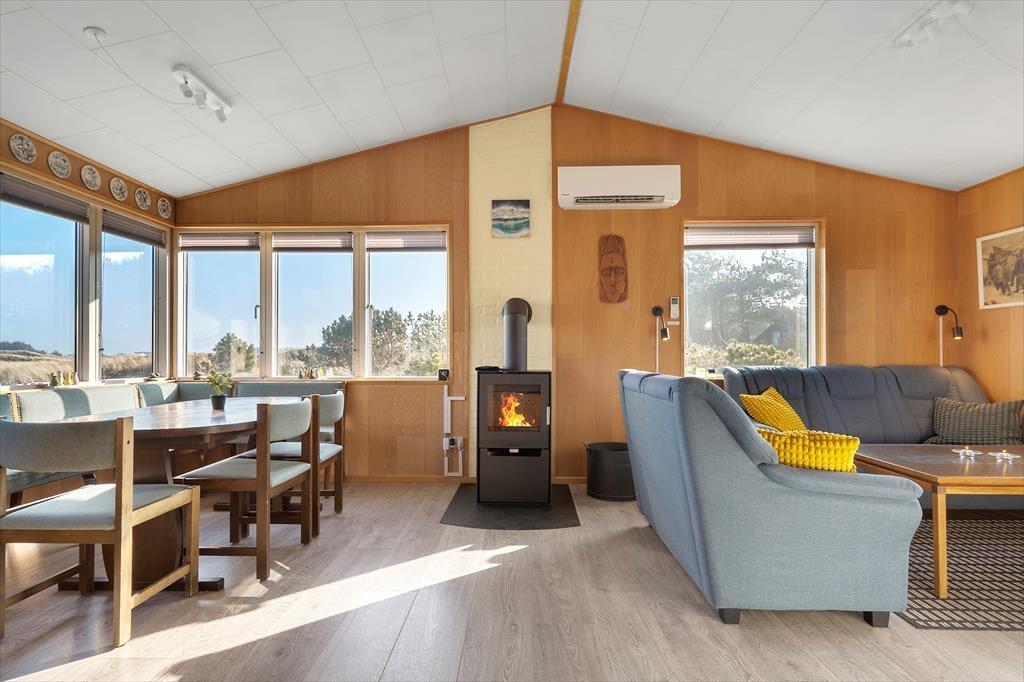 Dein Ferienhaus ist ansprechend und gemütlich eingerichtet und begrüßt dich mit einem offen kombinierten Küchen-, Wohn- und Essbereich. In der zeitgemäßen, gut ausgestatteten Küche erleichtert dir unter anderem ein Geschirrspüler die Erledigung deiner alltäglichen Aufgaben. Die Polstersitzecke im Wohnbereich lädt dich und deine Mitreisenden zum gemütlichen Beisammensein, zum Lesen, zu spannenden Filmabenden und zu vergnügten Spielenachmittagen ein. Selbstverständlich kannst du dich auch in aller Ruhe niederlassen und dabei die ruhige Umgebung und die friedvolle Atmosphäre genießen. Behagliche Temperaturen versprechen die Wärmepumpe und der behaglich knisternde Kaminofen. Vielen entspannten und gemütlichen Stunden im Kreise deiner Lieben steht hier absolut nichts im Wege. Die prachtvolle Natur ringsum kommt selbst im Hausinneren besten zur Geltung. Große Fenster, die in drei Himmelsrichtungen weisen, verwöhnen mit einer prachtvollen Aussicht auf die Umgebung - unter anderem bis auf den Ringkøbing Fjord. In der Küche, der Polstersitzecke und am Esstisch blickst du hinaus in die Natur und auf das artenreiche Tierleben. Nicht selten beobachtest du dabei verschiedene Vogelarten, Kaninchen und Rehe. Die drei Schlafräume deines Ferienhauses beherbergen insgesamt fünf Personen - perfekt für einen unvergesslichen Urlaub mit der Familie.