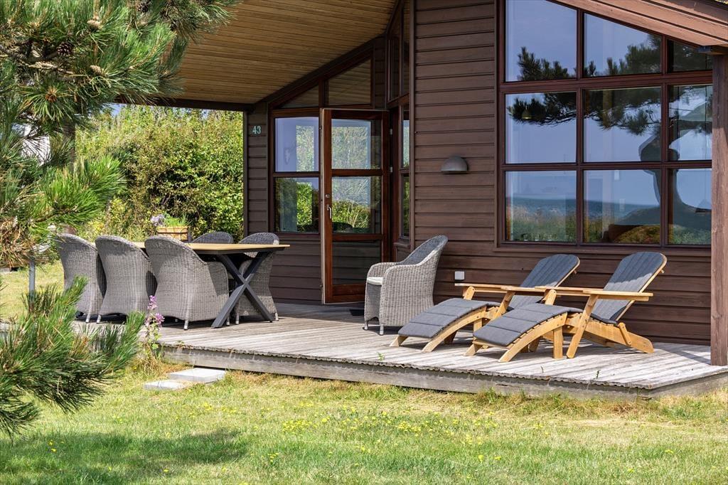Auf dem 1.342 m² großen Grundstück empfängt Sie eine schöne, teilweise überdachte Holzterrasse, auf der Sie vom Meerblick in den Bann gezogen werden. Gartenmöbel, Liegestühle, ein Sonnenschirm und ein Grill stehen für Sie bereit. Ihre Kinder werden sich garantiert sehr über das Gartentrampolin freuen.