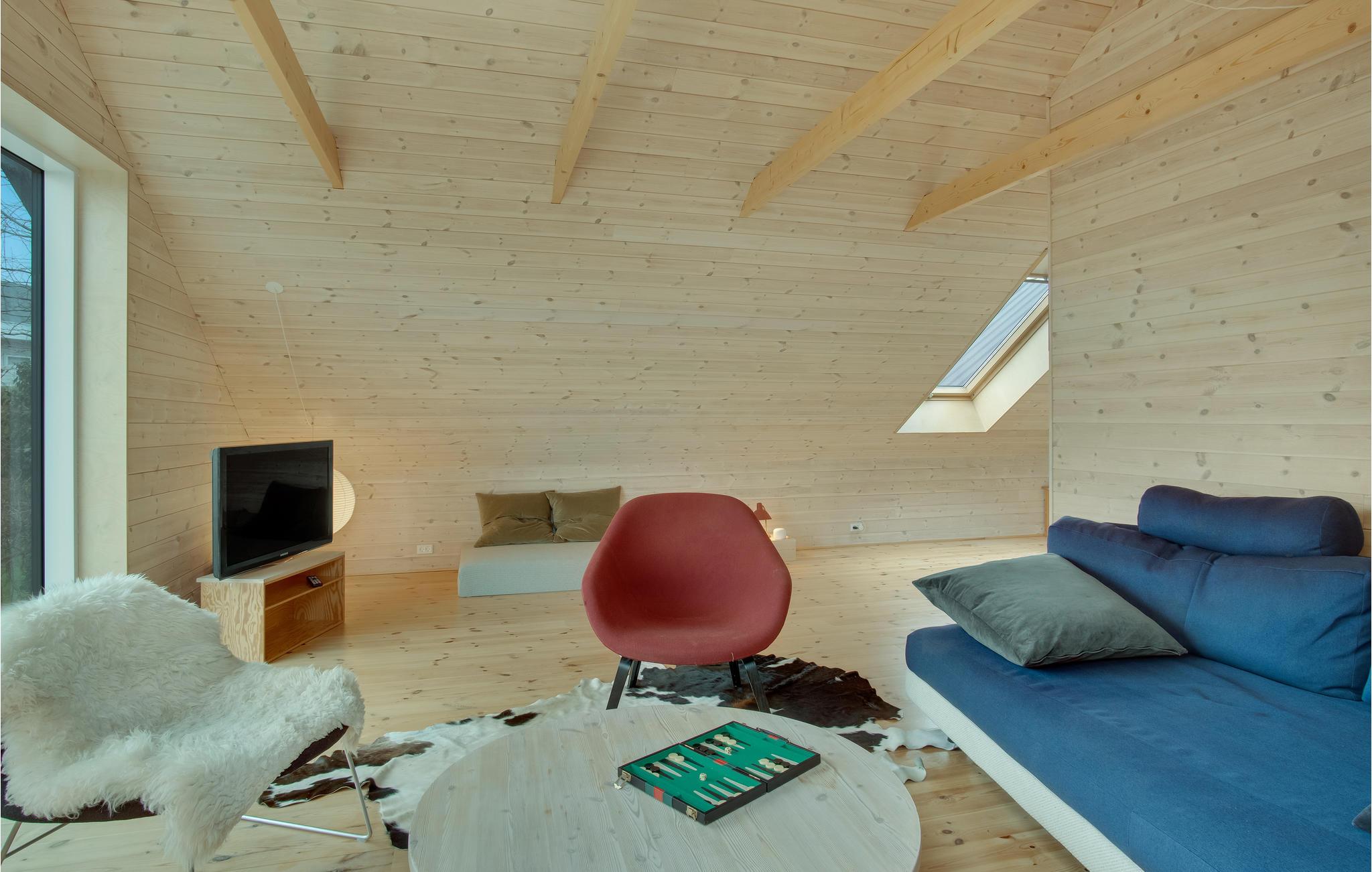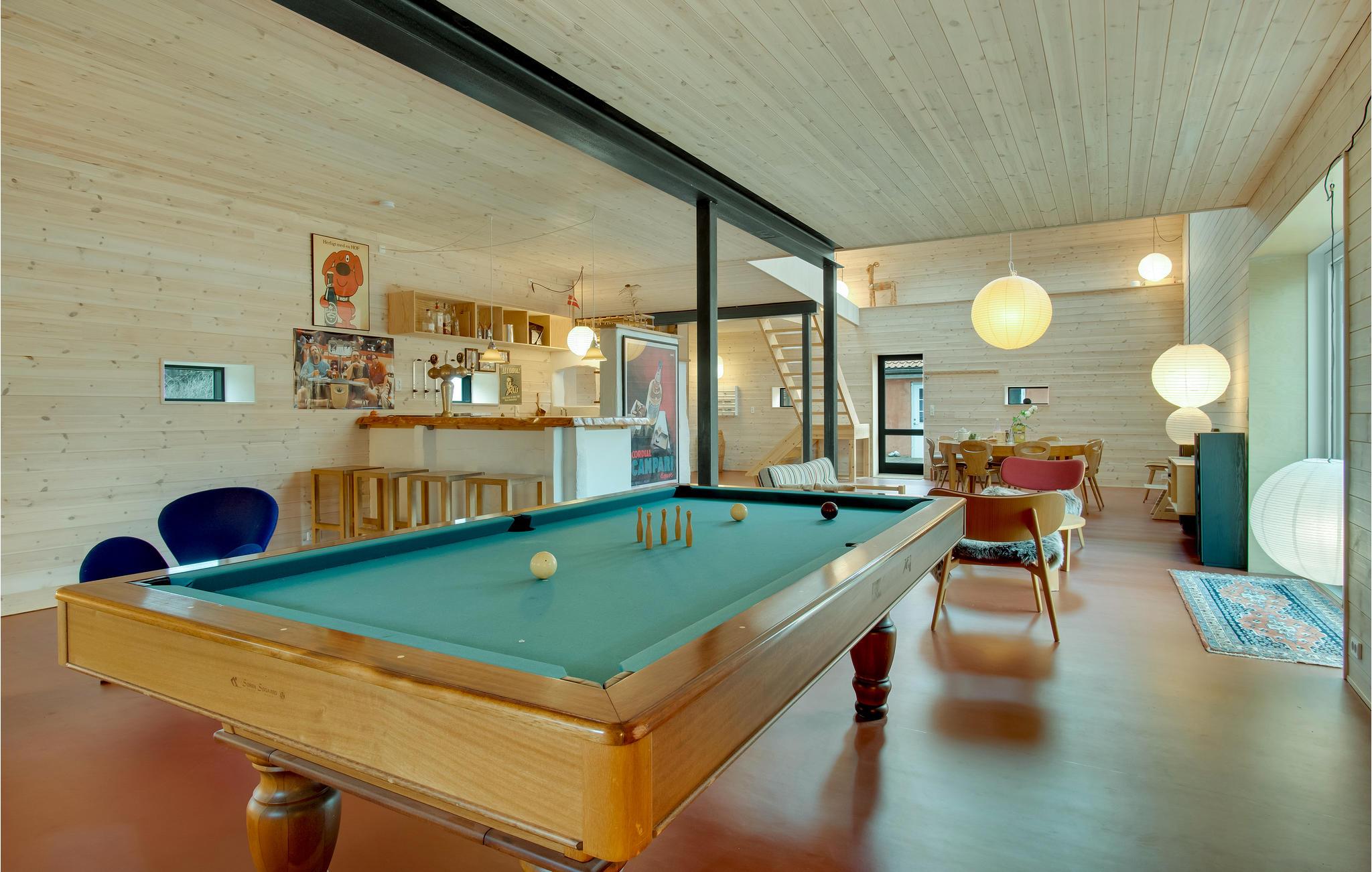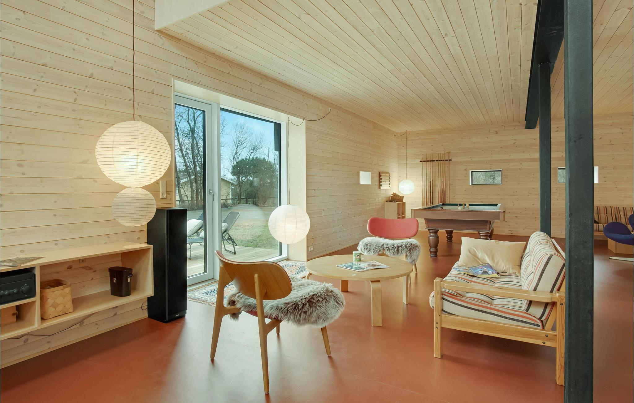 Hier können Sie sich mit Ihren Lieben häuslich einrichten. Die hellen Räume mit moderner Einrichtung und markanten Holzbalken schaffen eine behagliche Wohlfühlatmosphäre im Haus. Bodentiefe Fenster sorgen dafür, dass Sie den schönen Blick auf die Umgebung ideal genießen können. Freuen Sie sich auf ausgelassene Familienduelle beim Billard oder Tischtennis und gemeinsame Mahlzeiten mit Blick in den Garten. Machen Sie es sich am Ende eines herrlichen Tages im Wohnbereich zusammen gemütlich und plaudern Sie bis spät in den Abend beim leisen Knistern der Flammen im Kaminofen.