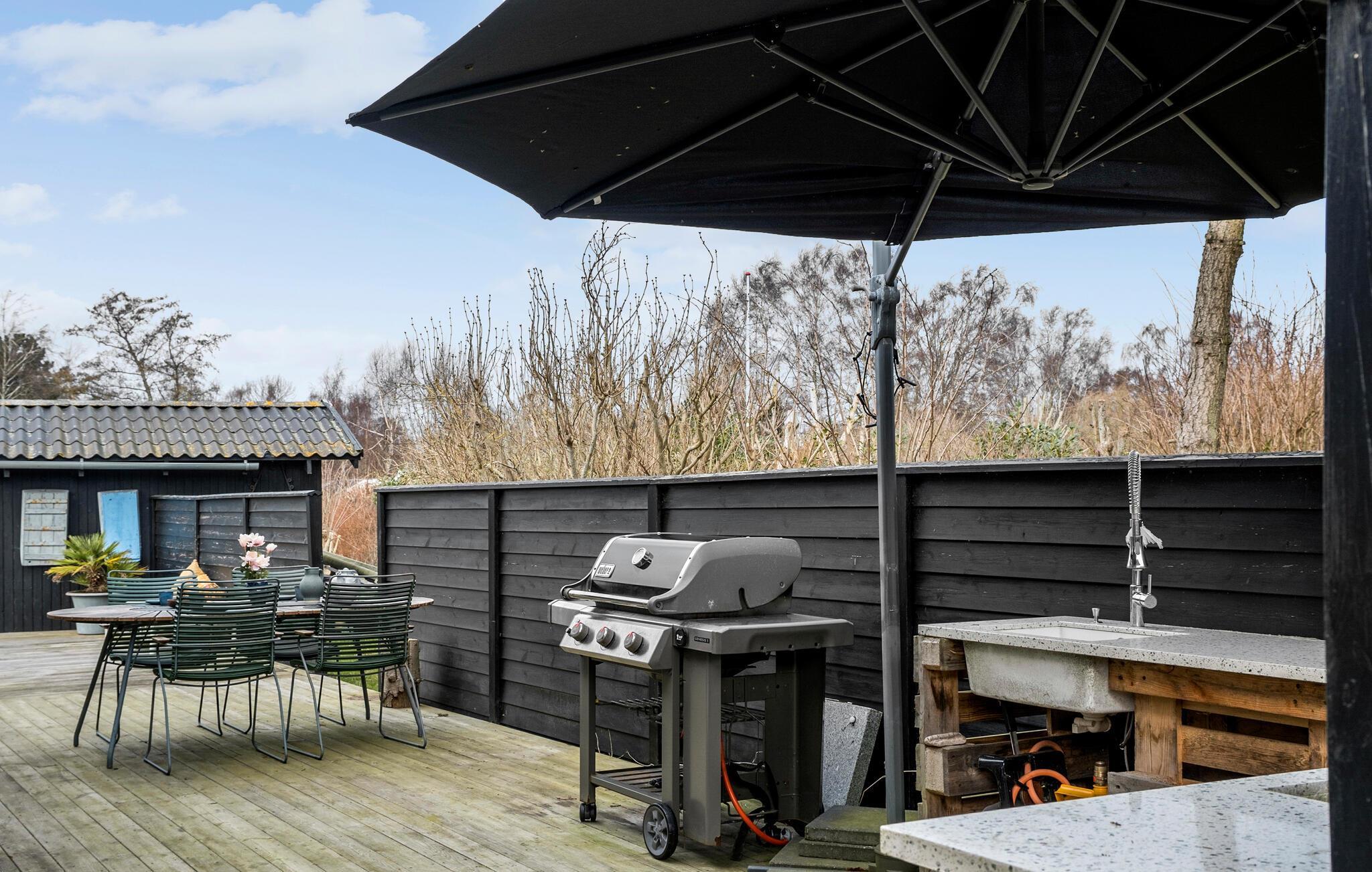 Im Außenbereich erleben Sie erholsame Stunden auf der großen Holzterrasse mit Grill, gemütlichen Sitzmöbeln und Sonnenliegen. Genießen Sie entspannte Grillabende, spielen Sie eine Partie Billard im Freien oder veranstalten Sie im Garten spannende Kubb-Wettkämpfe. Eine urige Feuerstelle im Grünen lädt ein, den Tag gemeinsam ausklingen zu lassen.