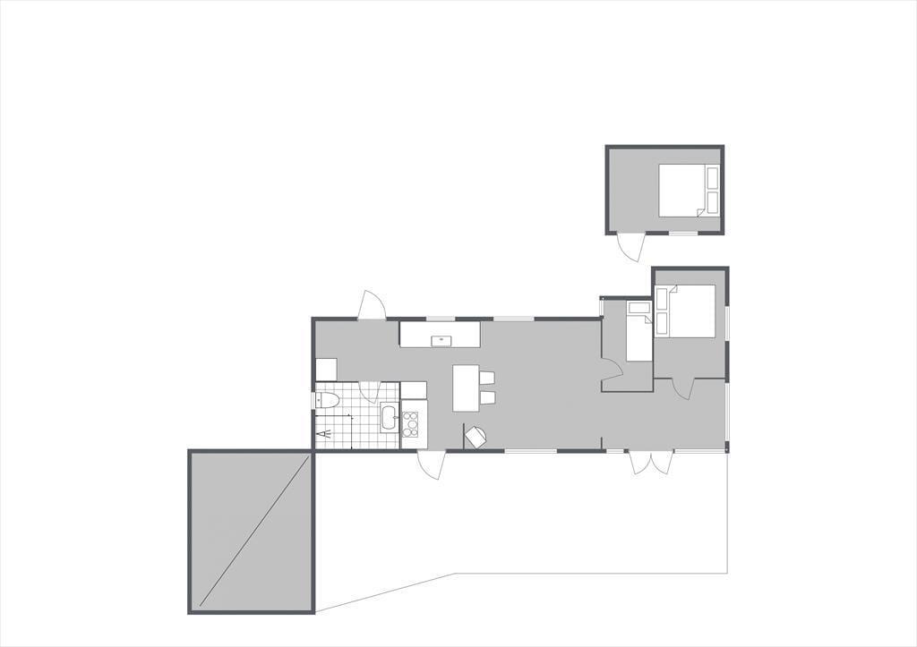 Der Wohnraum deines Ferienhauses ist mittig zwischen der offenen Küche und dem Esszimmer mit langer Fensterfront platziert. Während du das Abendessen zubereitest, den Tisch deckst oder das Feuer im Einbaukaminofen anheizt, genießt du somit zu jeder Zeit die Nähe deiner Lieben, die es sich beispielsweise auf dem Sofa gemütlich gemacht haben. Während du in den Töpfen rührst, leisten dir deine bessere Hälfte oder deine Kinder dank der Barhocker am Küchentresen sicherlich gerne Gesellschaft. Gemeinsame Mahlzeiten am Esstisch werden vom Ausblick in den Garten untermalt. An warmen Tagen stellt ihr während des Essens einfach die Terrassentür weit auf.