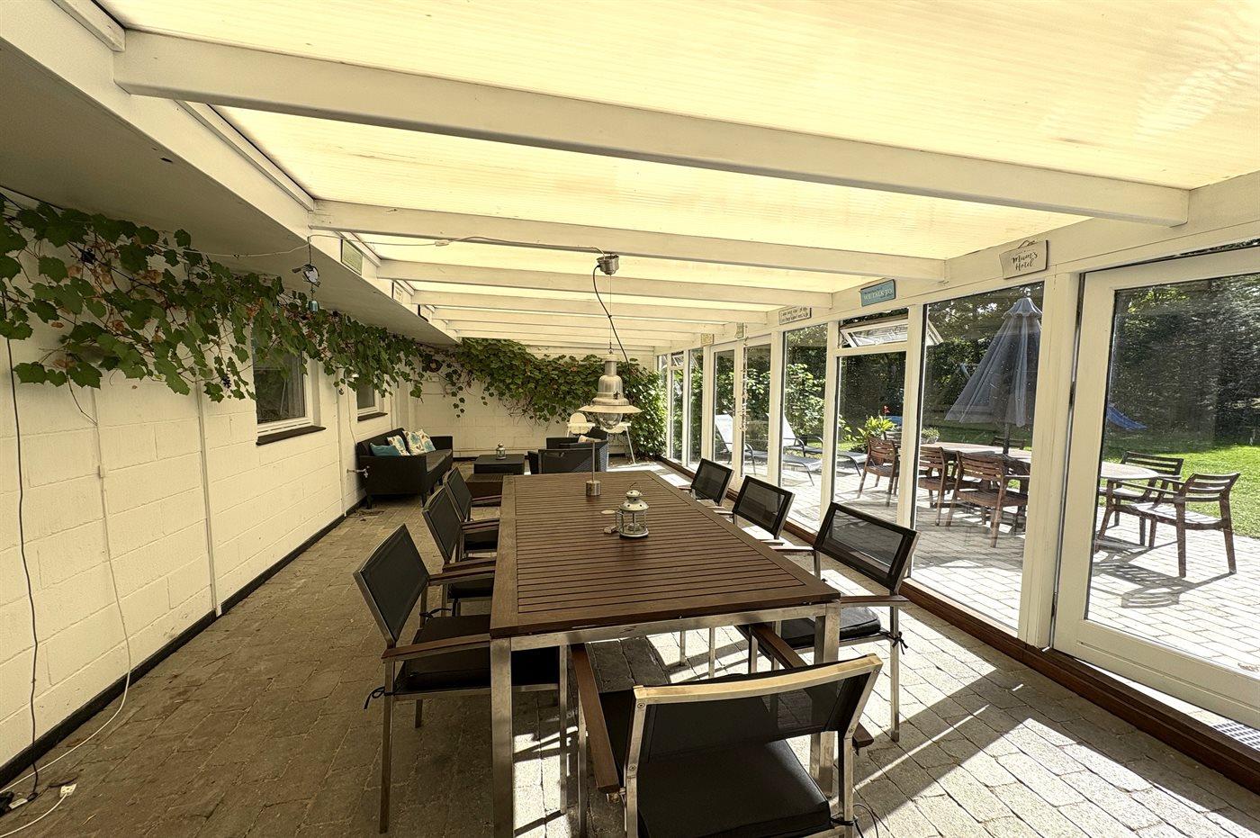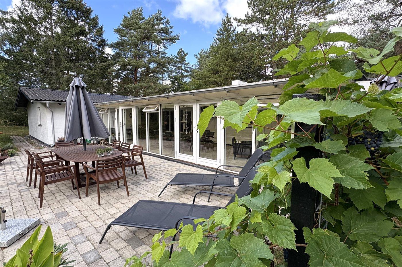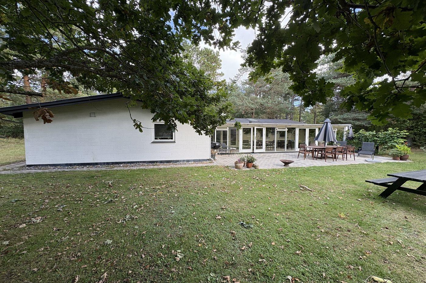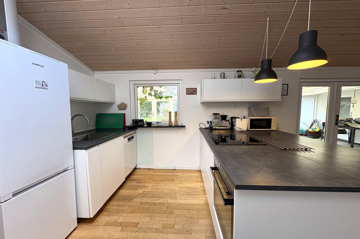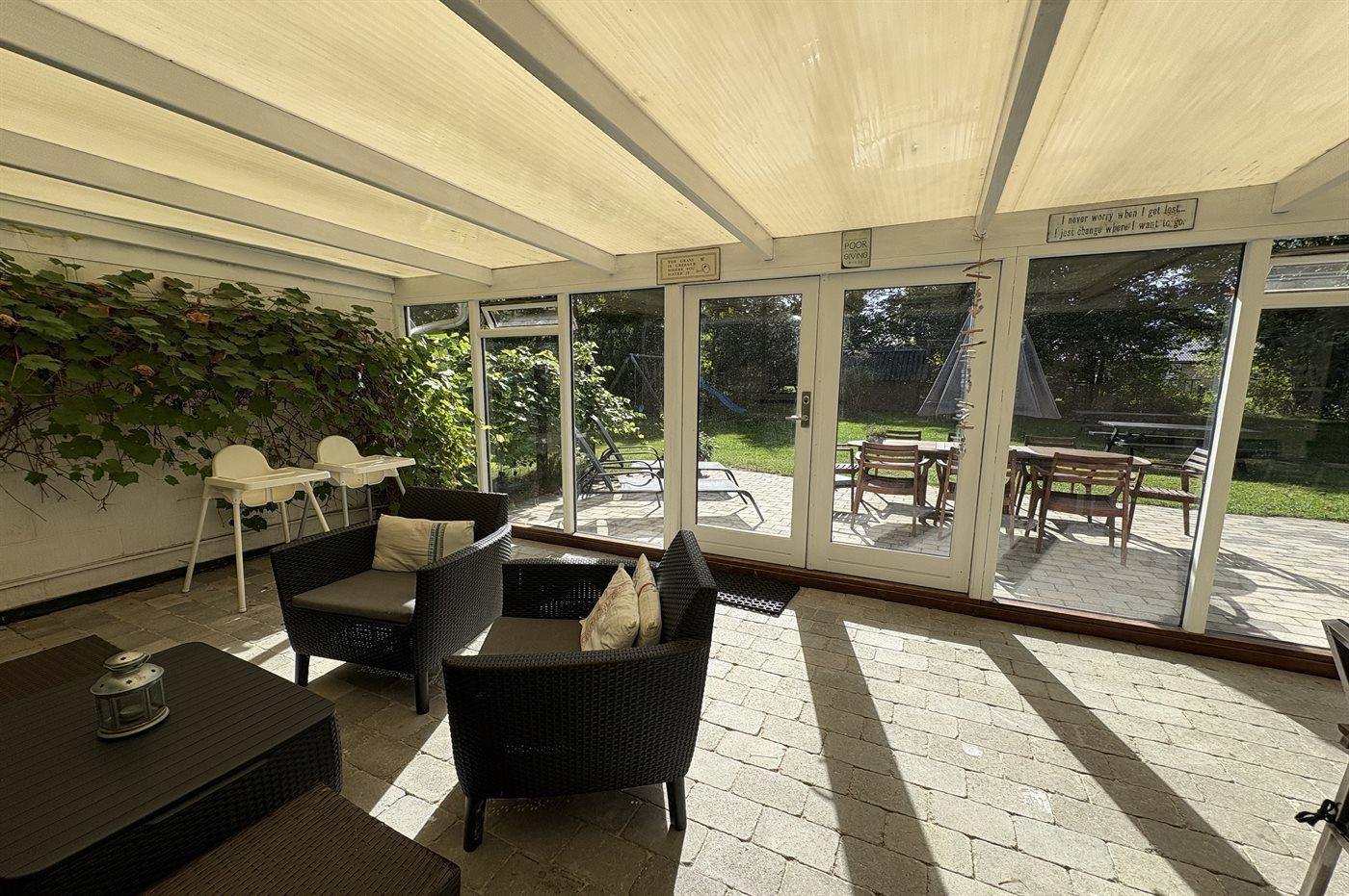 Das Haus lädt zu gemütliche Stunden mit der Familie und guten Freunden ein. In der großen Wohnküche, die direkt mit dem Wohnzimmer verbunden ist, gibt es viel Platz – genau wie in dem hellen und einladenden Wintergarten, der einen Großteil des Jahres genutzt werden kann. Auf der großen gefliesten Terrasse kannst du die Sonne und den Sommer genießen.