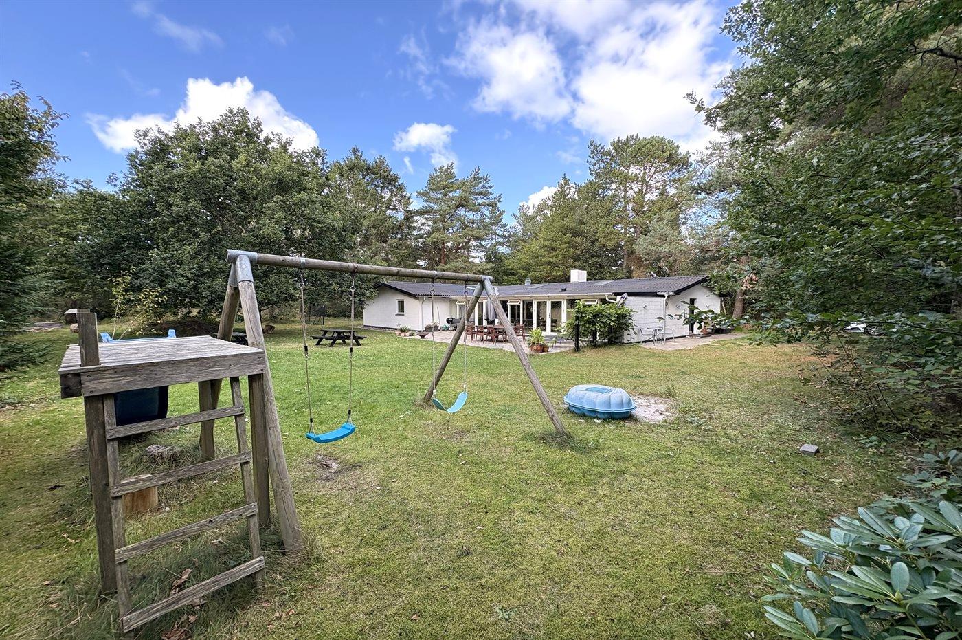 Der große Garten von insgesamt 2.956 m2 bietet viel Platz zum Spielen und für Aktivitäten im Freien. Für Kinder gibt es Sandkasten, Schaukel, Rutsche, Trampolin und Fußballtor. Ein Teil des Grundstücks ist naturbelassen mit Bäumen und Büschen – perfekt, um auf Entdeckungstour zu gehen.