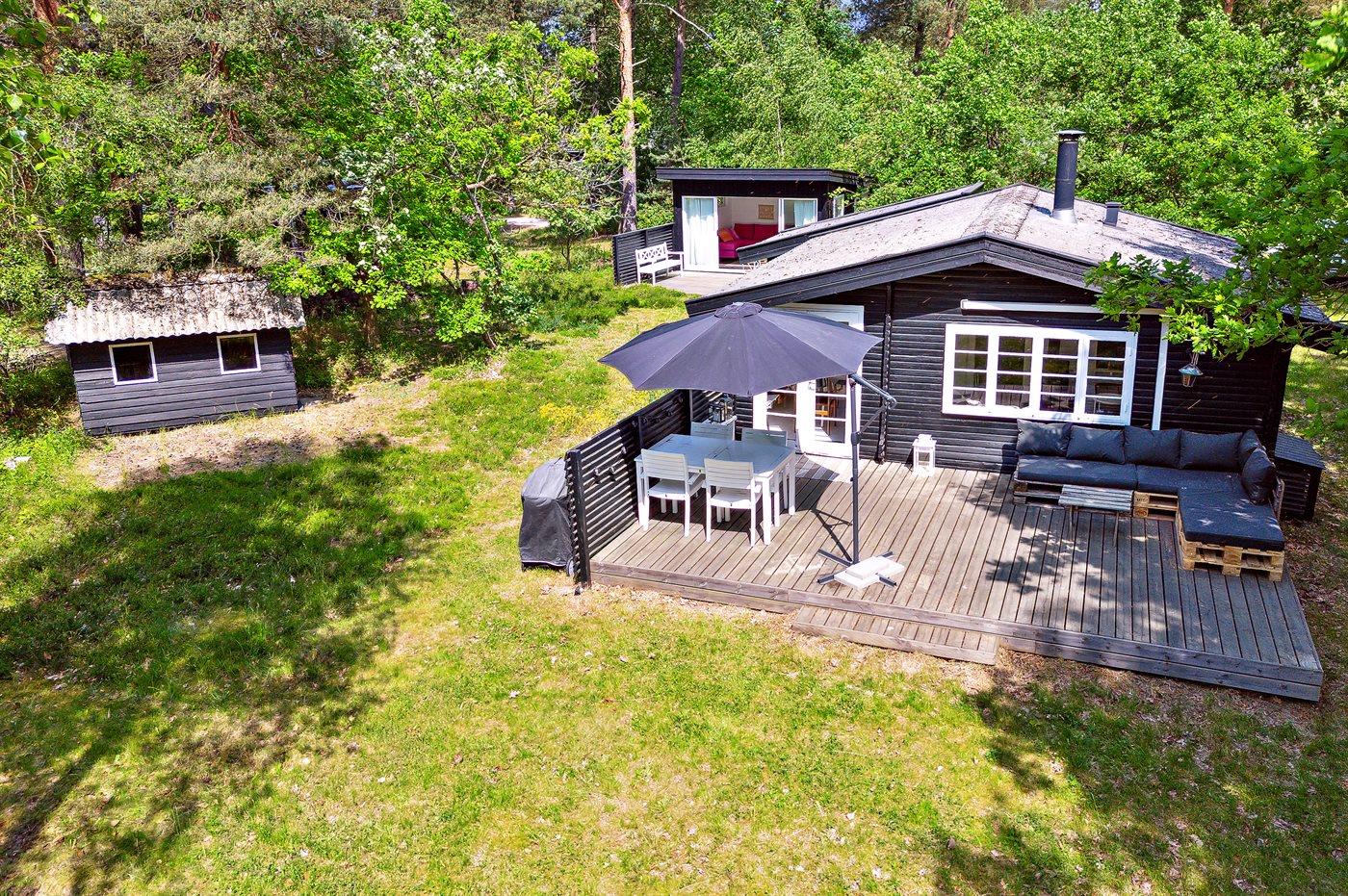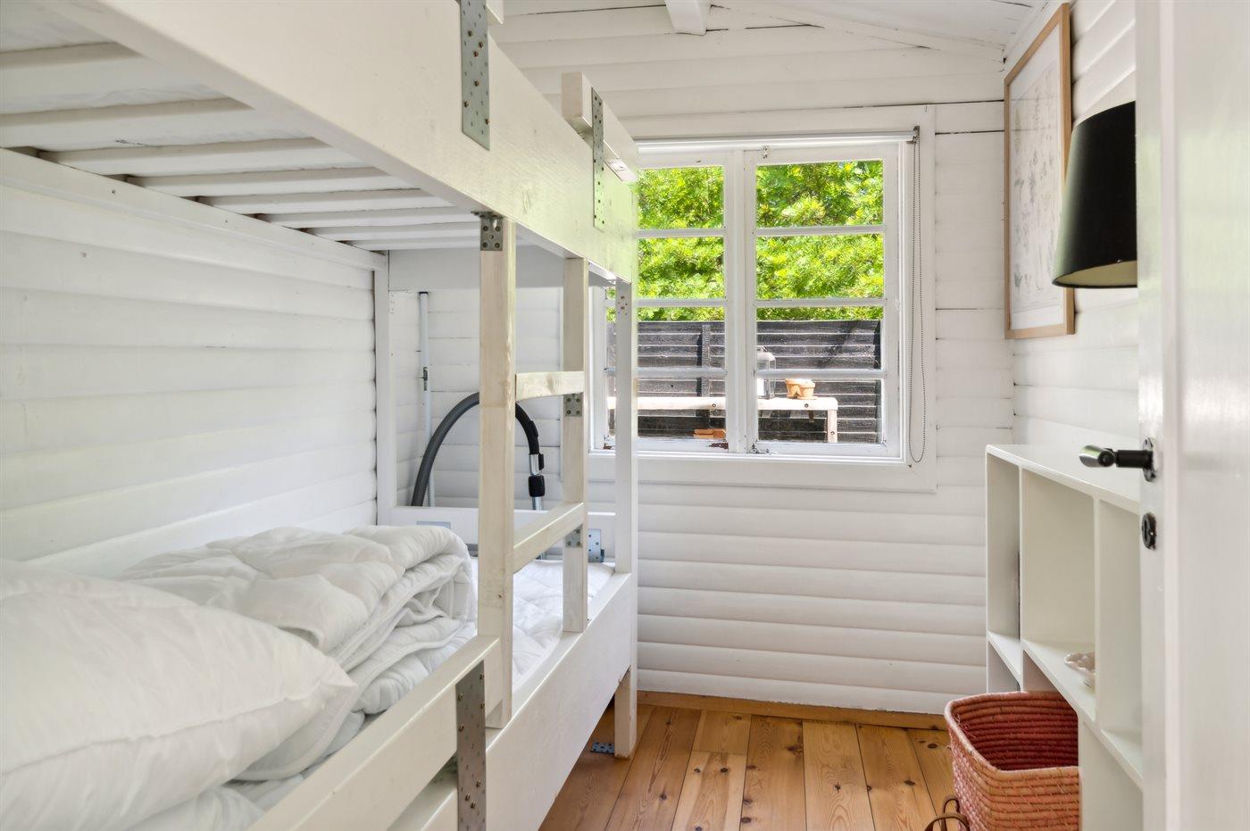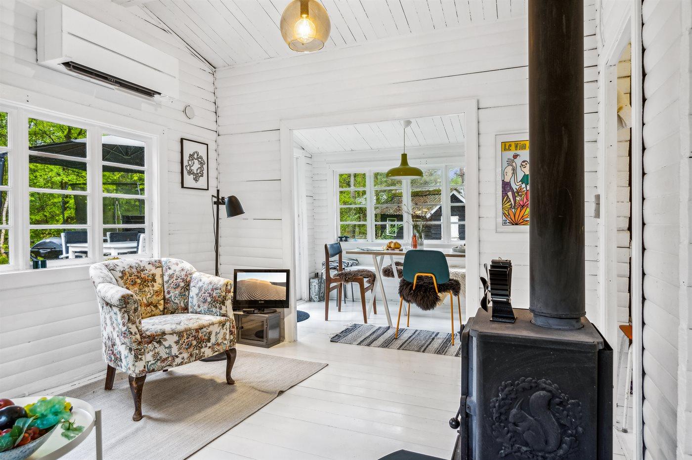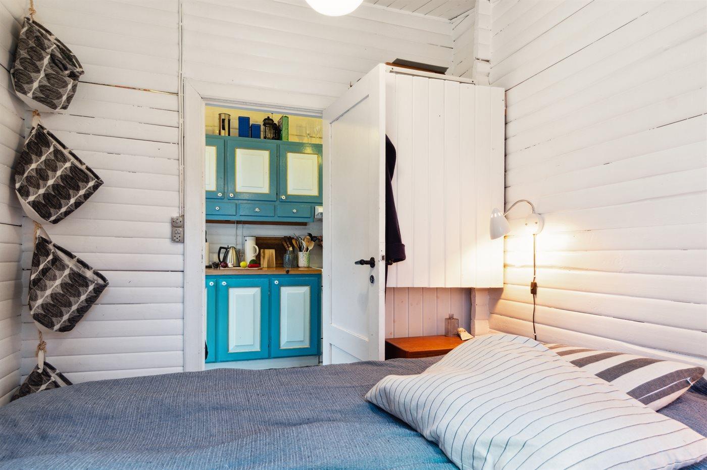 Das Haus ist hell und sommerlich eingerichtet mit viel Licht von den Fenstern mit Sprossen. Das Wohnzimmer und der Essbereich sind offen gestaltet und führen zur nach Süden ausgerichteten Holzterrasse und zum Garten. Die feine Küche ist gemütlich, funktional und respektiert die alte Geschichte des Hauses. Im Haus gibt es 2 Schlafzimmer, jedes mit 2 Schlafplätzen in einem Doppelbett und einem Etagenbett. Im Anbau, nur wenige Meter vom Haupthaus entfernt, gibt es 2 Doppelschlafsofas und insgesamt 4 Schlafplätze. Beachte, dass sich das Badezimmer mit Dusche in einem separaten Gebäude zwischen dem Haus und dem Anbau befindet.