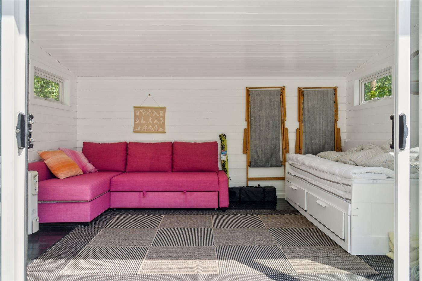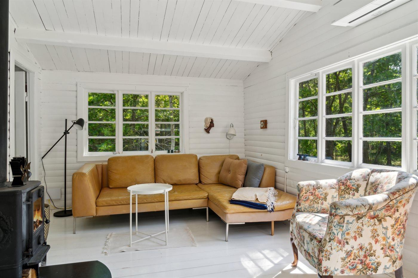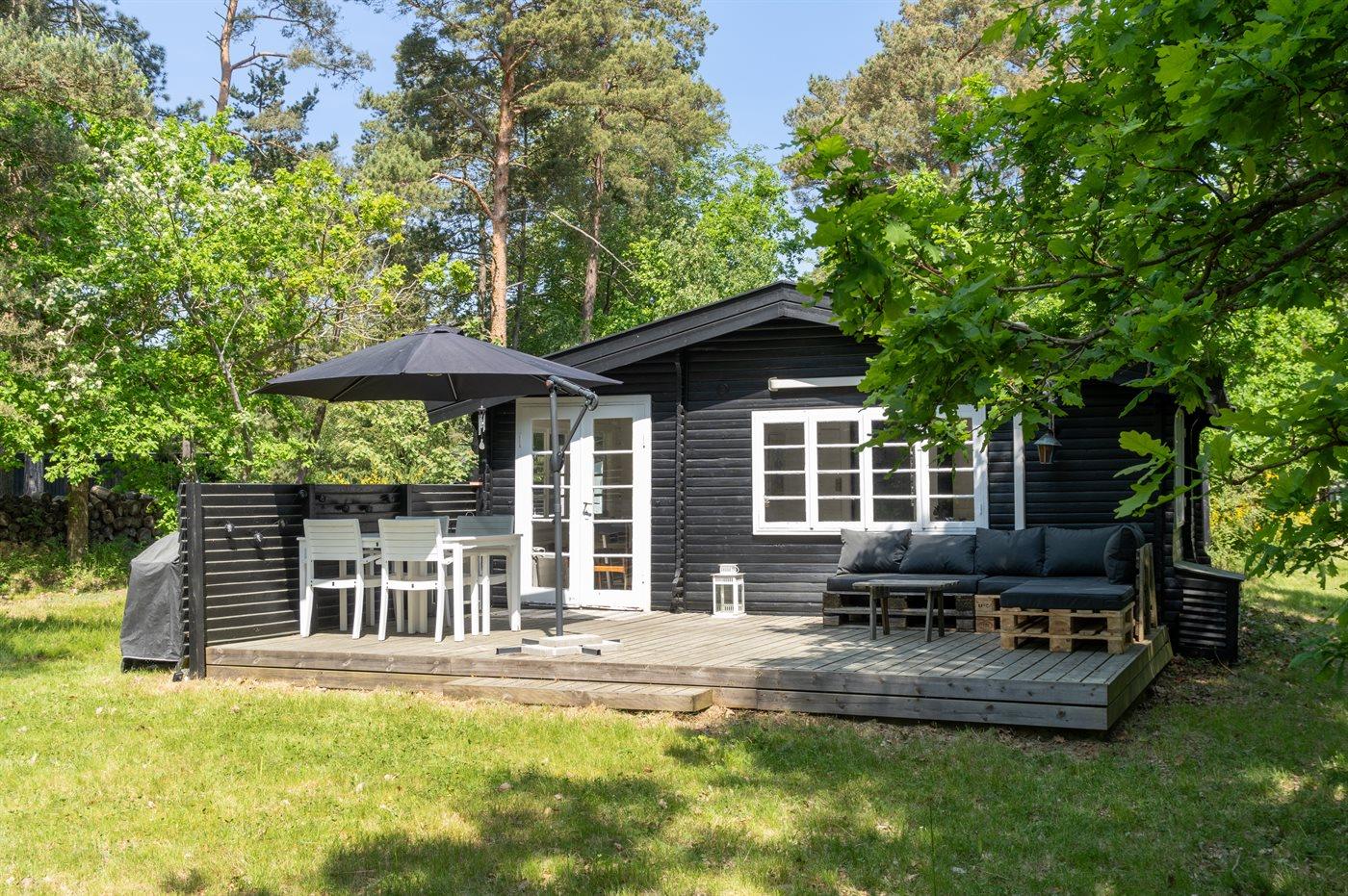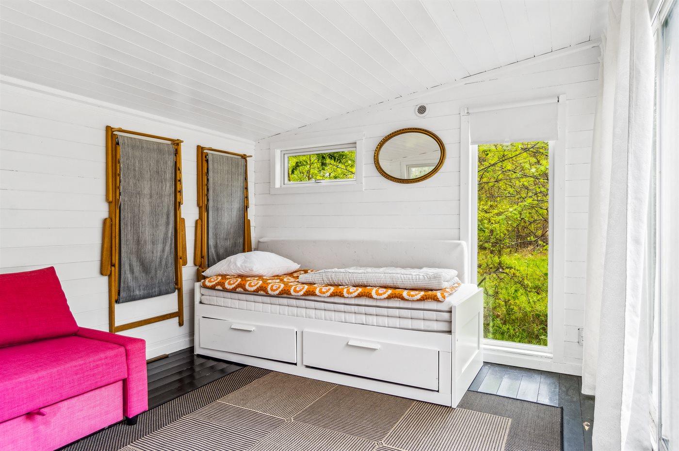 Das Haus ist hell und sommerlich eingerichtet mit viel Licht von den Fenstern mit Sprossen. Das Wohnzimmer und der Essbereich sind offen gestaltet und führen zur nach Süden ausgerichteten Holzterrasse und zum Garten. Die feine Küche ist gemütlich, funktional und respektiert die alte Geschichte des Hauses. Im Haus gibt es 2 Schlafzimmer, jedes mit 2 Schlafplätzen in einem Doppelbett und einem Etagenbett. Im Anbau, nur wenige Meter vom Haupthaus entfernt, gibt es 2 Doppelschlafsofas und insgesamt 4 Schlafplätze. Beachte, dass sich das Badezimmer mit Dusche in einem separaten Gebäude zwischen dem Haus und dem Anbau befindet.