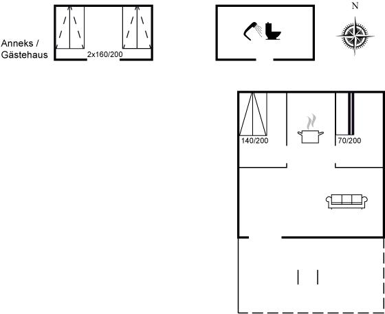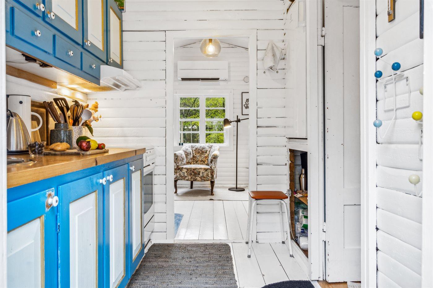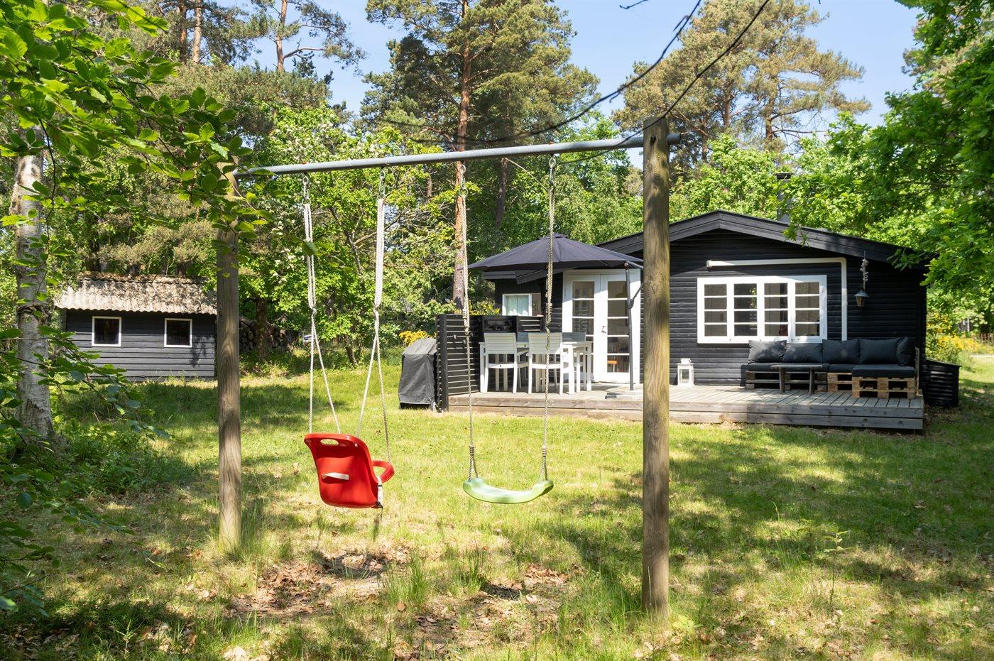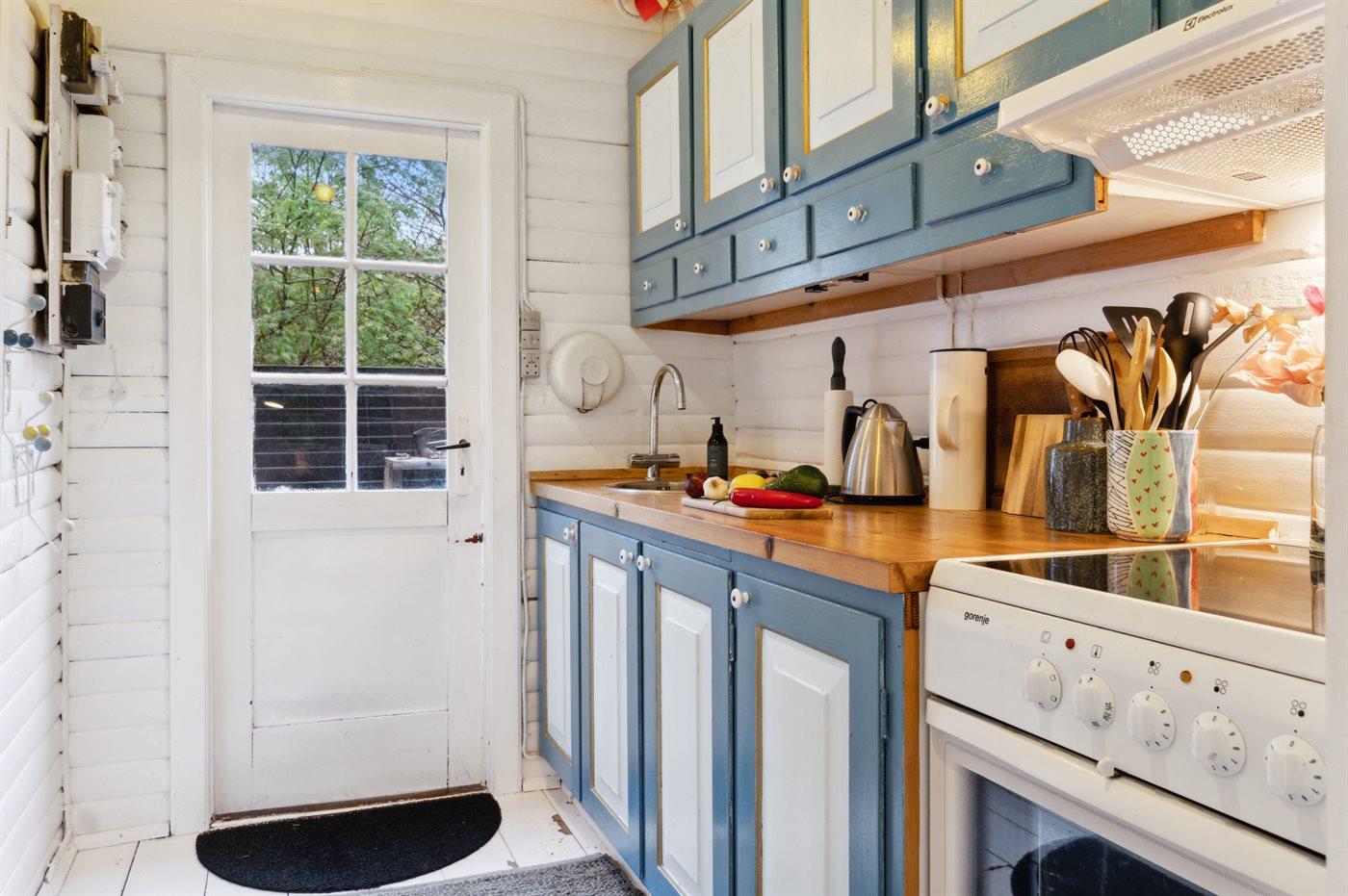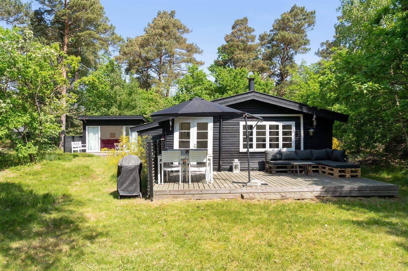 Das Haus ist hell und sommerlich eingerichtet mit viel Licht von den Fenstern mit Sprossen. Das Wohnzimmer und der Essbereich sind offen gestaltet und führen zur nach Süden ausgerichteten Holzterrasse und zum Garten. Die feine Küche ist gemütlich, funktional und respektiert die alte Geschichte des Hauses. Im Haus gibt es 2 Schlafzimmer, jedes mit 2 Schlafplätzen in einem Doppelbett und einem Etagenbett. Im Anbau, nur wenige Meter vom Haupthaus entfernt, gibt es 2 Doppelschlafsofas und insgesamt 4 Schlafplätze. Beachte, dass sich das Badezimmer mit Dusche in einem separaten Gebäude zwischen dem Haus und dem Anbau befindet.