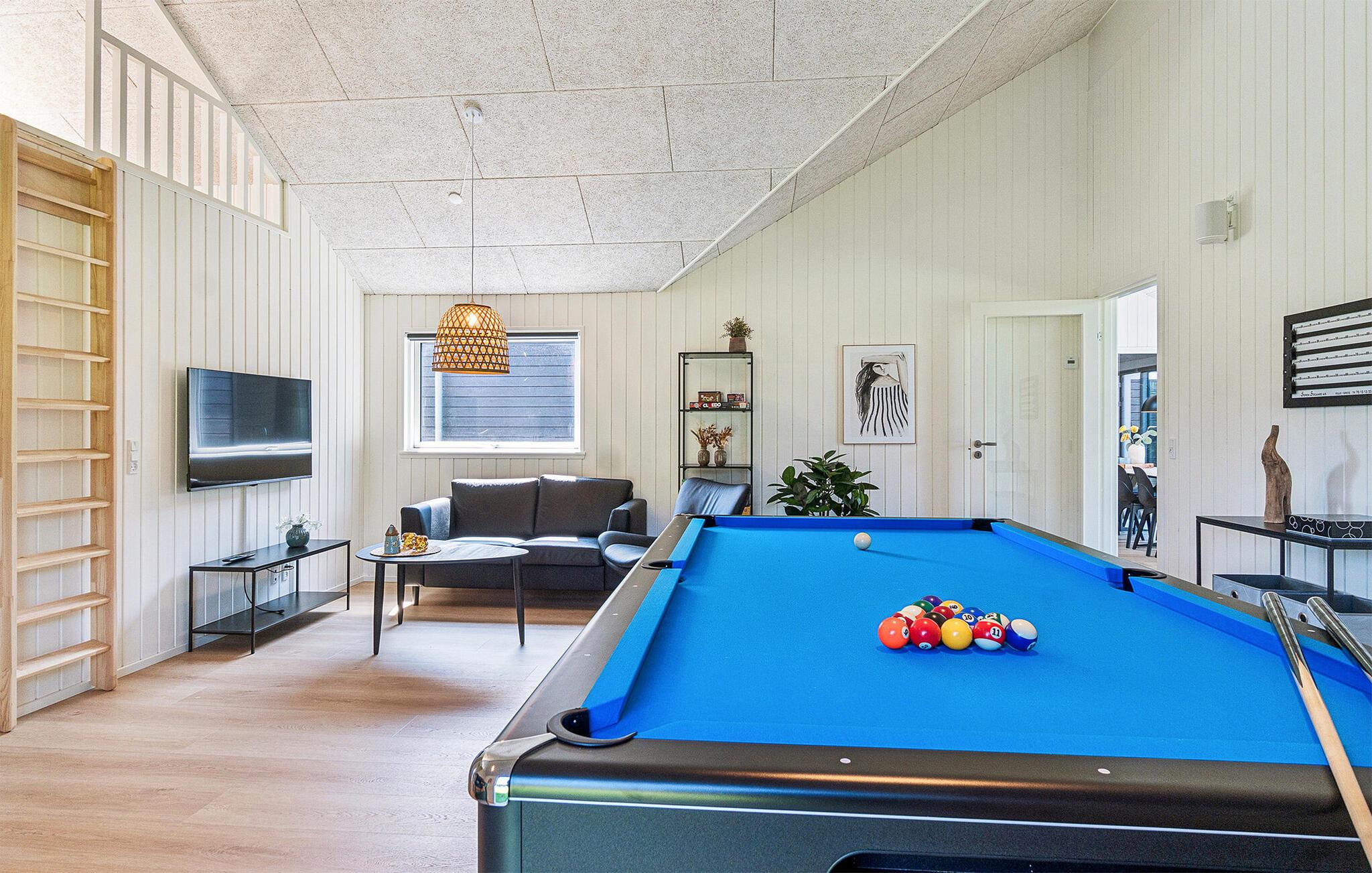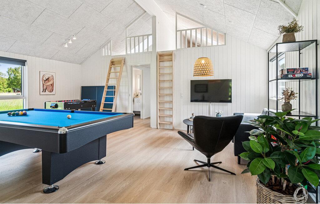 Ihr komfortables Ferienhaus an der Sejerø Bucht ist wie gemacht für eine größere Reisegruppe. Genießen Sie die ruhige Umgebung und die Nähe zum kinderfreundlichen Strand mit weichem Sand und flachen Uferzonen. Im Inneren Ihres Ferienhauses erwartet Sie ein offener Wohn- und Essbereich mit viel Platz für gemeinsame Mahlzeiten und gemütliche Abende. Kochen Sie zusammen, spielen Sie Karten oder lassen Sie den Tag am Kaminofen ausklingen. Erholen Sie sich in der Sauna, genießen Sie ein Bad im sprudelnden Außen-Whirlpool oder ziehen Sie ein paar Bahnen im Innenpool des Hauses, unabhängig vom Wetter. Der separate Aktivitätsraum mit Tischfußball, Billard und Dart sorgt für zusätzlichen Freizeitspaß. Draußen gibt es auch für Kinder viel zu entdecken, unter anderem ein Trampolin und eine Schaukel.