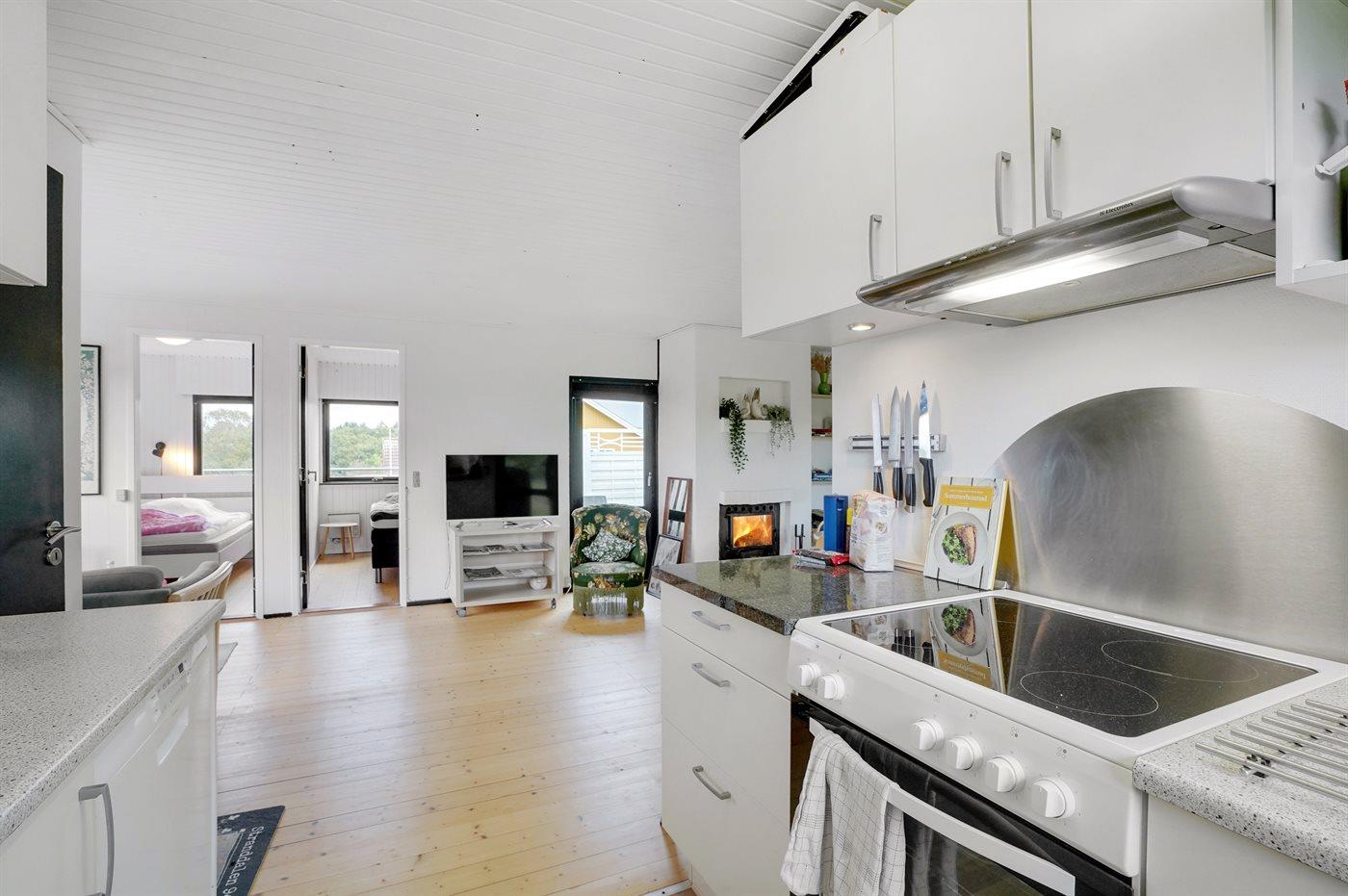 Die Küche ist mit Kühlschrank ausgestattet. Außerdem gibt es 4 Keramik-Kochfelder, Umluftofen sowie Geschirrspüler.