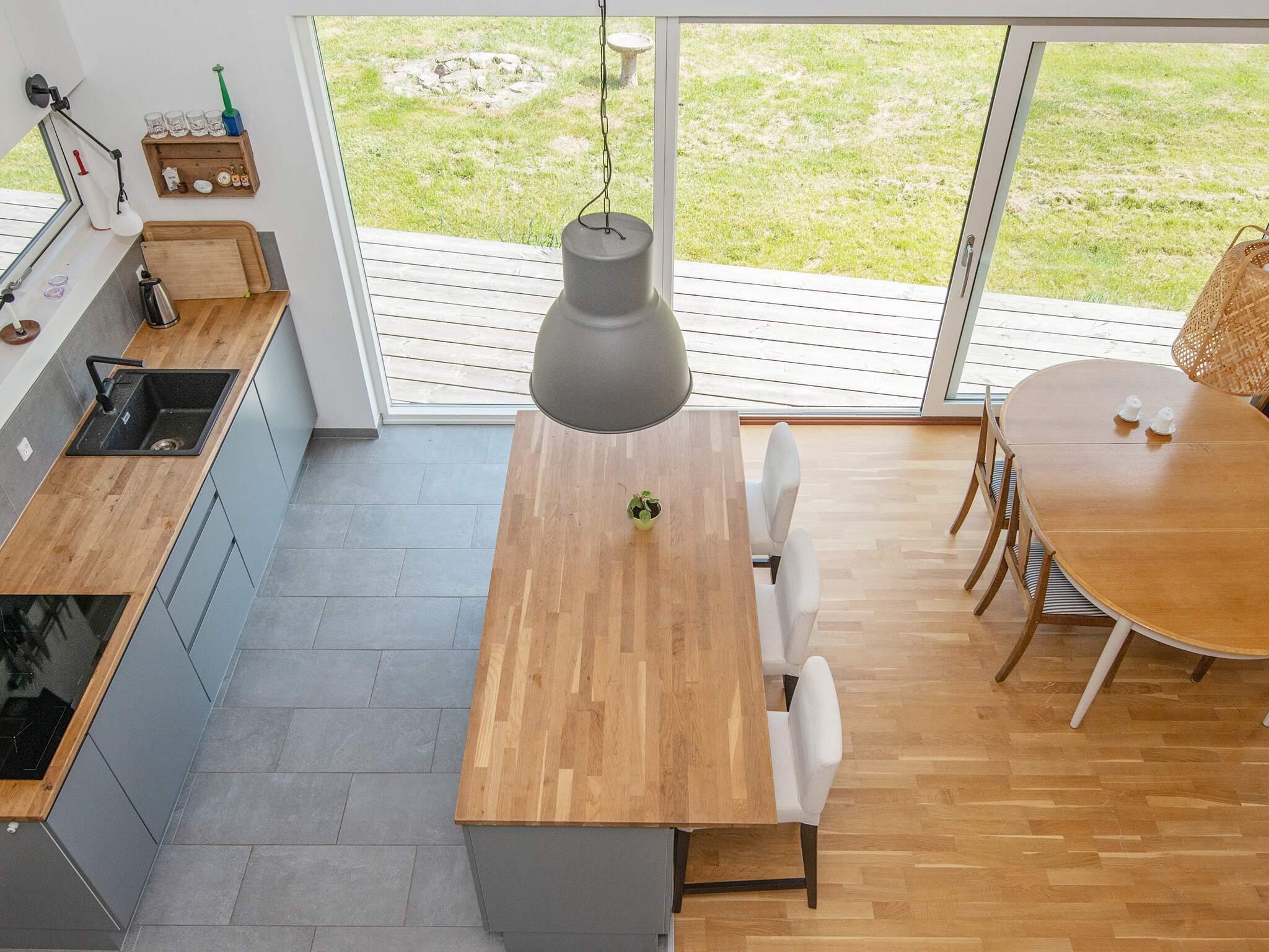 Die Küche ist offen gestaltet und in den Wohnbereich integriert – ideal für ein Familienleben. Es gibt zwei Badezimmer, eines davon mit Zugang von der großen, schönen Holzterrasse. Gleiches gilt für eines der Schlafzimmer im Haus. Insgesamt stehen drei schöne Schlafzimmer zur Auswahl. TV ohne Senderempfang aber mit Chromecast zum Streamen eigener Anbieter.