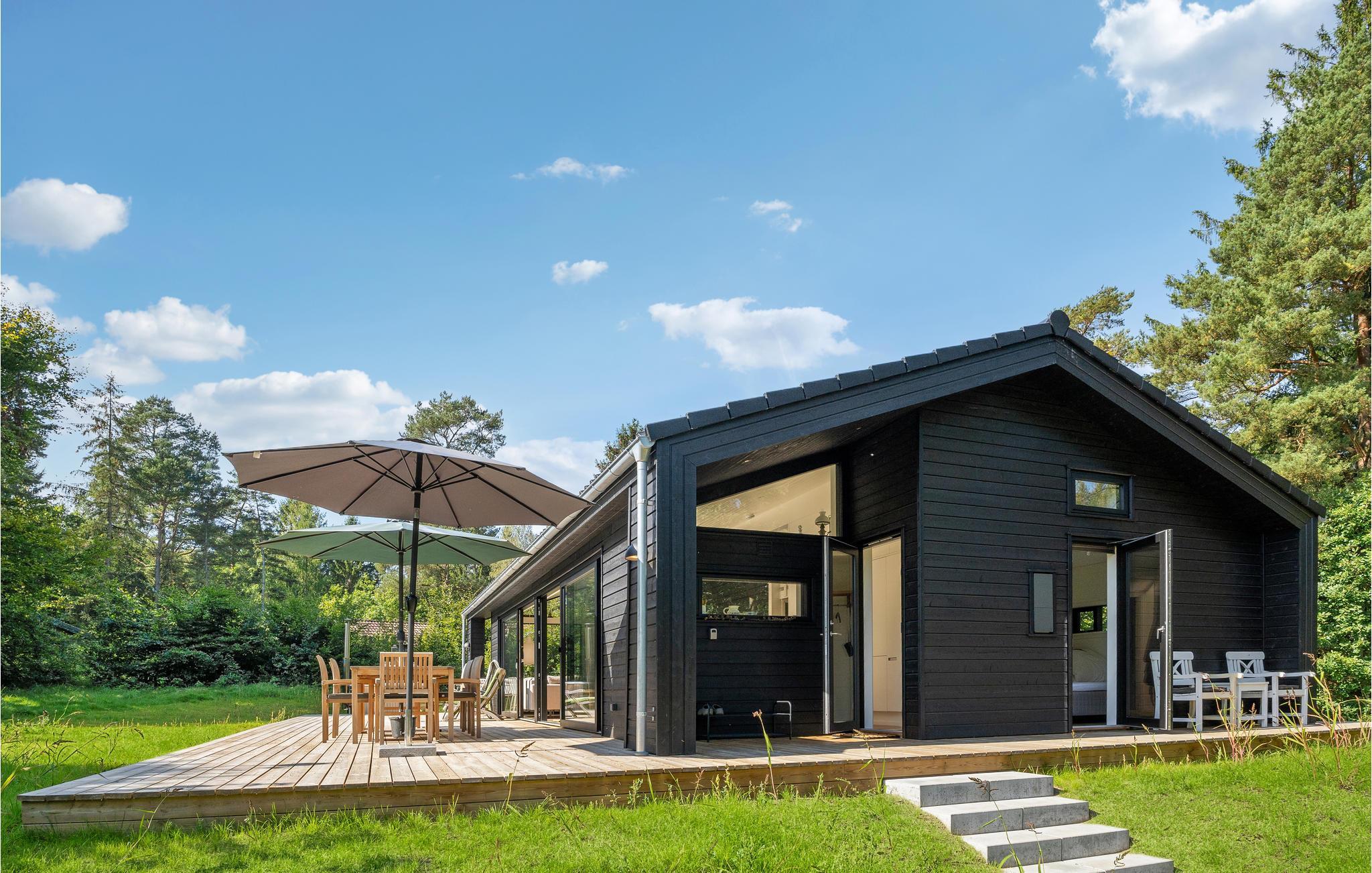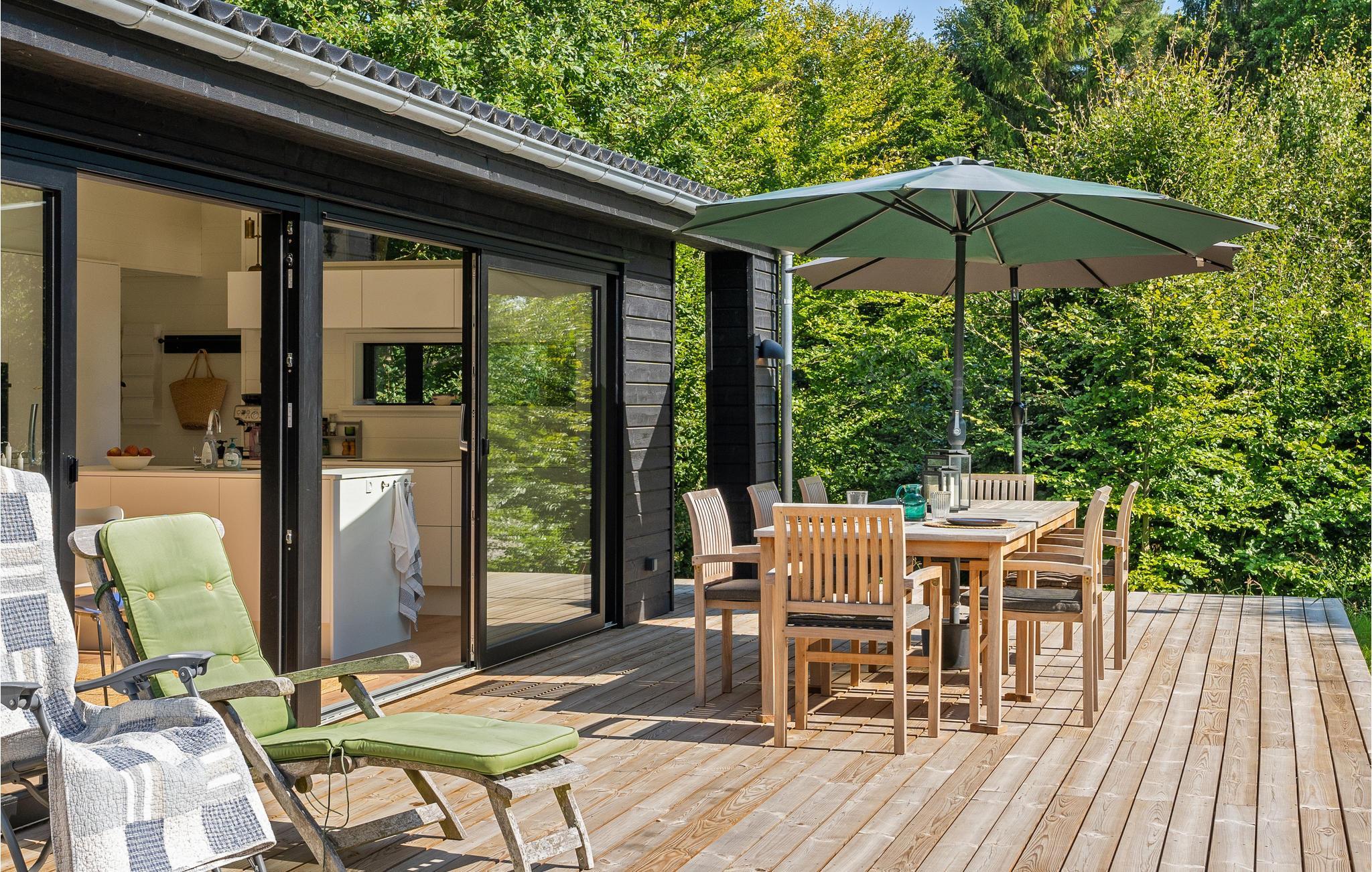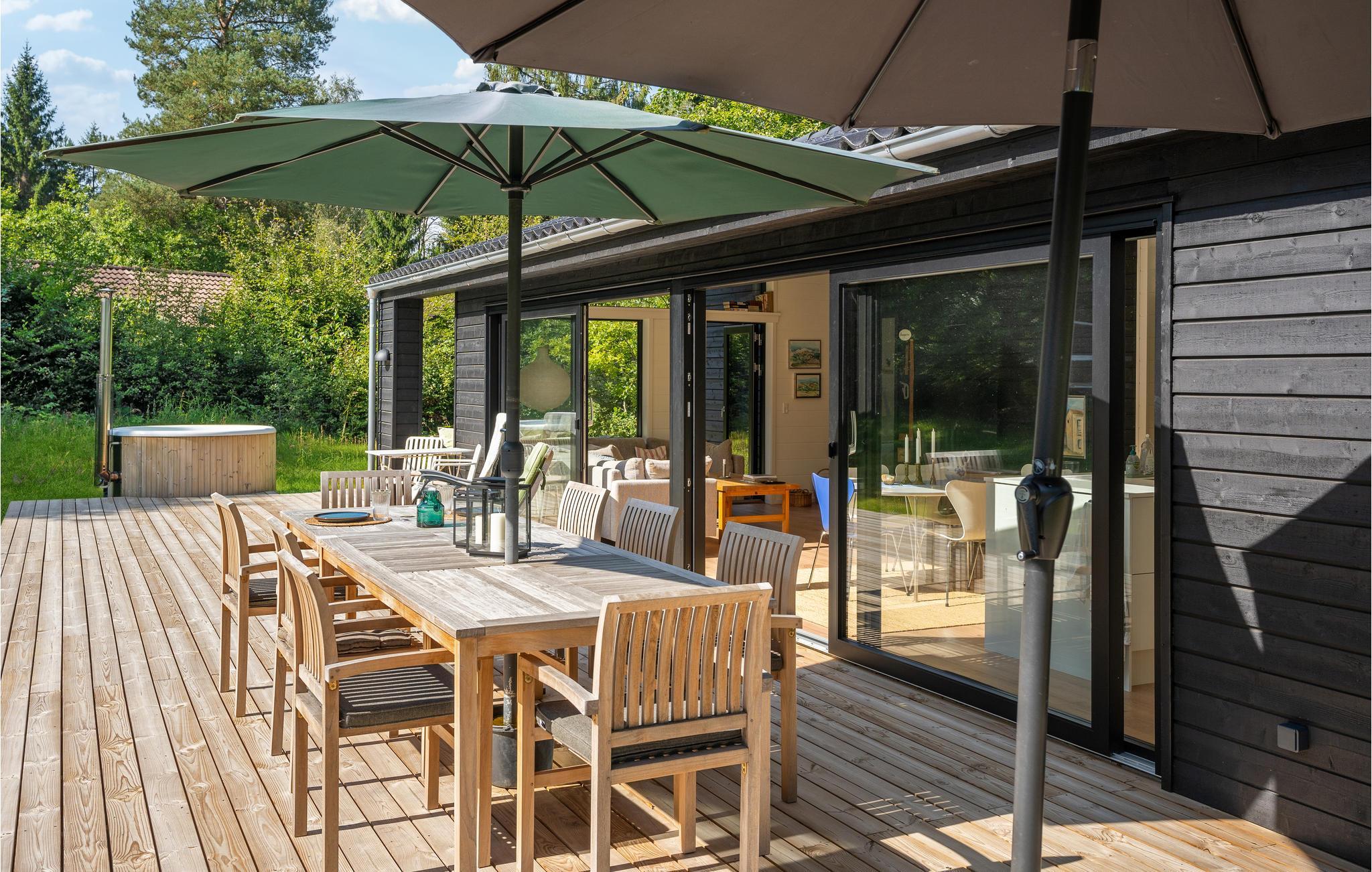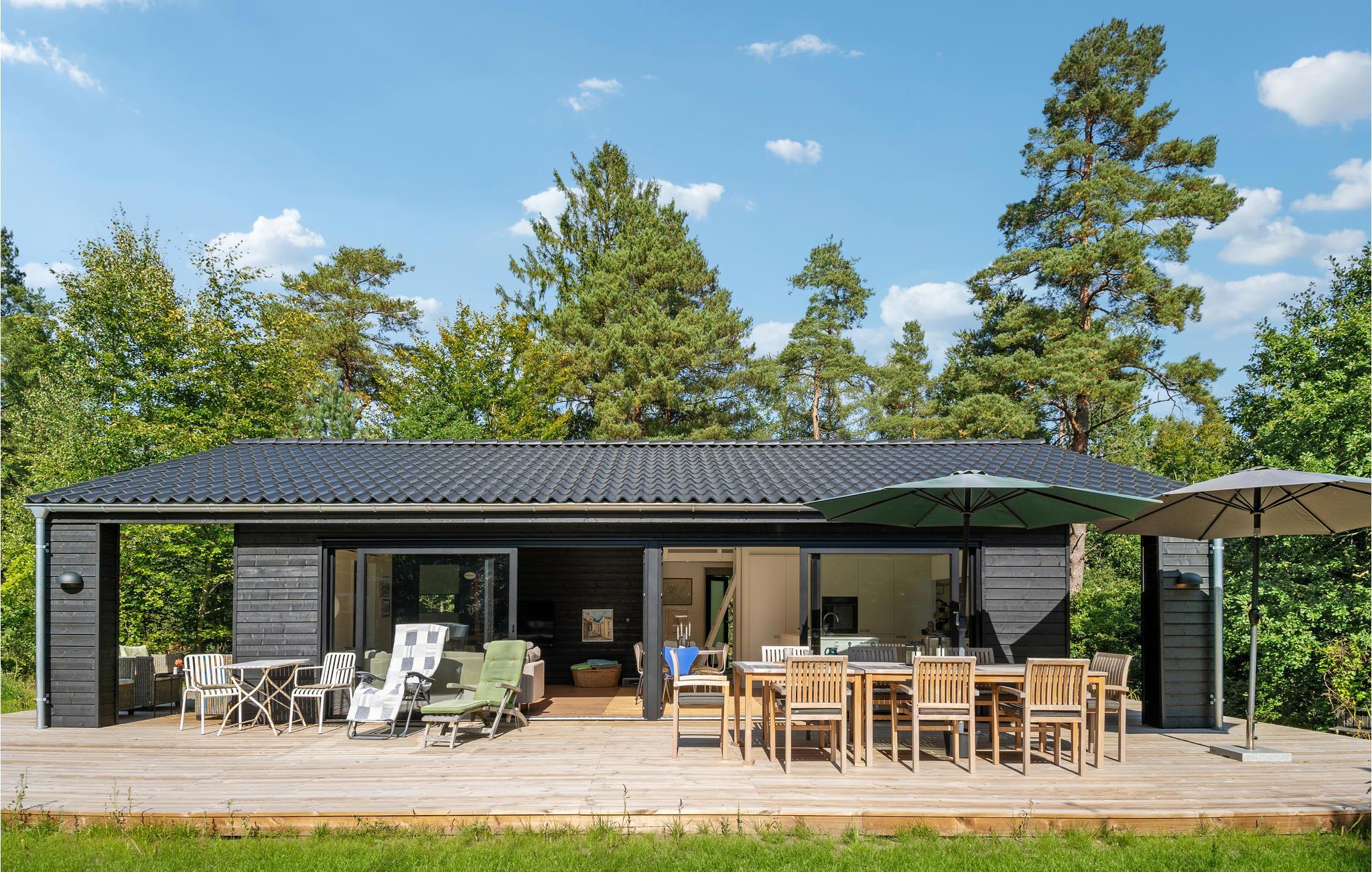 Modernes Ferienhaus am Thorsø See mit finnischem Holzbad, großer Terrasse und Blick in den Garten.