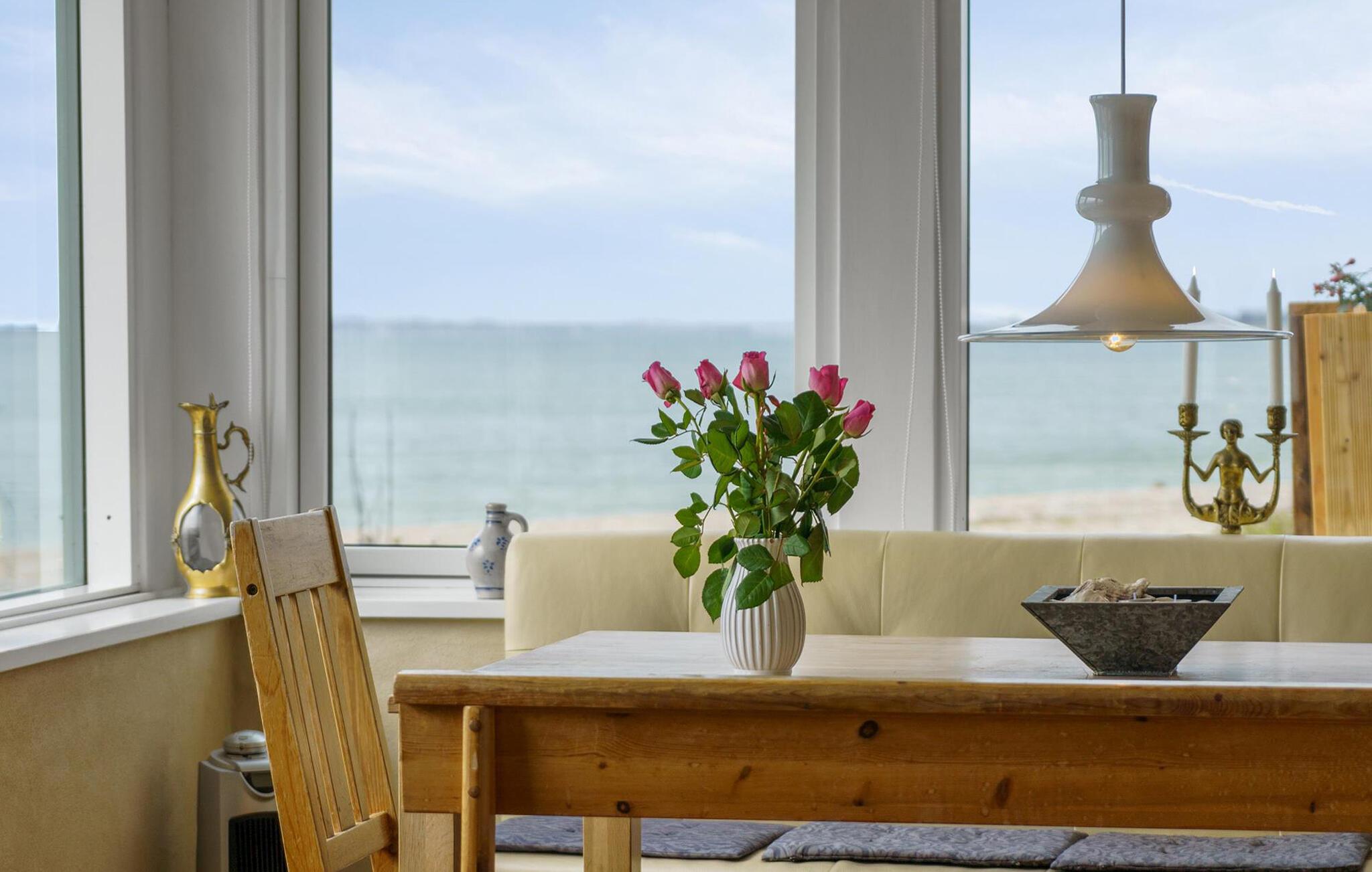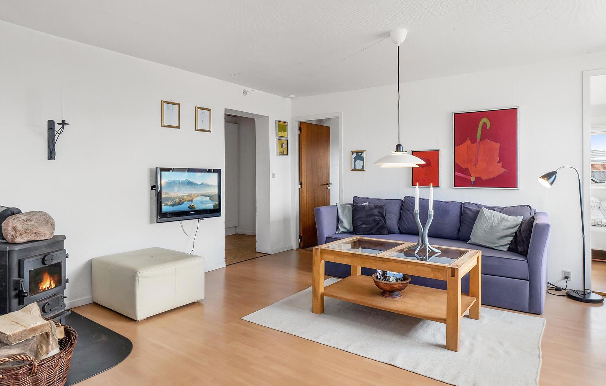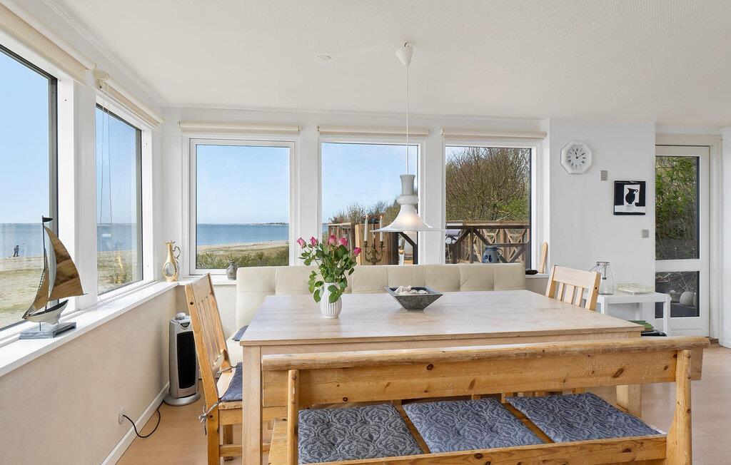Erleben Sie ruhige Tage in Ihrem Ferienhaus, das sich ideal für erholsame Stunden mit der Familie eignet. In direkter Strandlage gelegen, genießen Sie hier eine offene Atmosphäre mit herrlichem Ausblick auf den Fjord. Betreten Sie den geschmackvoll eingerichteten Wohnbereich mit Kaminofen, gemütlicher Sofaecke und Fernseher, ideal zum Abschalten nach einem aktiven Tag. Der große Essplatz ist das Herzstück des Hauses. Hier wird jede Mahlzeit zum Erlebnis mit Panoramablick auf das Wasser.