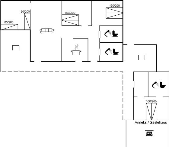 Das Haus hat 3 Schlafzimmer mit je zwei Schlafplätzen, das Gästehaus 1 Schlafzimmer mit zwei Schlafplätzen.