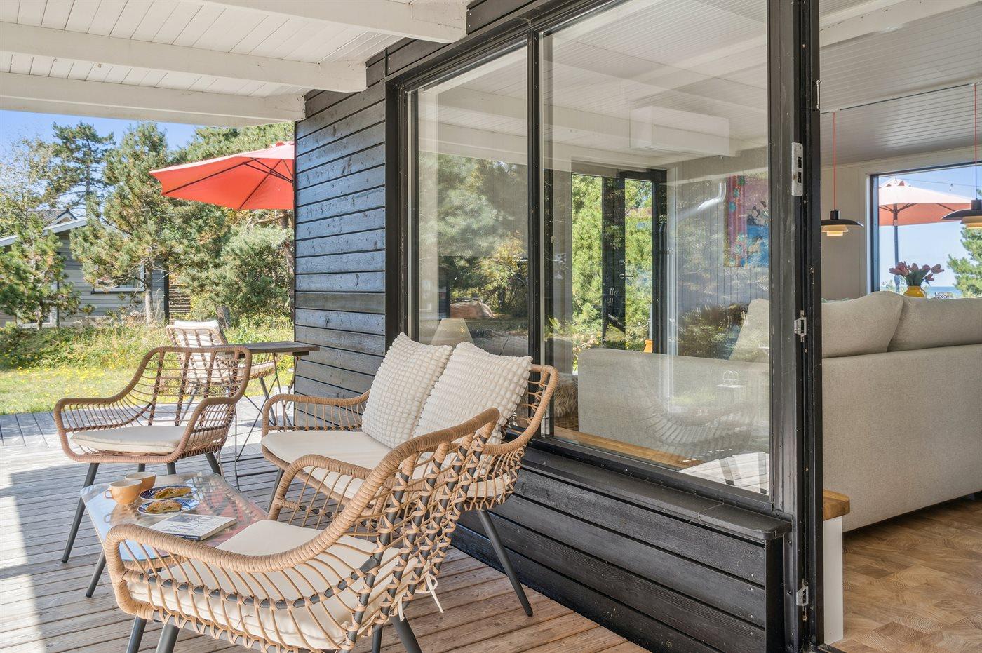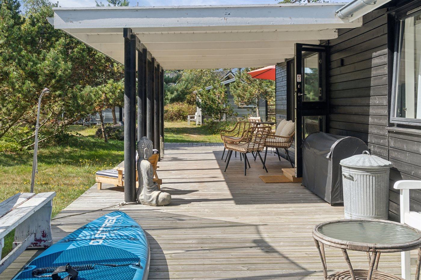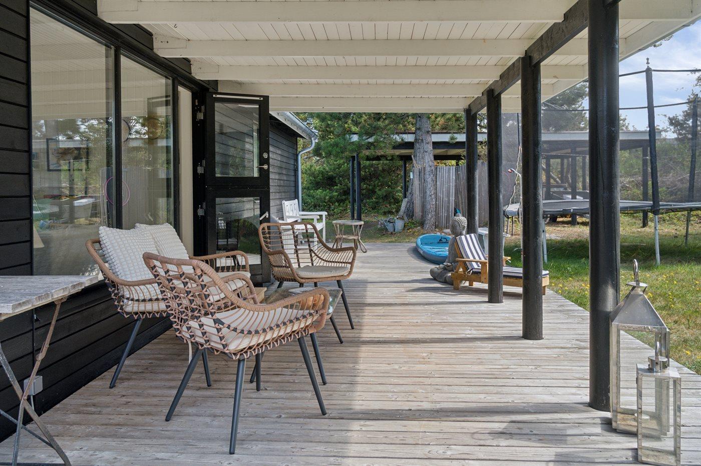 Das Haus besteht aus einem offenen Wohnbereich mit Wohnzimmer, Essplatz und Küche in einem. Von hier aus gelangst du direkt auf die große Holzterrasse, die sich über drei Seiten des Hauses erstreckt. Auf der Südseite findest du eine große überdachte Terrasse, auf der du Schatten und Windschutz findest.