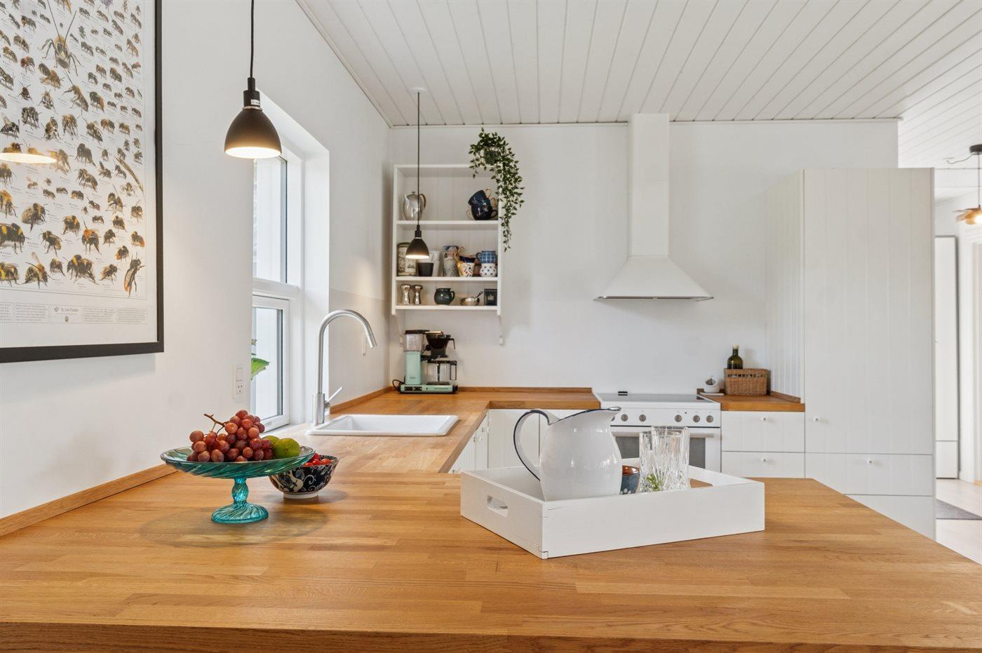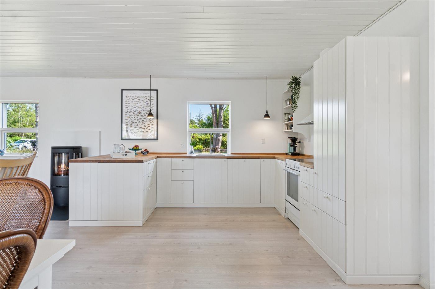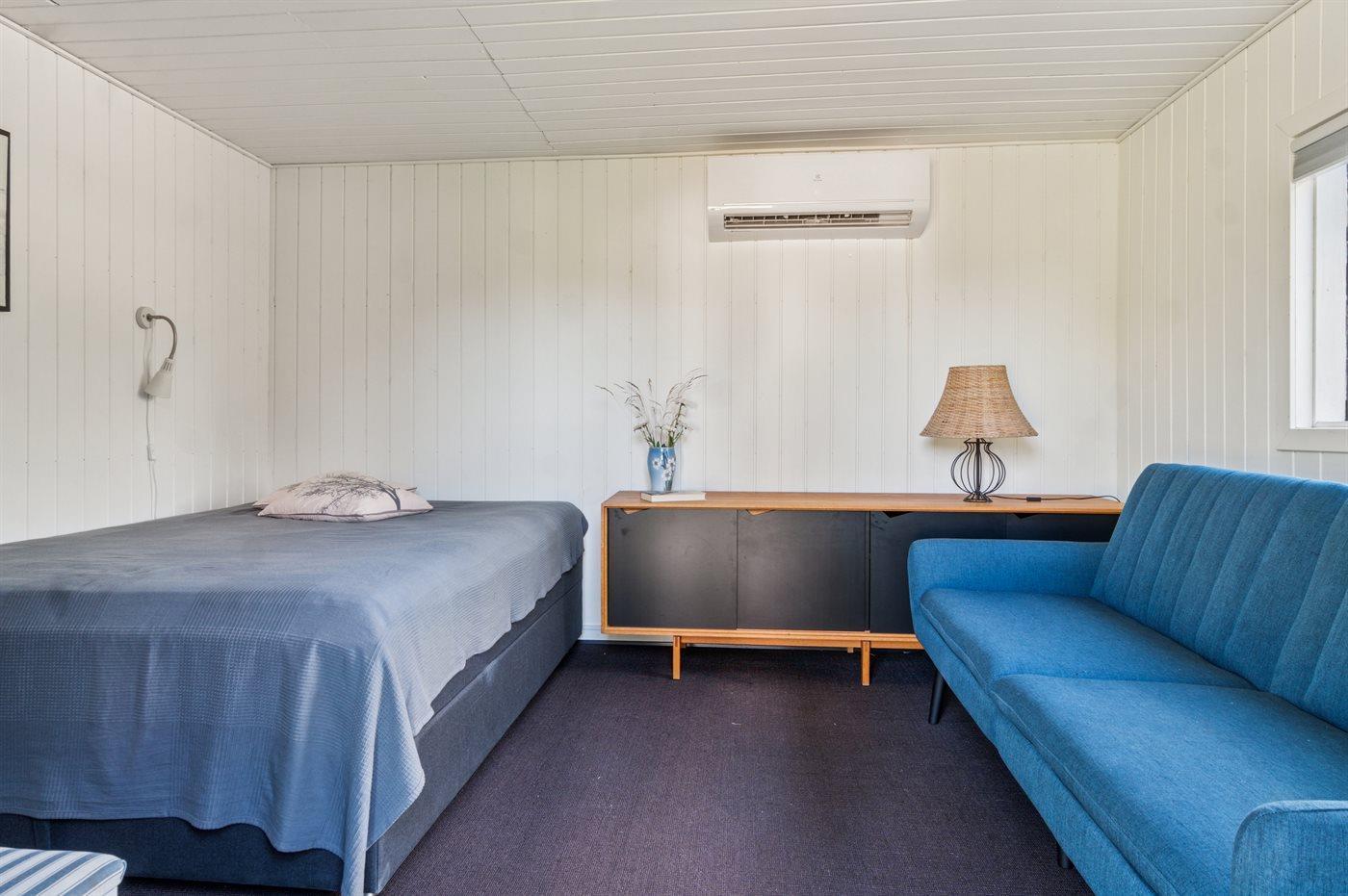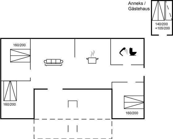 Das Haus verfügt über eine schöne Wohnküche in offener Verbindung mit dem Wohnzimmer, von dem aus man direkten Zugang zur großen Terrasse hat. Im Haupthaus befinden sich drei Schlafzimmer, die alle mit Doppelbetten ausgestattet sind. Im Annex gibt es ebenfalls ein Doppelbett sowie ein Schlafsofa (Maße: 105x200 cm). Das Badezimmer ist mit Dusche und Fußbodenheizung ausgestattet und zusätzlich gibt es eine Waschmaschine und einen Trockner.