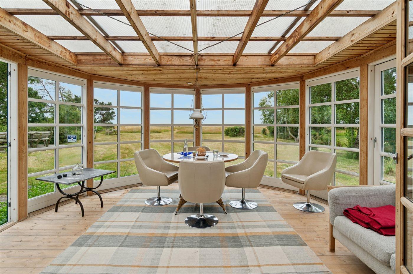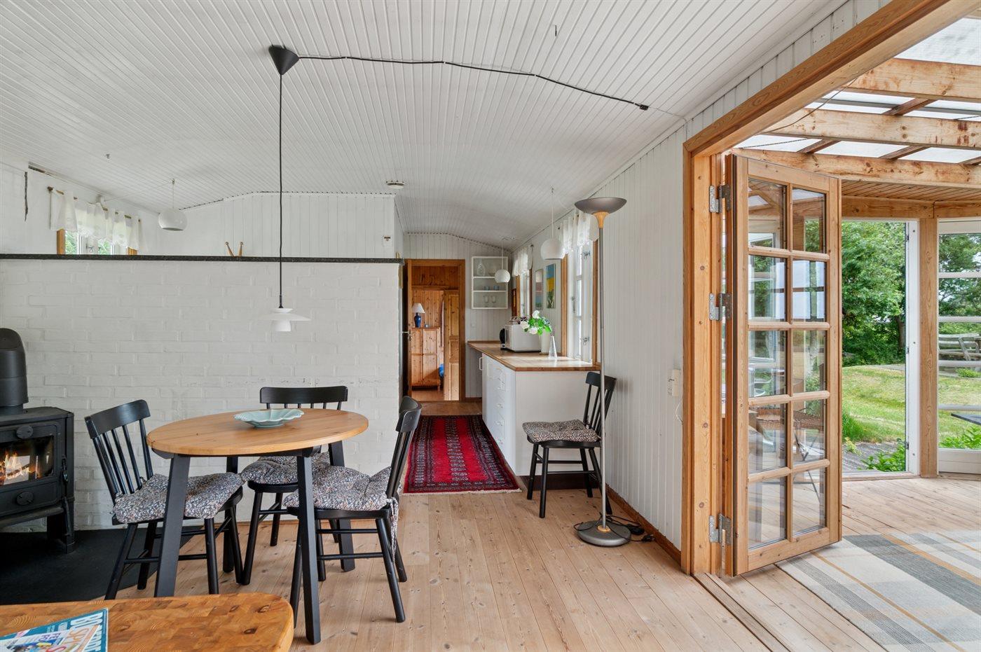 Das Haus verfügt über ein gemütliches Wohnzimmer mit Essbereich, das direkt an die Küche angrenzt. Von hier aus gelangst du in einen hellen, nach Süden ausgerichteten Wintergarten und auf eine schöne Terrasse.