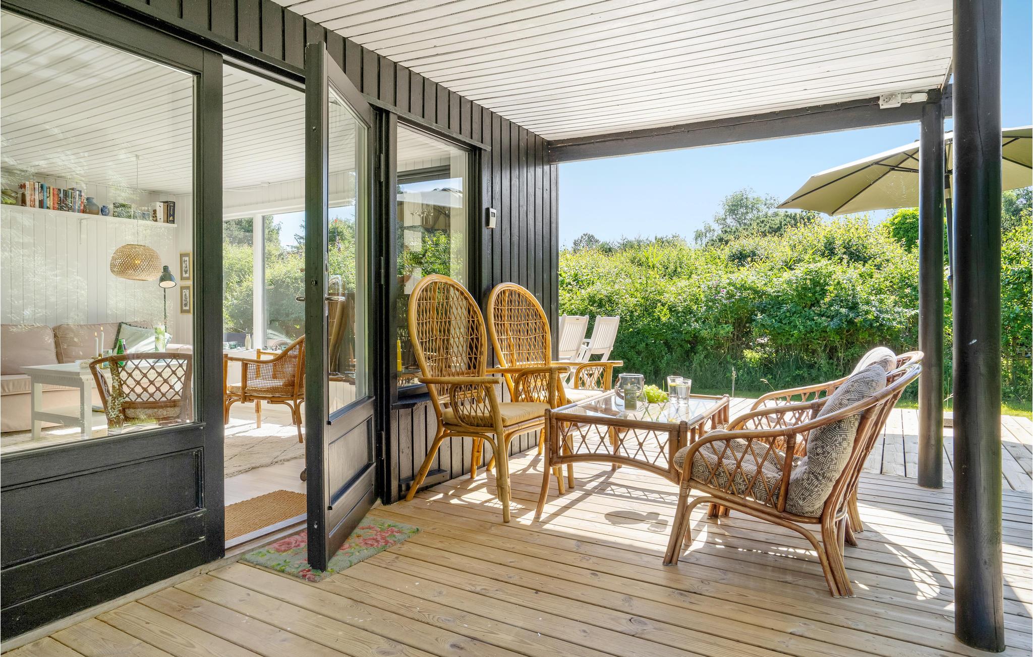 Stilvolles Holzferienhaus nahe Strand mit großer Terrasse und Kaminofen zum Entspannen in der Natur.