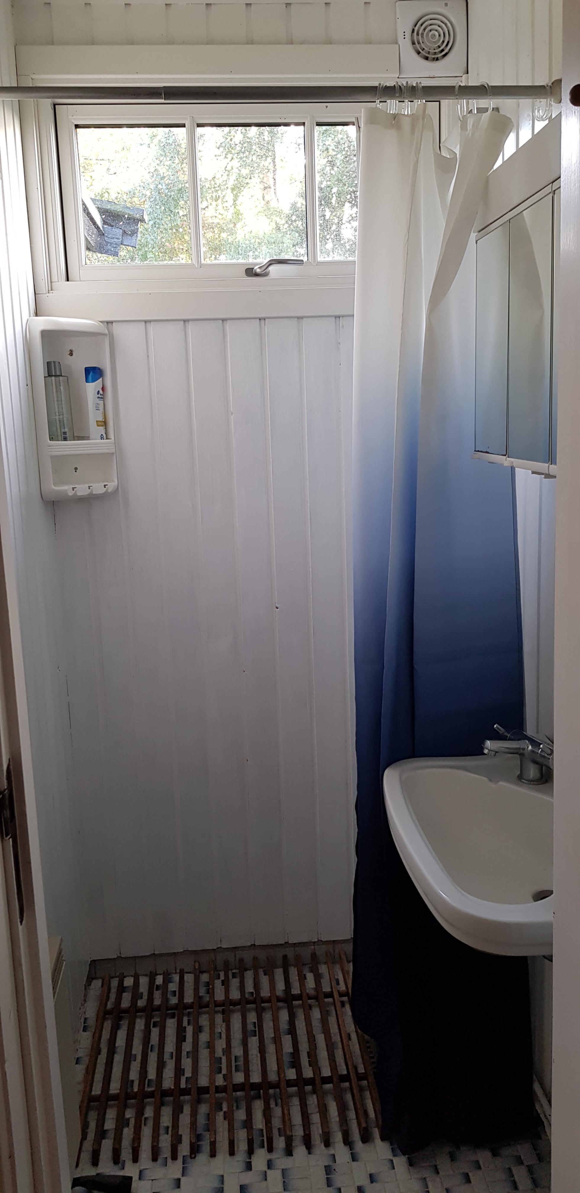 Die ältere Küche funktioniert genauso gut wie die ältere, separate Toilette und das Duschbad. Es gibt auch eine Waschmaschine.