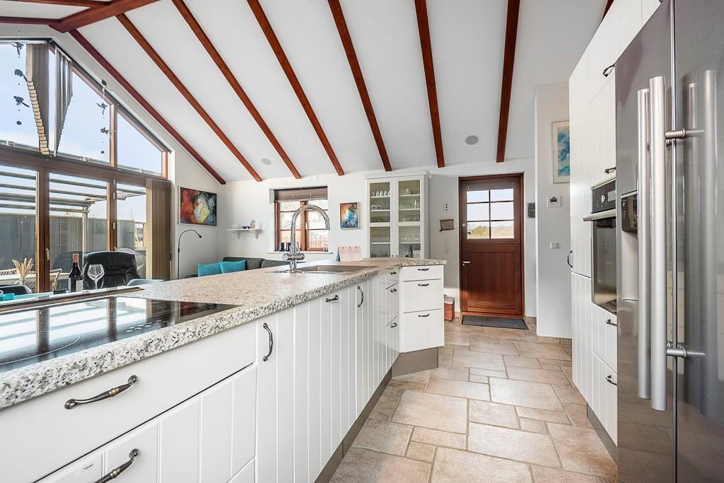 Wenn du das Ferienhaus betrittst, empfängt dich ein warmer und einladender Raum, in dem Wohnküche und Wohnzimmer zu einem großen Aufenthaltsbereich verschmelzen. Das Licht fällt schön durch die großen Fensterfronten und schafft eine helle und luftige Atmosphäre, die sowohl zu Gemütlichkeit als auch zu gemeinsamen Stunden einlädt. Hier lässt sich leicht vorstellen, wie ruhige Morgen beginnen, während du mit einer Tasse Kaffee am Esstisch sitzt und das Haus langsam zum Leben erwacht.