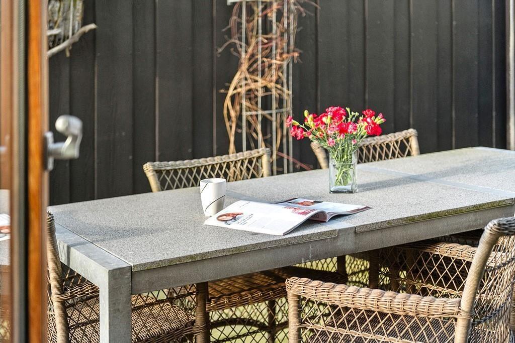 Die vielen Terrassen des Ferienhauses laden dazu ein, den Lauf der Sonne über den Tag zu verfolgen und immer einen Platz zu finden, der zur Stimmung passt. Wenn die großen Türen zur Terrasse vollständig geöffnet werden, verschwindet die Grenze zwischen drinnen und draußen, und das Haus wirkt wie eine große, zusammenhängende Oase. Die Markise über der Terrasse spendet an warmen Tagen Schatten, sodass du das Leben im Freien entspannt genießen kannst, ohne nach drinnen gehen zu müssen.