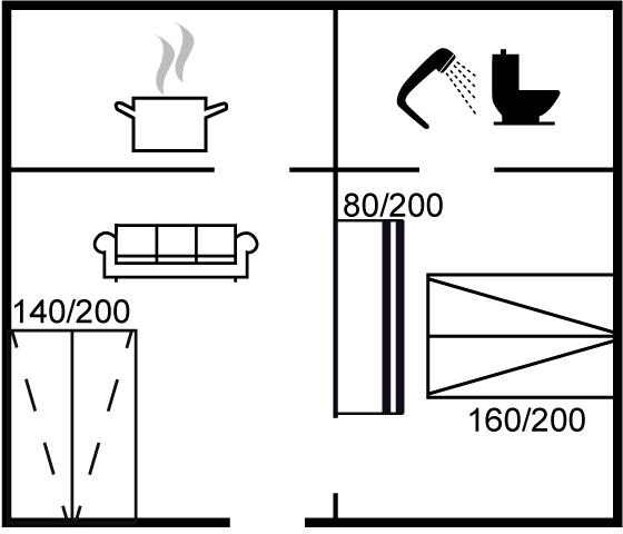 Es gibt einen Schlafraum. 2 Schlafplätze in einem Doppelbett. 2 Schlafplätze in einem Etagenbett. 2 Schlafplätze auf einer Doppelschlafcouch. 2 von diesen Schlafplätzen befinden sich im Wohnzimmer. Ferner steht ein Kinderbett zur Verfügung.