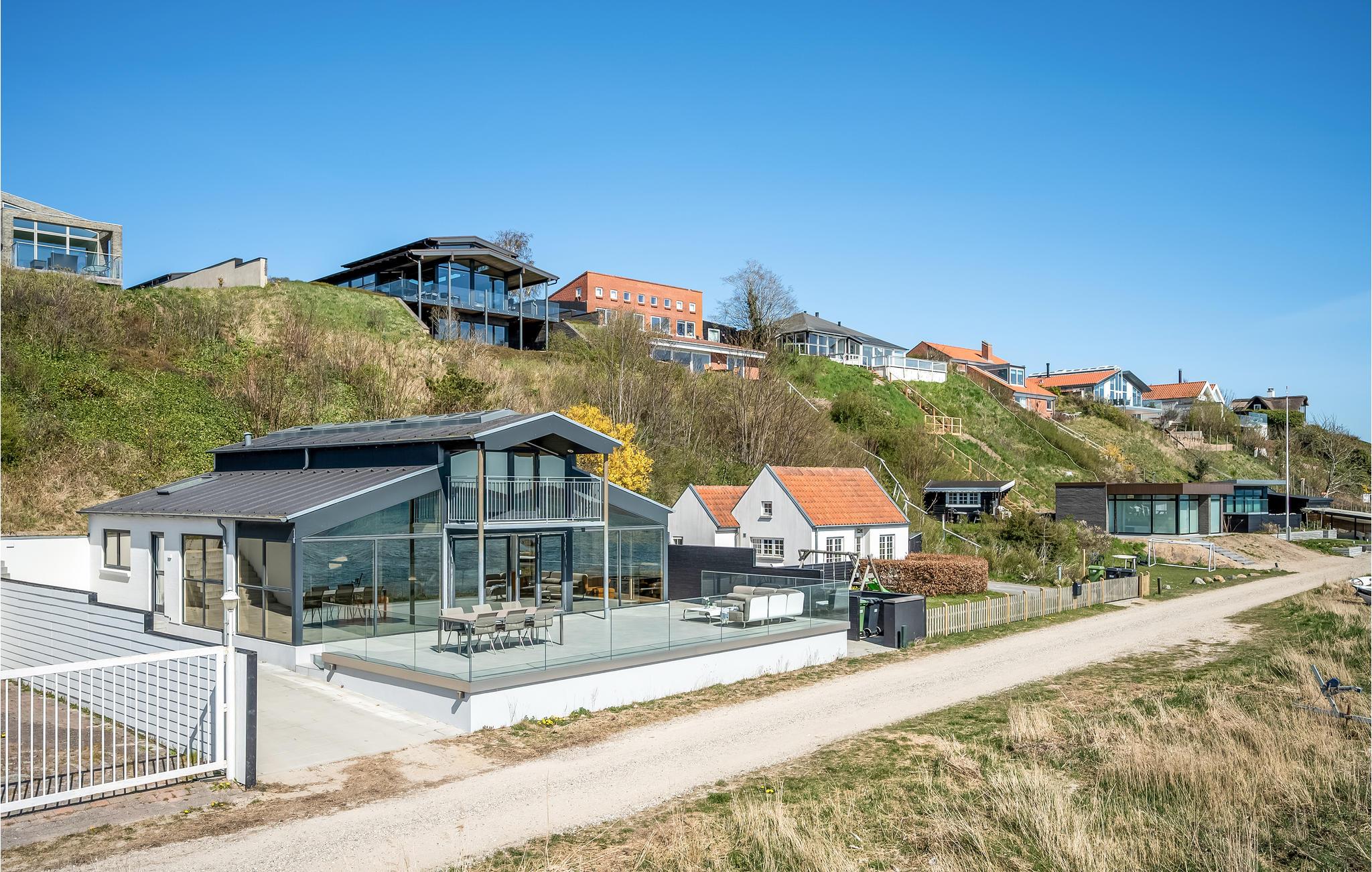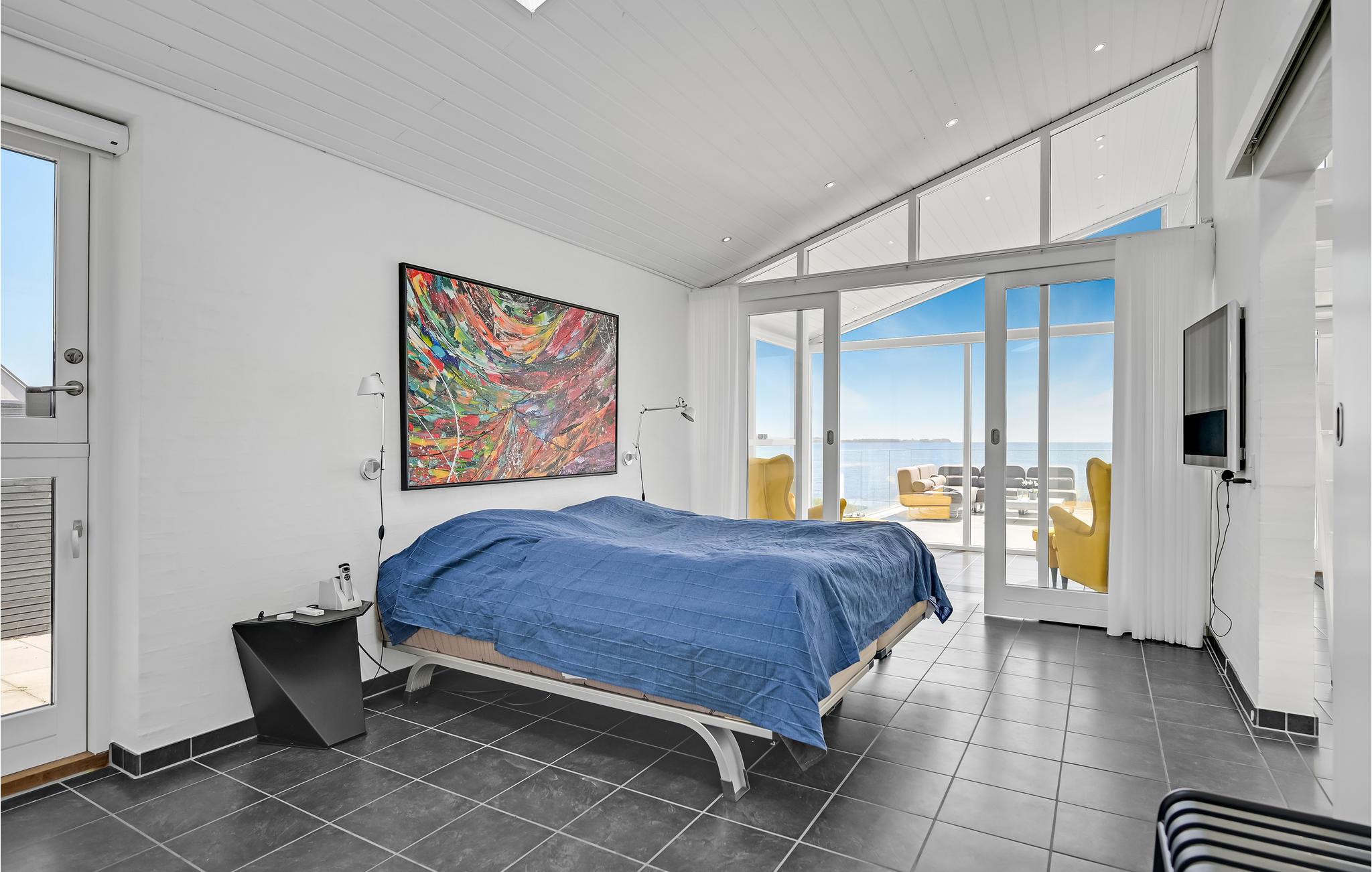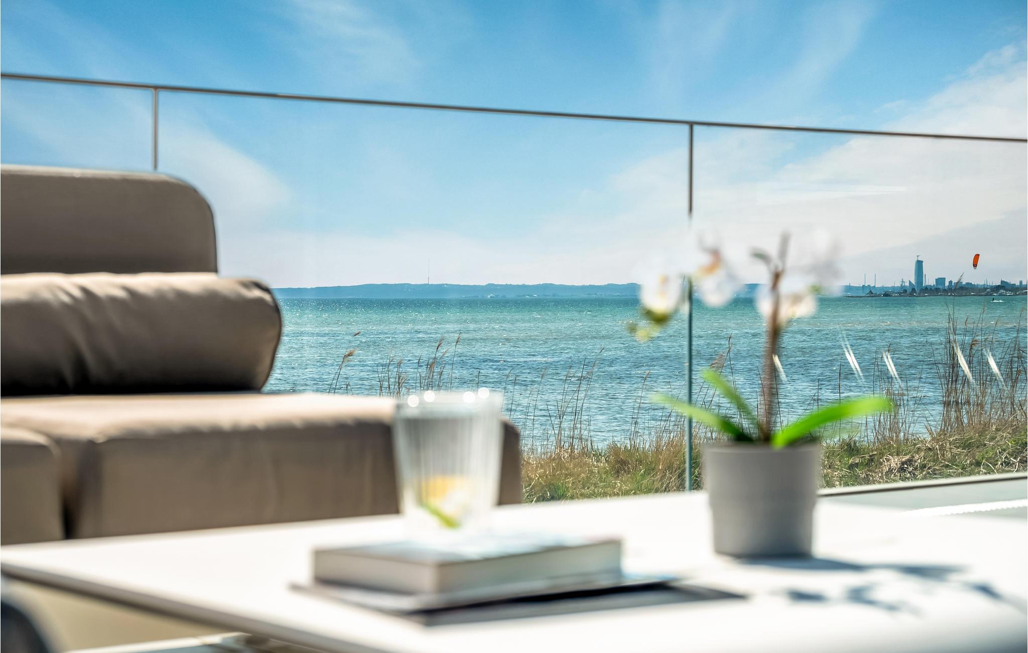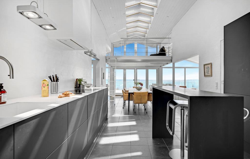 Treten Sie ein in ein besonders modernes Ferienhaus mit geräumigem Wohnraum und großzügiger Terrasse, die Ihnen einen atemberaubenden Meerblick bietet. Hier können Sie es sich bei wärmendem Kamin und Fußbodenheizung mit einem Gläschen Wein im Wohnraum gemütlich machen. Die hohe Decke und spannende Konstruktion dieser bietet Ihnen genug Raum zum Atmen und ebenso ein geräumiges Gefühl. Dank der großen Fensterfronten gelangt unglaublich viel Licht in den Raum, welches das freundliche Flair noch etwas verstärkt. Auf der offenen Terrasse mit Gartenmöbeln und Grill lässt es sich wunderbar bei einem Grillabend oder einem köstlichen Frühstück aushalten.