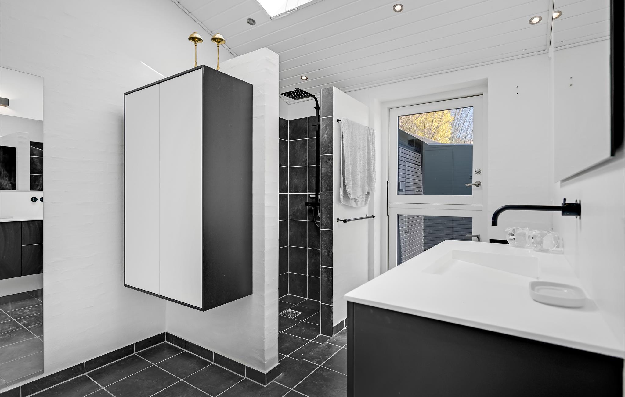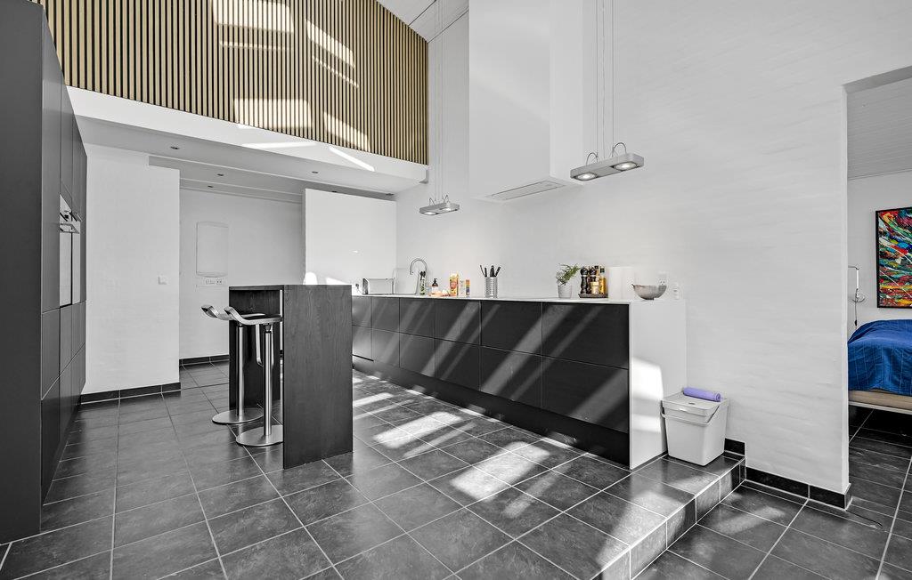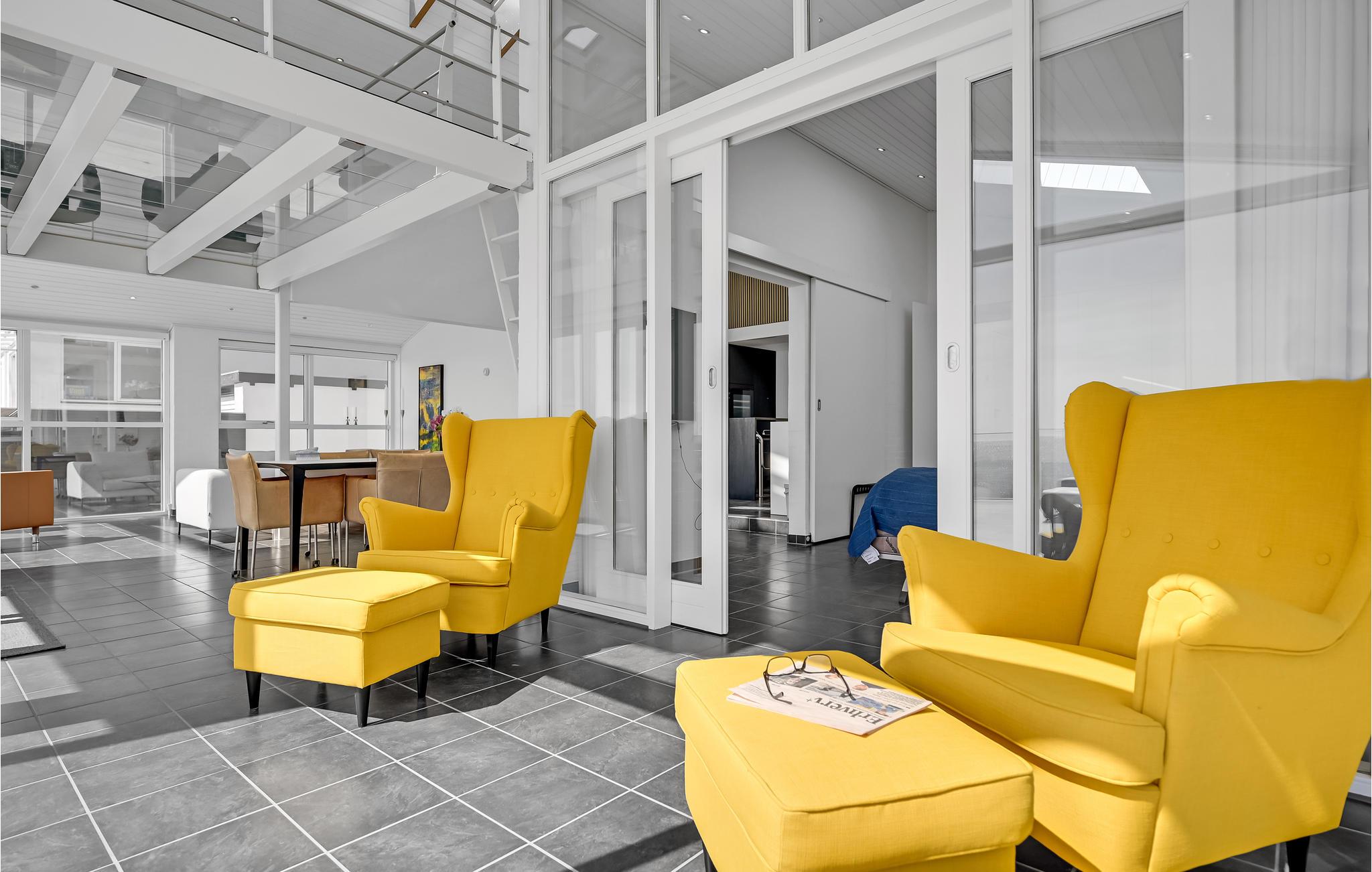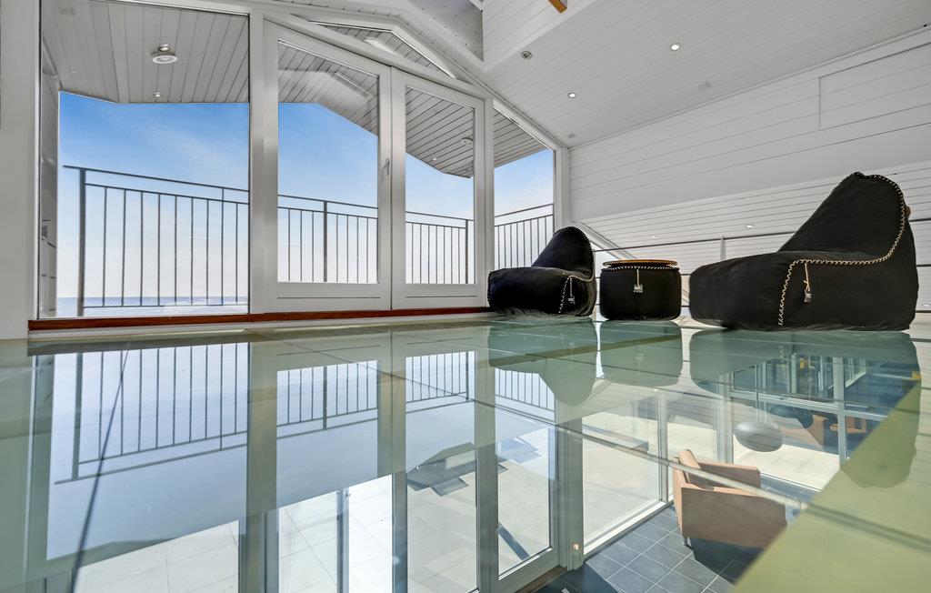 Treten Sie ein in ein besonders modernes Ferienhaus mit geräumigem Wohnraum und großzügiger Terrasse, die Ihnen einen atemberaubenden Meerblick bietet. Hier können Sie es sich bei wärmendem Kamin und Fußbodenheizung mit einem Gläschen Wein im Wohnraum gemütlich machen. Die hohe Decke und spannende Konstruktion dieser bietet Ihnen genug Raum zum Atmen und ebenso ein geräumiges Gefühl. Dank der großen Fensterfronten gelangt unglaublich viel Licht in den Raum, welches das freundliche Flair noch etwas verstärkt. Auf der offenen Terrasse mit Gartenmöbeln und Grill lässt es sich wunderbar bei einem Grillabend oder einem köstlichen Frühstück aushalten.