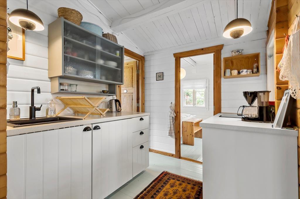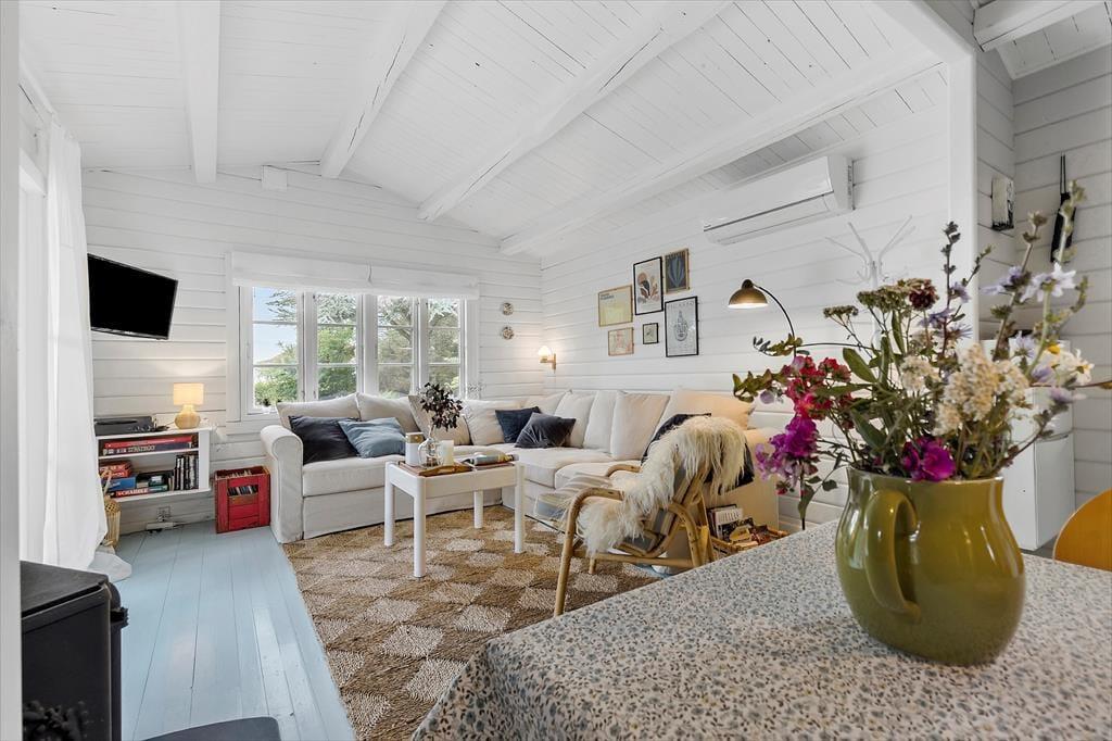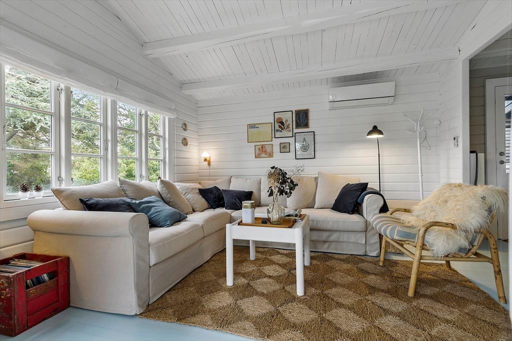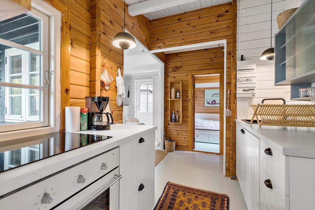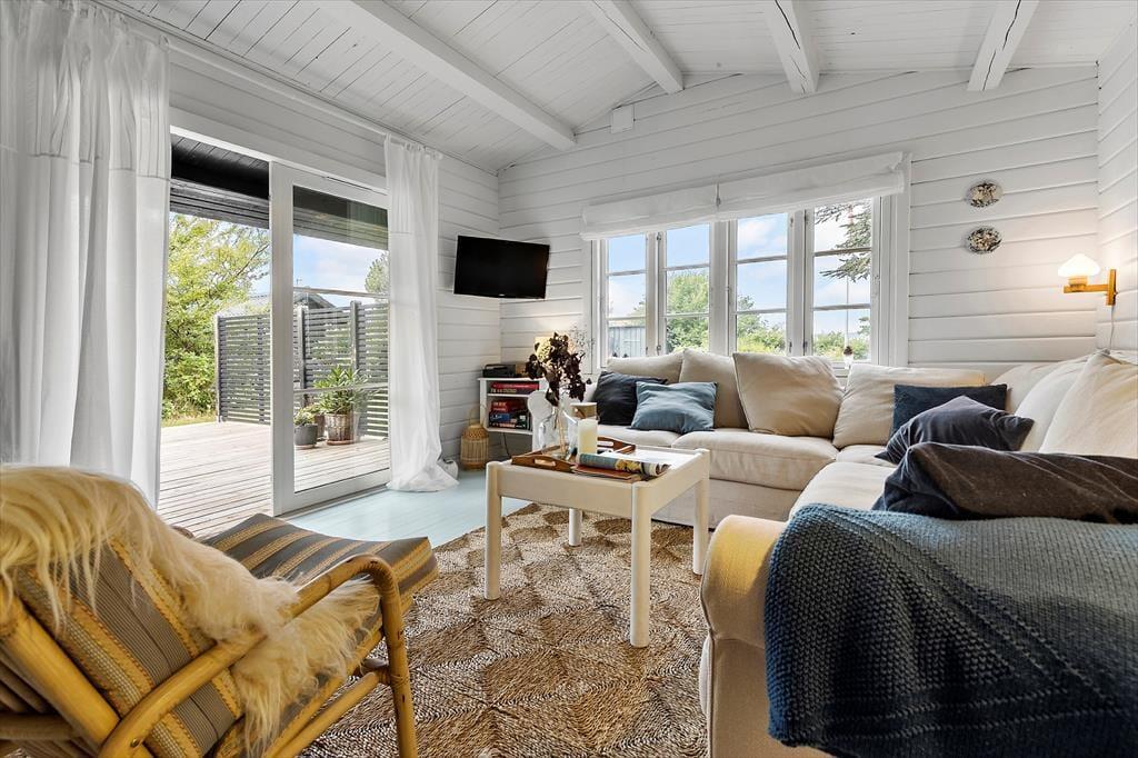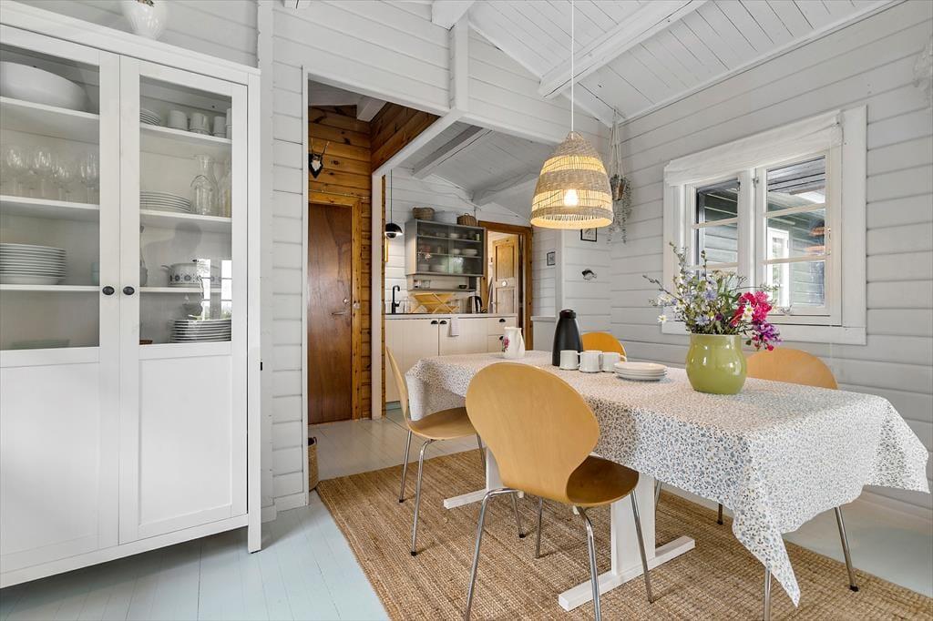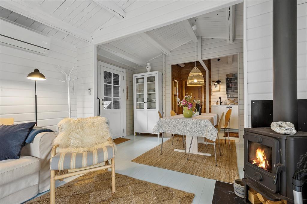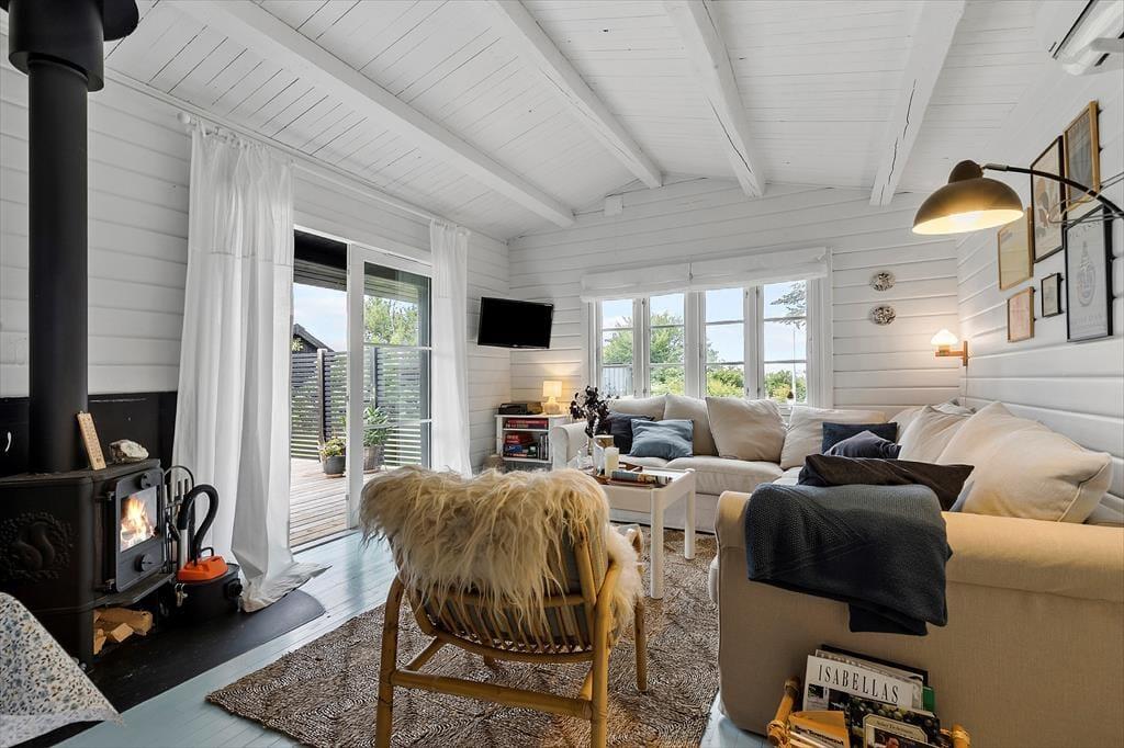 Dein Ferienhaus präsentiert sich hell und einladend. Es besticht nicht nur mit schönster, klassischer Ferienhausgemütlichkeit, sondern auch mit einem Ausblick in Richtung Wasser. Das gemütliche Inventar und die Innenraumgestaltung - beispielsweise die weichen Sofas, die große Fensterpartie und die offene Wohnlösung - machen es dir leicht, dich vom ersten Moment an zu erholen und zu entspannen. In der gut ausgestatteten Küche wird die Zubereitung der täglichen Mahlzeiten zum Kinderspiel. Das Essen genießt du zusammen mit deinen Liebe anschließend am stimmungsvollen Essplatz, der sich zudem bestens für gesellige Runden und vergnügte Spieleabende anbietet. Ab Einbruch der Dämmerung sorgen die schönen Lichtquellen für eine ruhige, stimmungsvolle Atmosphäre - perfekt für entspannte Abende mit einer Wolldecke und hochgelegten Beinen auf dem Sofa.