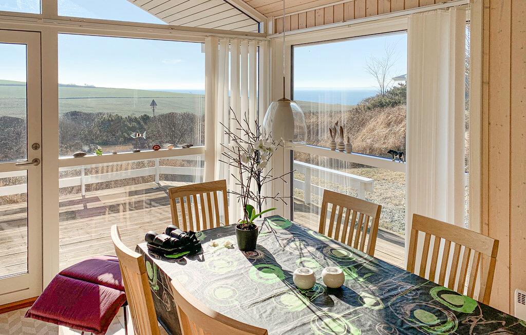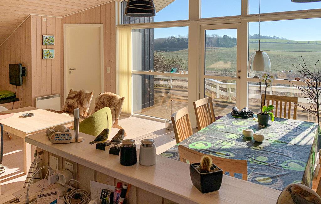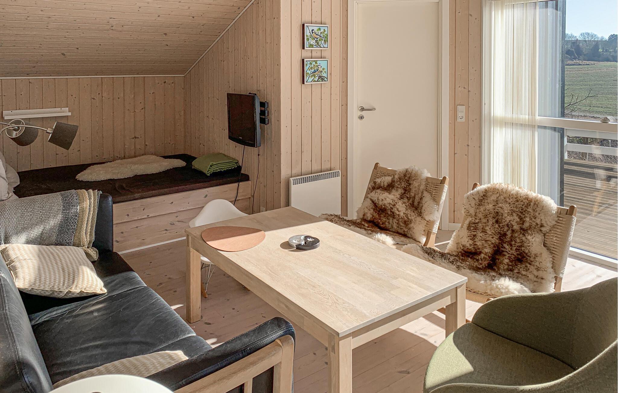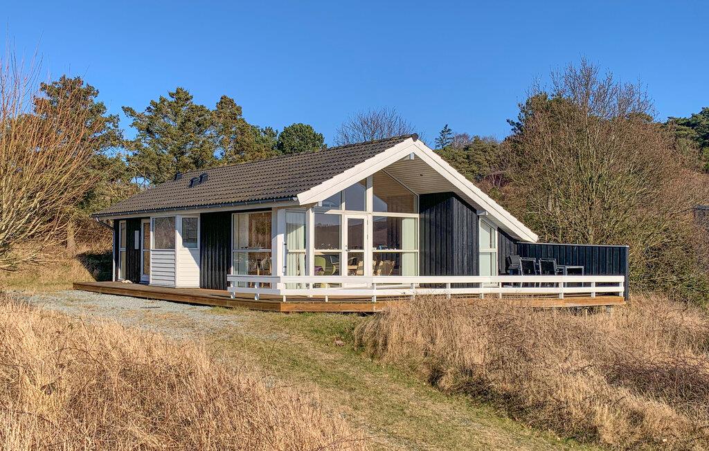 Gemütliches Ferienhaus mit Panoramablick, Holzterrasse und Nähe zum Strand in Knebel, Dänemark.