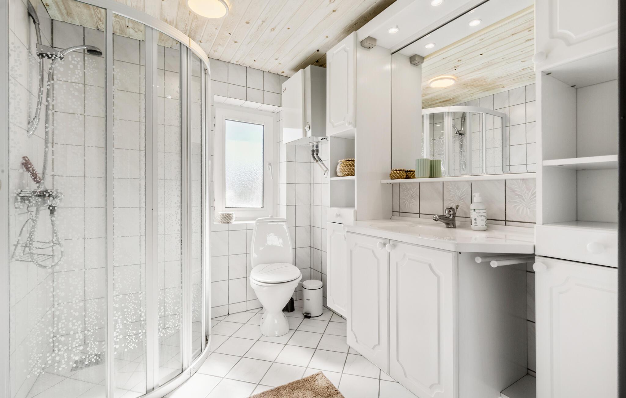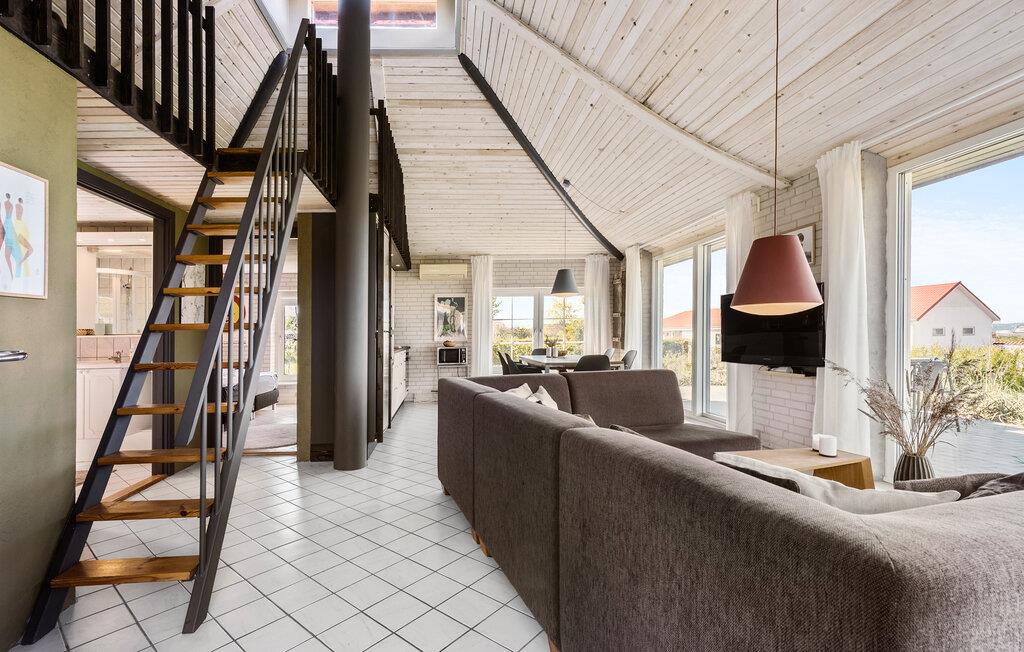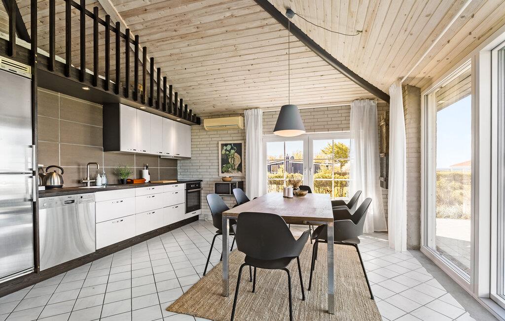 Ihr Ferienhaus liegt in unmittelbarer Nähe zum Skødshoved Strand und bietet beste Voraussetzungen für eine entspannte Auszeit in ruhiger Umgebung. Freuen Sie sich auf eine gelungene Mischung aus klassischer Ferienhausatmosphäre und spannenden Details. Hohe Decken, helle Holzwände und große Fensterflächen schaffen im Wohnbereich eine helle und offene Stimmung. Machen Sie es sich auf dem Sofa gemütlich oder genießen Sie den fantastischen Blick ins Grüne. Die angrenzende Küche ist funktional ausgestattet und in den Wohn- und Speiseraum integriert, ideal für geselliges Kochen und Beisammensein.