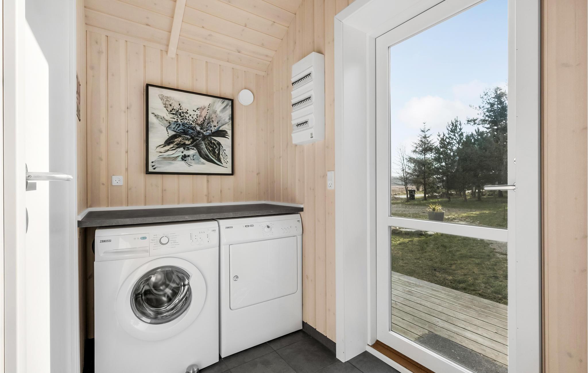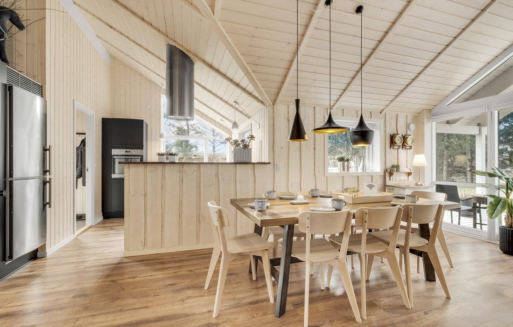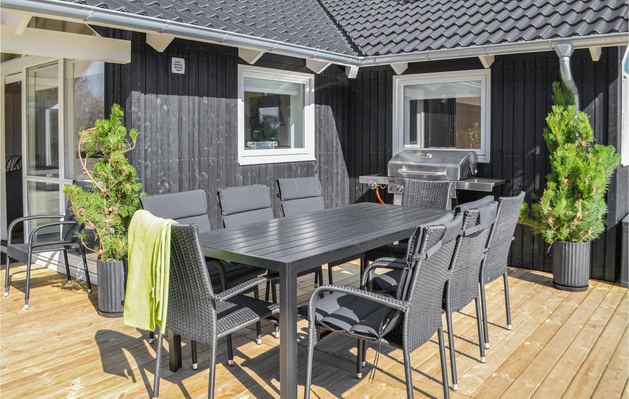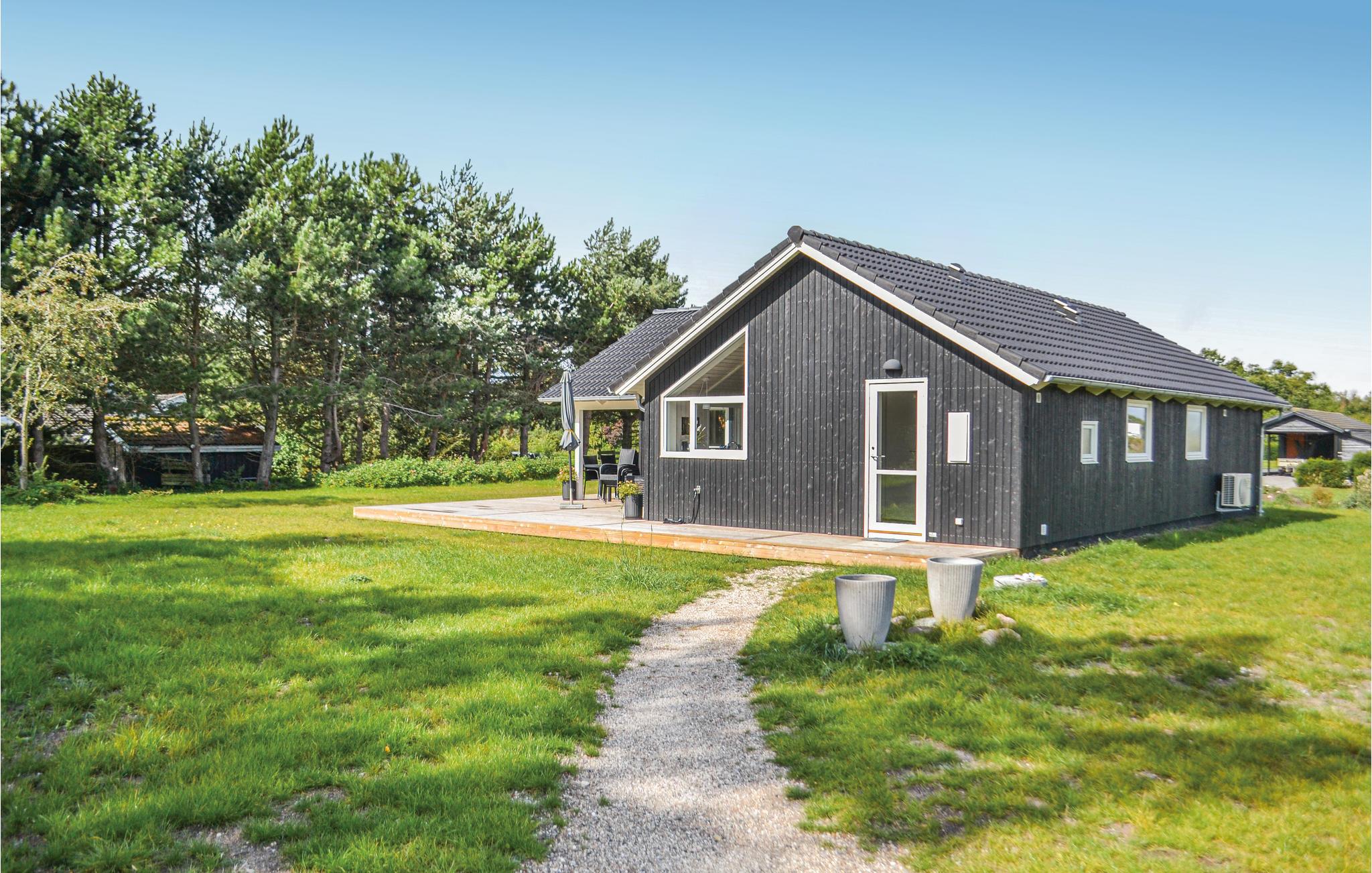 Schönes Ferienhaus auf einem schön angelegten Naturgrundstück und in fußläufiger Entfernung zum kinderfreundlichen Sandstran dnur 100 m vom Haus. Das Haus ist mit guten großen Schlafzimmern ausgestattet und verfügt über zwei Badezimmer. In der Küche gibt es ein Induktionskochfeld. Vom Essbereich gelangen Sie auf die überdachte Terrasse, weitere Terrassenbereiche befinden sich rund um das Haus.