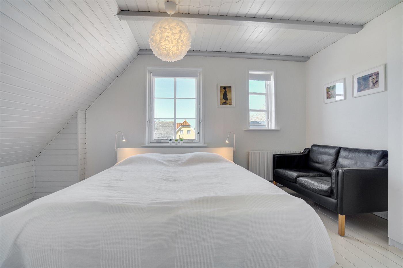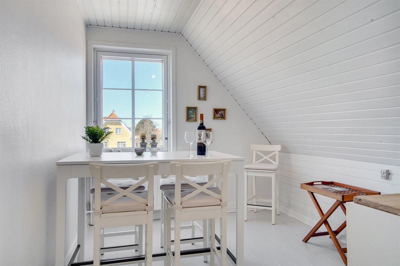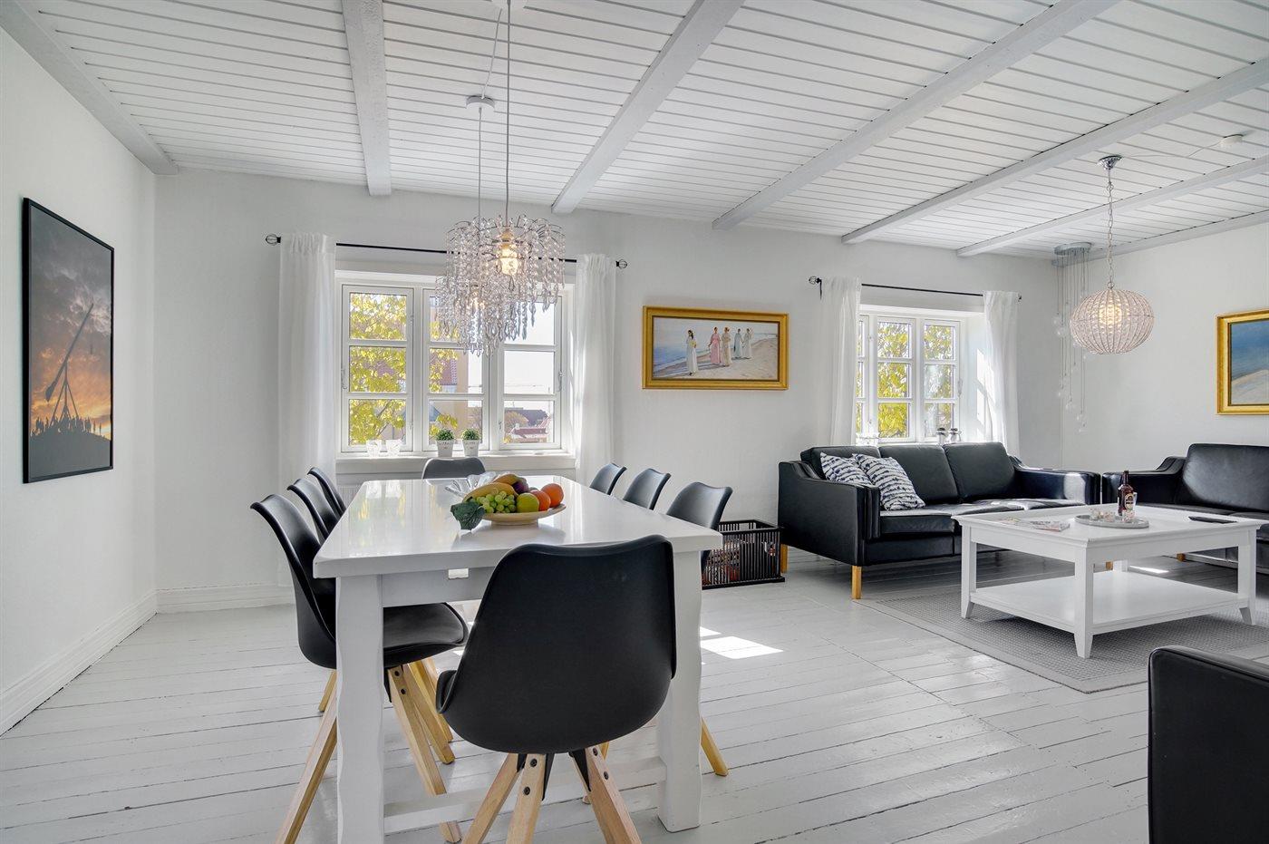 Helle Wohnung in großem Skagenhaus, gegenüber der Kirche von Skagen gelegen, nicht weit vom Zentrum, Hafen und Strand entfernt. Zum Haus gehört ein gemeinsamer Garten mit Gartenmöbeln und überdachte Terrasse.