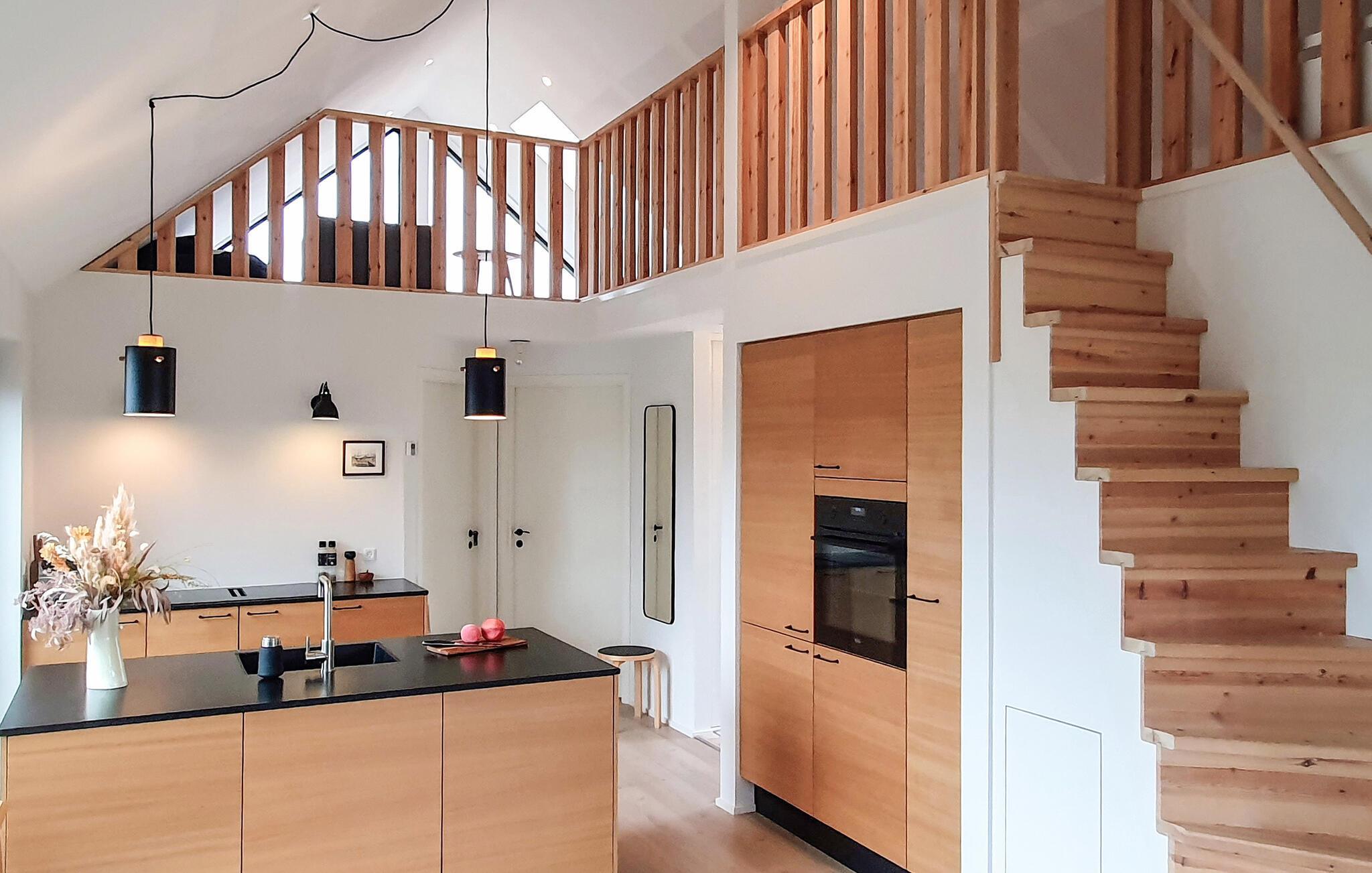 Willkommen an der Spitze Dänemarks. Lassen Sie den Alltag hinter sich und genießen Sie Ihr Ferienhaus mit interessanten architektonischen Details auf einem Dünengrundstück. Das Haus wurde aus hochwertigen Materialien gebaut und besticht durch eine helle und geschmackvolle Einrichtung. Die offene Deckenkonstruktion verleiht dem Haus eine angenehme Atmosphäre, und von dem geräumigen Schlafboden aus genießen Sie eine wunderbare Aussicht.