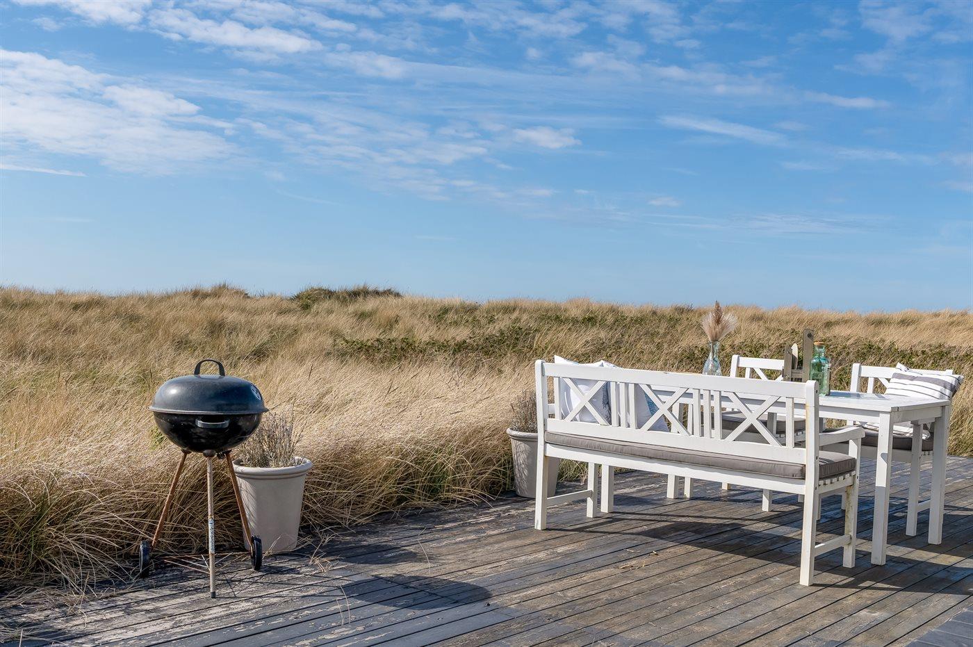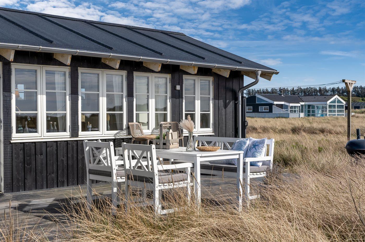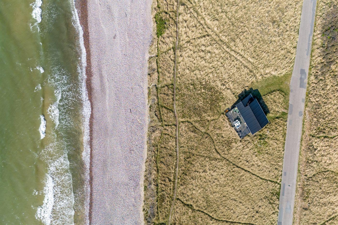 Die Ferienunterkunft liegt auf einem 3000 m² großen Dünengrundstück. Die Entfernung zum Meer beträgt 20 m. Die nächste Einkaufsmöglichkeit liegt 500 m entfernt. Es steht ein 30 m² Terrassenareal zur Verfügung. Parkplatz auf dem Grundstück.