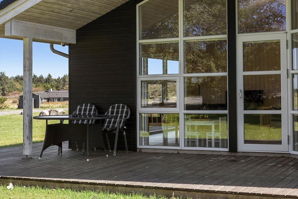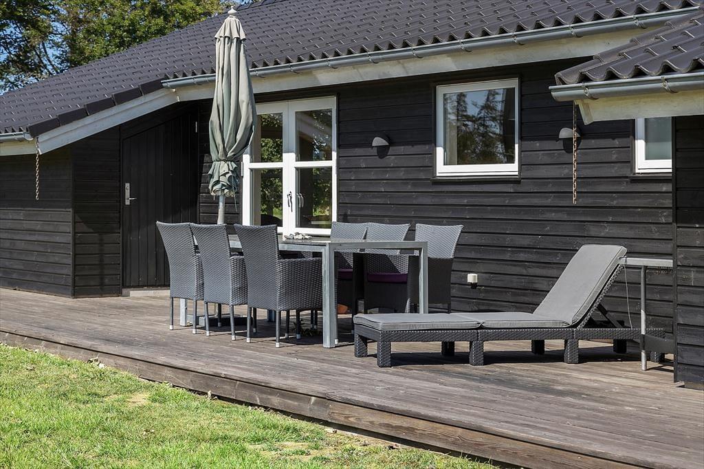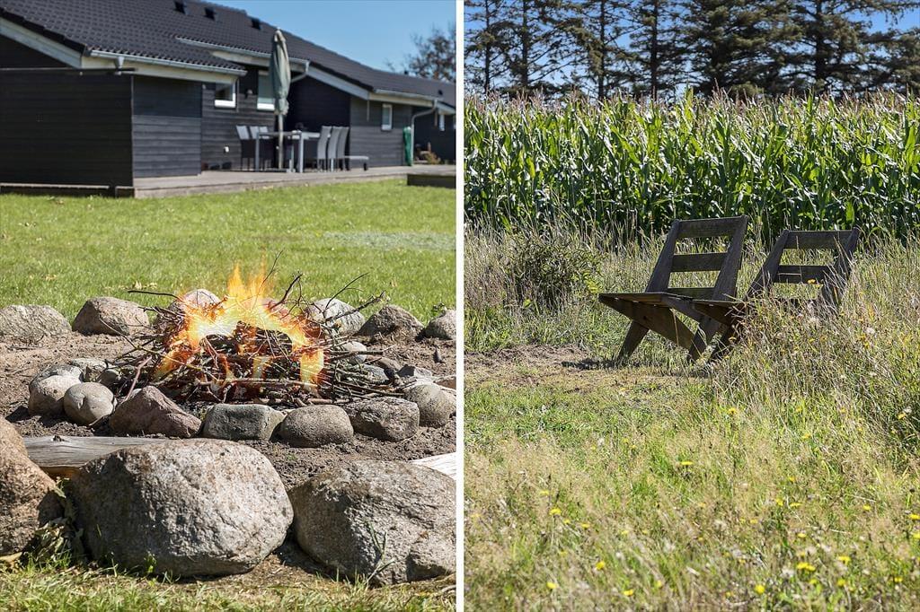 Von der Alkove aus können Sie das Meer erblicken, und von der Terrasse aus können Sie den Blick auf das Wasser und die grüne Landschaft genießen. Eine schöne Holzterrasse umgibt das Haus und bietet Ihnen die Möglichkeit, einen sonnigen Platz zu finden – oder Schatten unter dem Sonnenschirm oder der überdachten Terrasse. Die Kinder können sich mit einer Schaukel, einem Sandkasten und einem Fußballtor vergnügen, und die ganze Familie kann sich am Lagerfeuerplatz versammeln, um Marshmallows zu rösten.