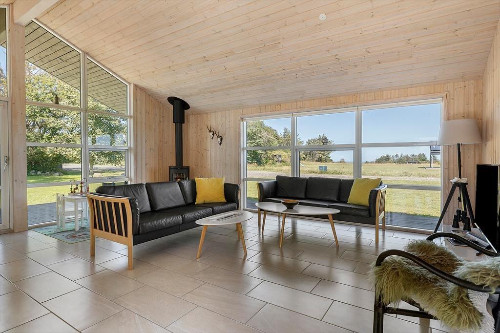 Die 123 m² des Ferienhauses sind so genutzt, dass viel Platz für Entspannung, Schlaf und praktische Aufgaben bleibt. Vom Eingangsbereich aus haben Sie Zugang zu zwei Badezimmern, von denen das größere über ein Spa, eine Sauna, eine Waschmaschine und einen Trockner verfügt. Im selben Teil des Hauses befinden sich drei schöne Schlafzimmer mit insgesamt sechs Schlafplätzen. Es gibt zusätzlich Platz für zwei Personen in der Alkove des Wohnzimmers, die auch tagsüber als gemütliche Ecke dient. Das Wohnzimmer ist mit einem Esstisch und einer schönen Sofaecke ausgestattet, und die gut ausgestattete Küche ist ein integrierter Teil des hellen und einladenden Wohnraums. Der Raum kann sowohl durch einen Kaminofen als auch durch eine energieeffiziente Wärmepumpe beheizt werden, und im gesamten Haus gibt es Fußbodenheizung.