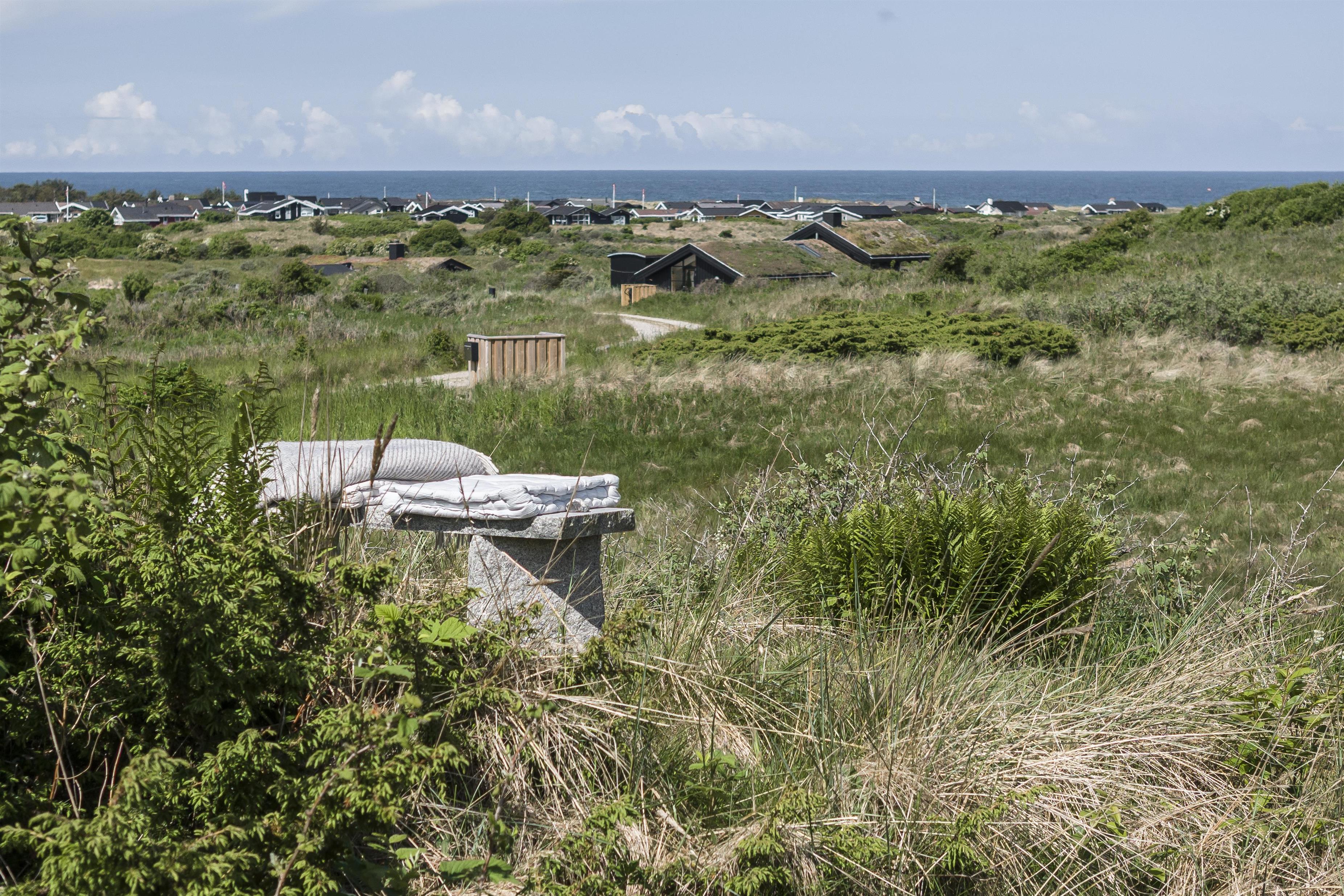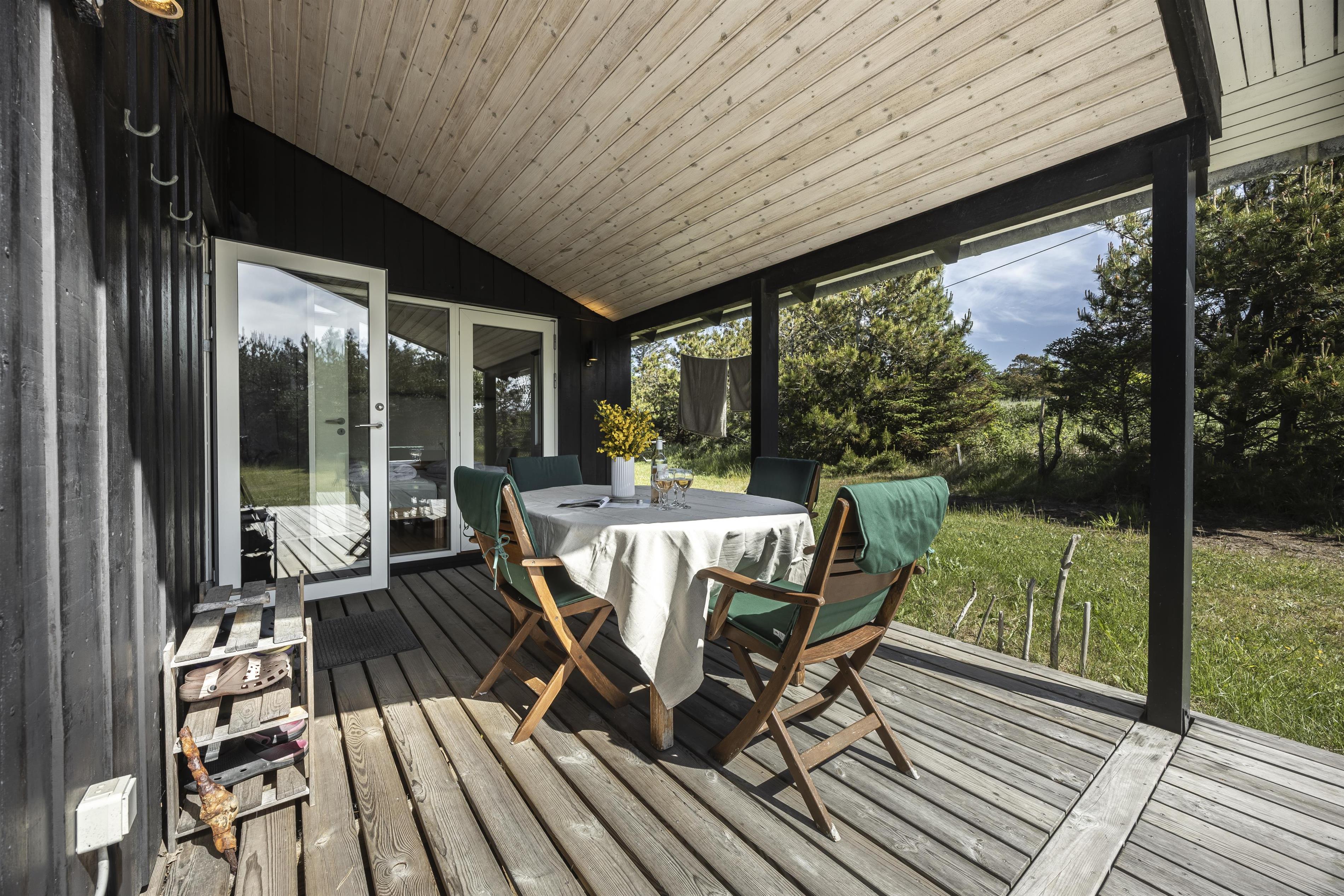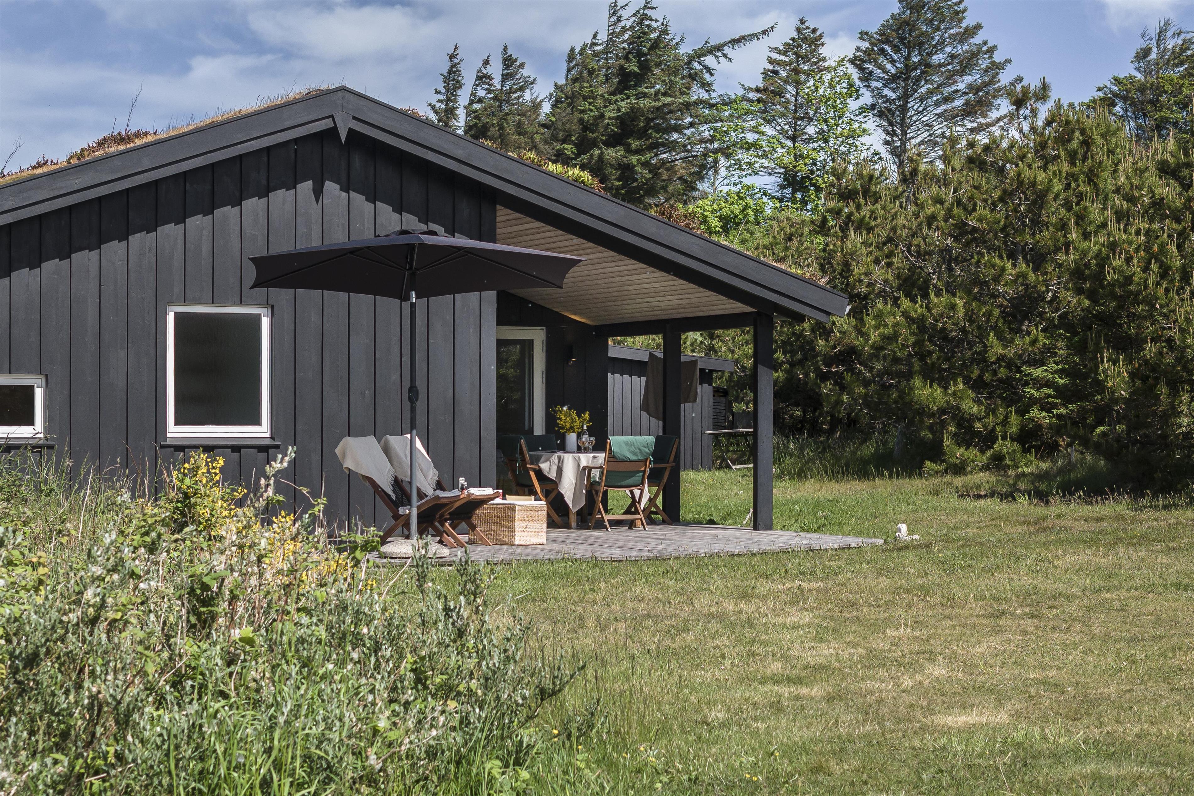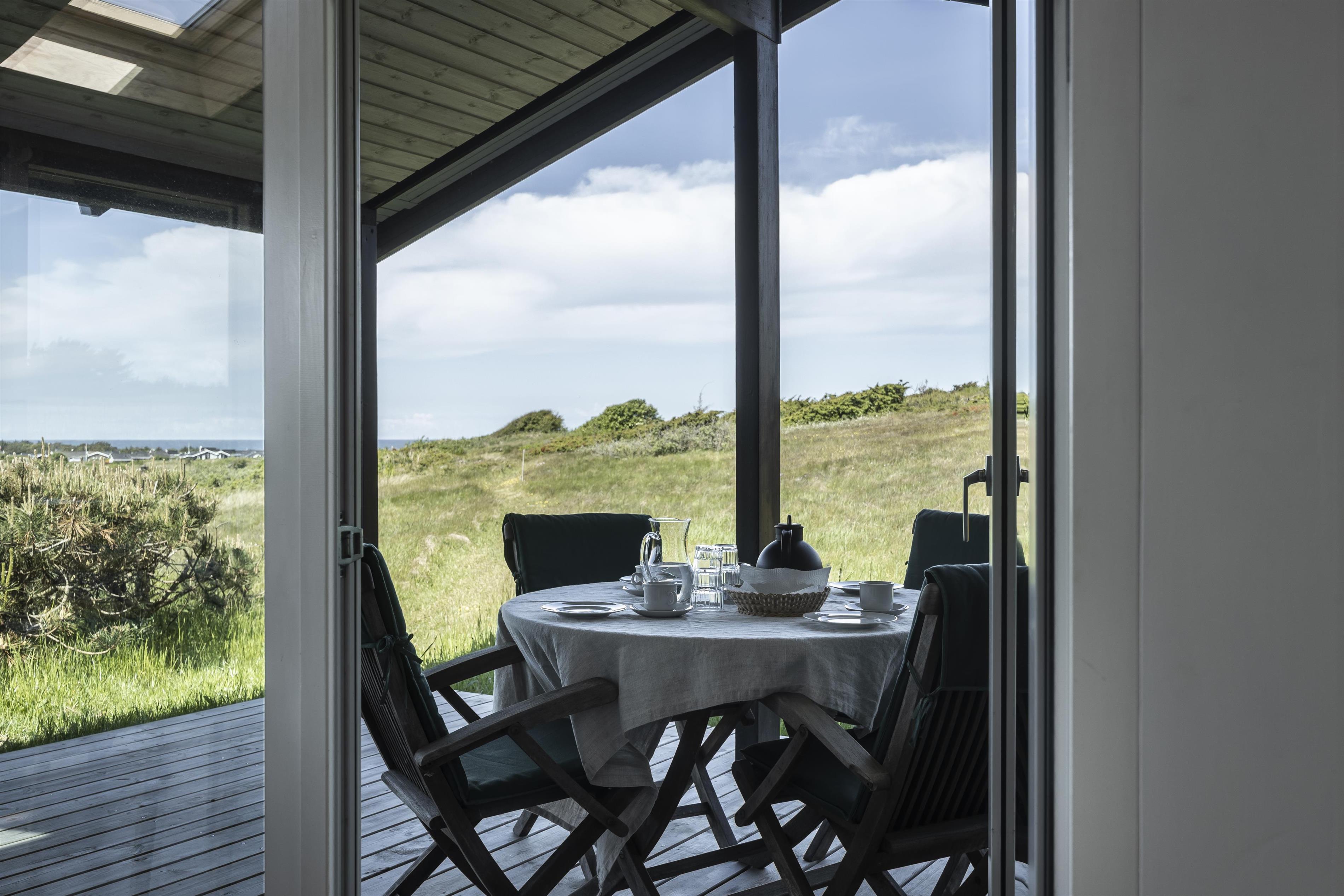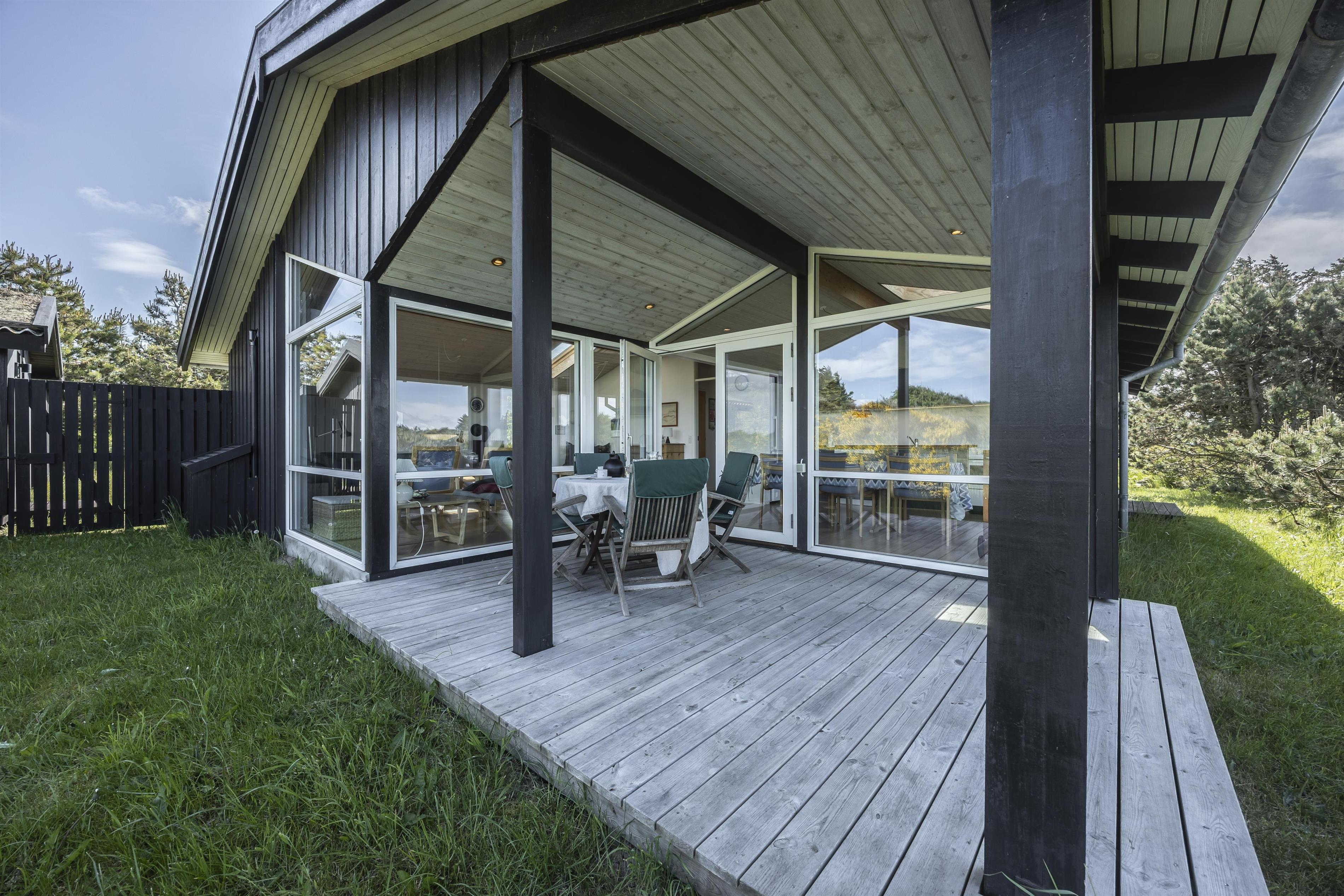 Vom Ferienhaus aus haben Sie direkten Zugang zu mehreren schönen Terrassen, von denen zwei überdacht sind. Die westlich ausgerichtete Terrasse lädt dazu ein, gemeinsame Mahlzeiten am Tisch zu genießen und lange Sommerabende mit Blick auf den Sonnenuntergang zu verbringen. Hier können Sie den Ausblick auf die hügelige Dünenlandschaft genießen – das Grundstück ist völlig ungestört und bietet eine großzügige Distanz zum nächsten Nachbarn.