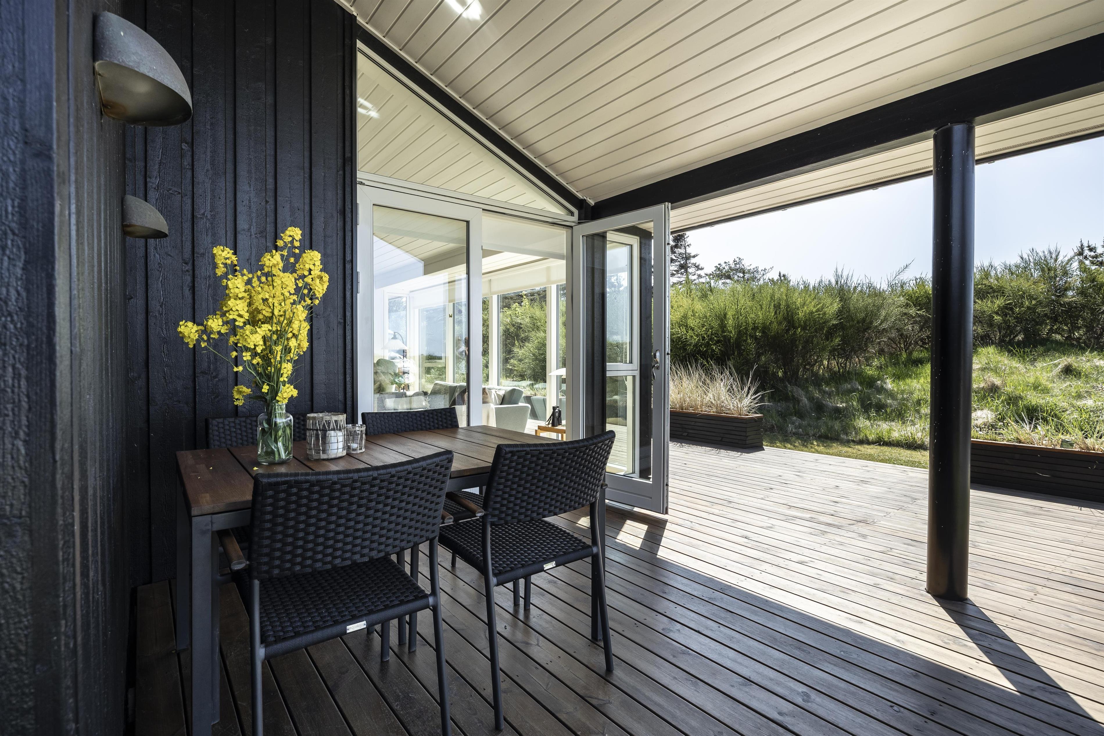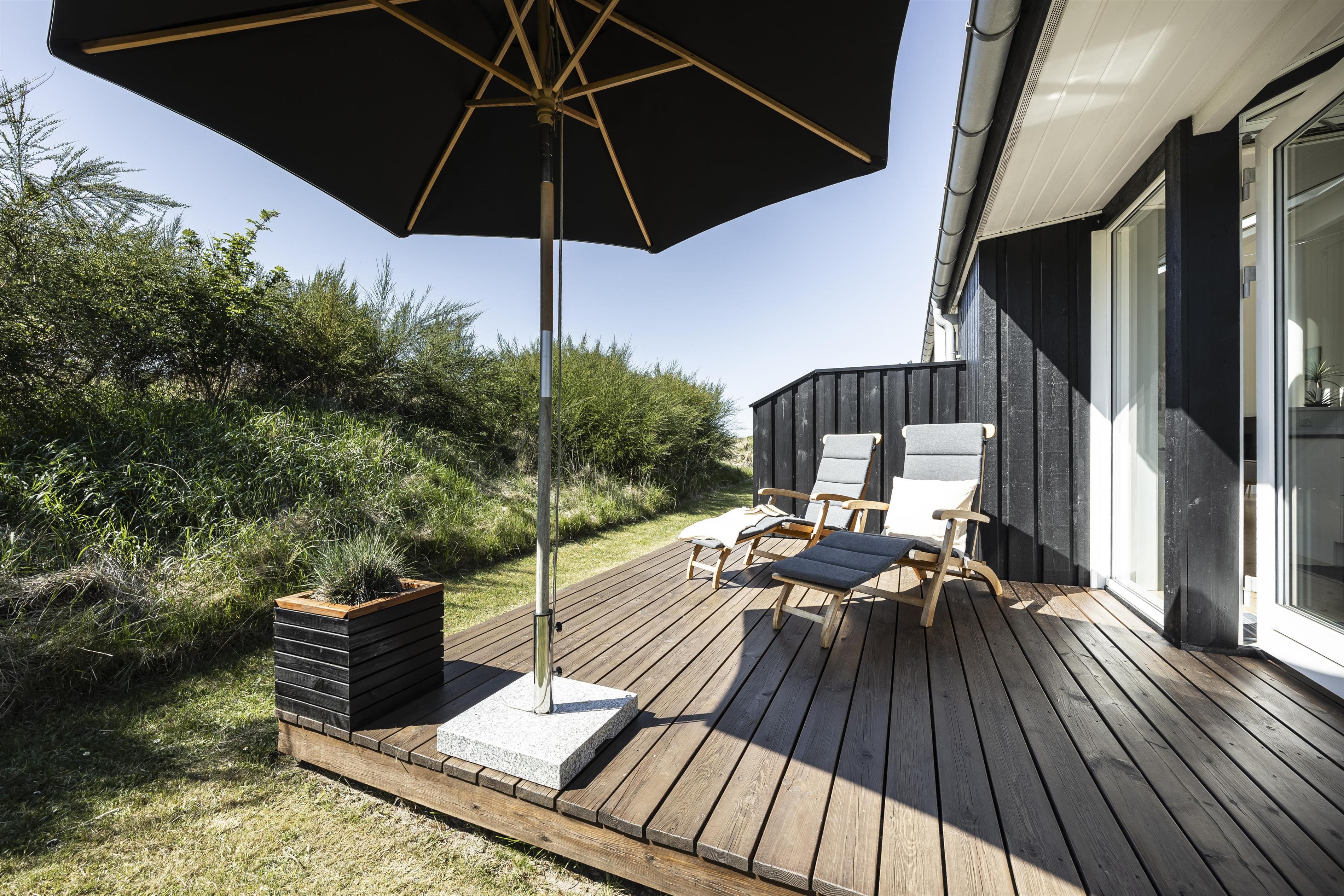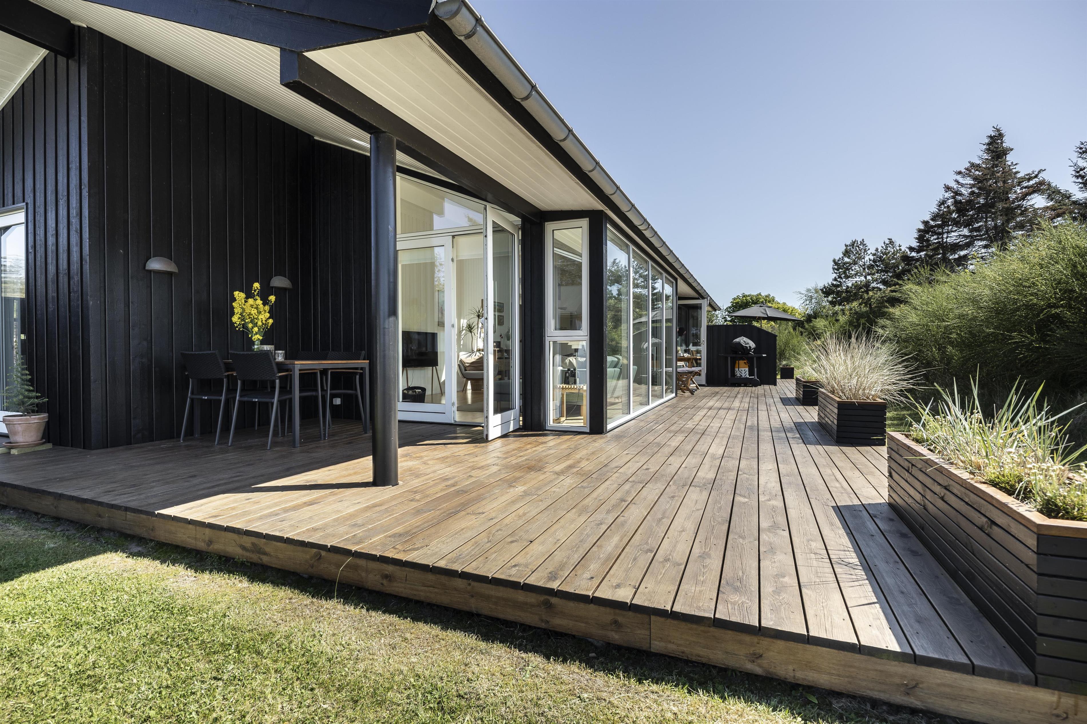 Die schöne Terrasse erstreckt sich rund um das Haus, sodass Sie die Sonne den ganzen Tag über verfolgen können oder bei Bedarf Schutz vor dem manchmal rauen Westwind suchen können. Genießen Sie einen gemütlichen Grillabend auf der Terrasse und beenden Sie den Tag mit einem Blick auf den wunderschönen Sonnenuntergang von der Westterrasse aus. An beiden Enden des Ferienhauses finden Sie auch eine überdachte Terrasse, die zum Verweilen einlädt, wenn der Tau fällt.
