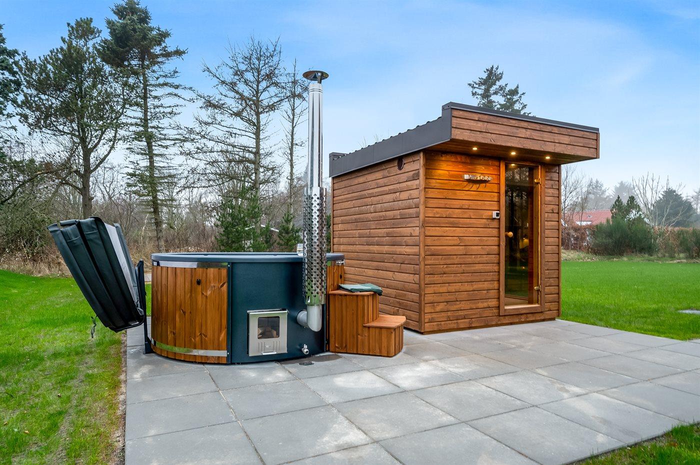 Genieße einen herrlichen Urlaub in einem modernen Ferienhaus auf einem abgeschlossenen Grundstück, ausgestattet mit einem Hot Tub und einer Saunatonne.