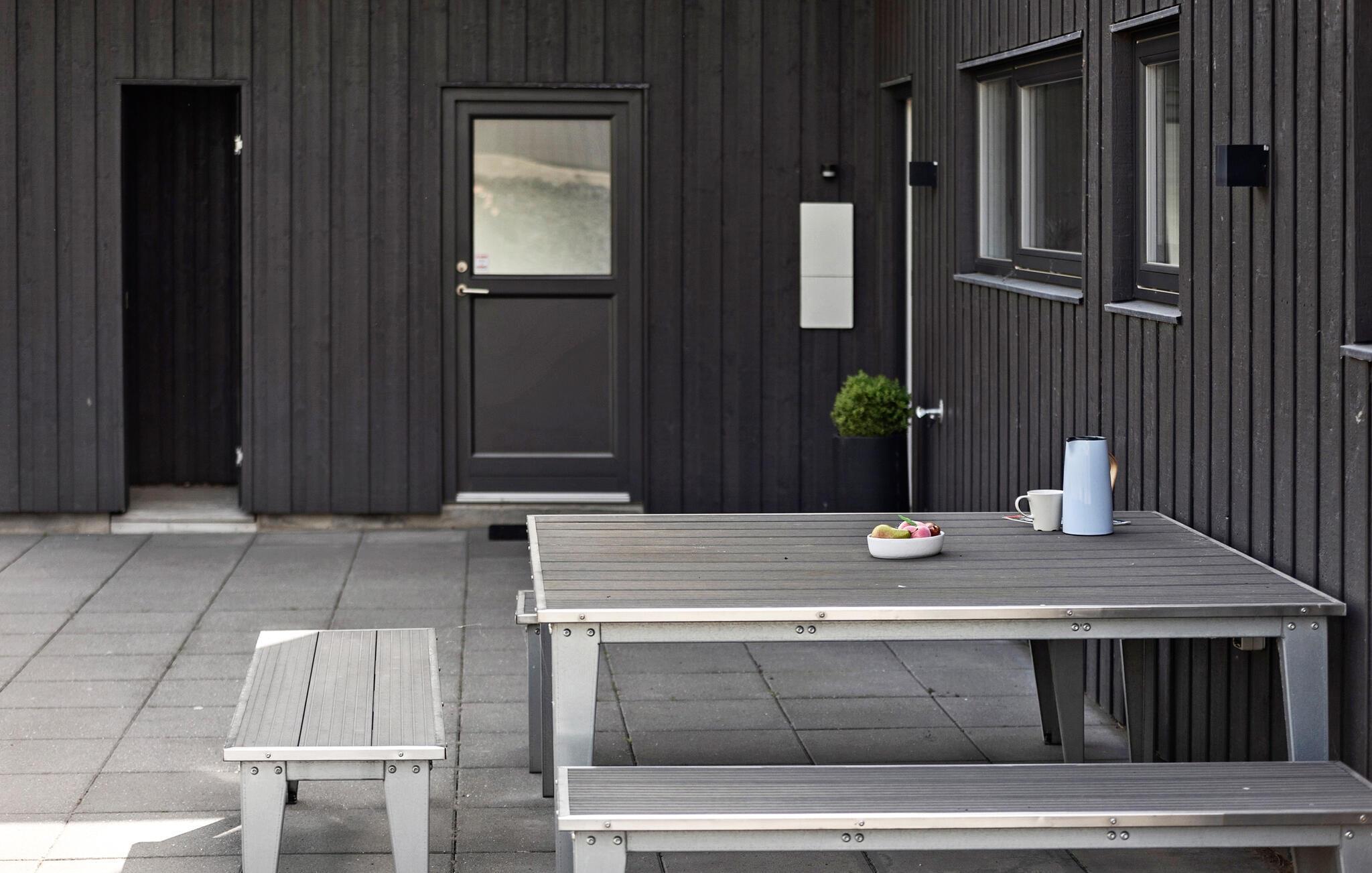 Nehmen Sie Platz auf der überdachten Terrasse und lassen Sie den Blick über das Wasser am Skarrev Strand schweifen. Genießen Sie die frische Luft und verbringen Sie gesellige Stunden beim Grillen oder mit einem Glas Wein im Freien. Der große Außenbereich lädt zudem zum Spielen und Verweilen ein.