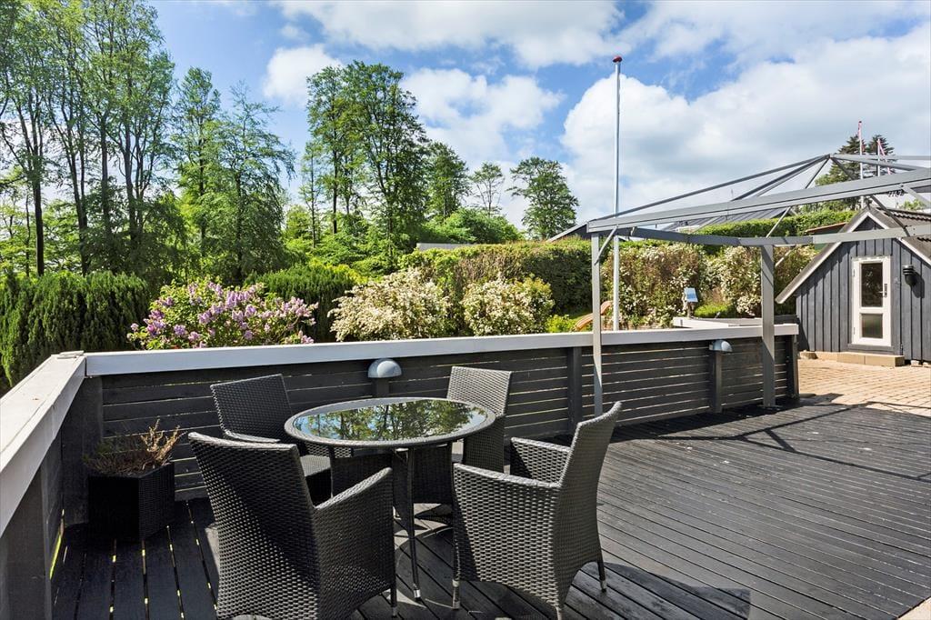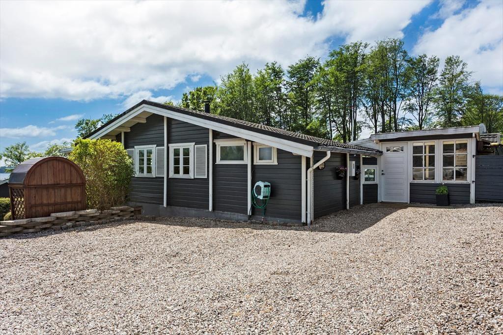 Draußen setzt sich das Urlaubserlebnis in der hügeligen Umgebung fort, die dem Ferienhaus Charakter und Privatsphäre verleiht. Der Garten fügt sich harmonisch in die Landschaft ein und lädt sowohl zum Spielen als auch zum Entspannen und Entdecken ein. Die schönen Terrassen bieten dir zahlreiche Möglichkeiten, den ganzen Tag über Sonne oder Windschutz zu finden, und die überdachte Terrasse macht es leicht, das Leben im Freien auch dann zu genießen, wenn der Abendtau fällt oder ein sommerlicher Regenschauer vorbeizieht. Stell dir lange Mahlzeiten unter freiem Himmel vor, das Zwitschern der Vögel in den Baumwipfeln und den Blick, der immer wieder zum Fjord in der Ferne wandert. Beginne den Tag mit einem Frühstück mit Aussicht und lasse ihn mit einem Glas Wein ausklingen, während die Sonne untergeht und den Himmel in sanfte Farben taucht. Die Außenbereiche werden schnell zum natürlichen Treffpunkt, an dem bleibende Urlaubserinnerungen entstehen.