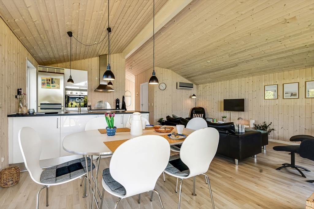 Beim Betreten des Ferienhauses wirst du von einem hellen und geräumigen Wohnbereich empfangen, in dem Wohnzimmer, Esszimmer und Küche zu einem einladenden Raum verschmelzen. Hier bietet es sich an, mit der Familie die Mahlzeiten am Esstisch zu genießen, während die Gespräche fließen und sich der Duft von Speisen aus der Küche ausbreitet. Nach dem Essen könnt ihr euch im Sofa mit einem Kartenspiel oder einem guten Film entspannen, während draußen der Abend hereinbricht. Die Einrichtung schafft eine entspannte Atmosphäre mit Platz für gemeinsame Erlebnisse ebenso wie für ruhige Momente – so kannst du den Urlaub genau in deinem eigenen Tempo genießen.