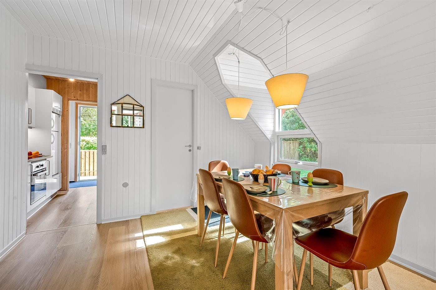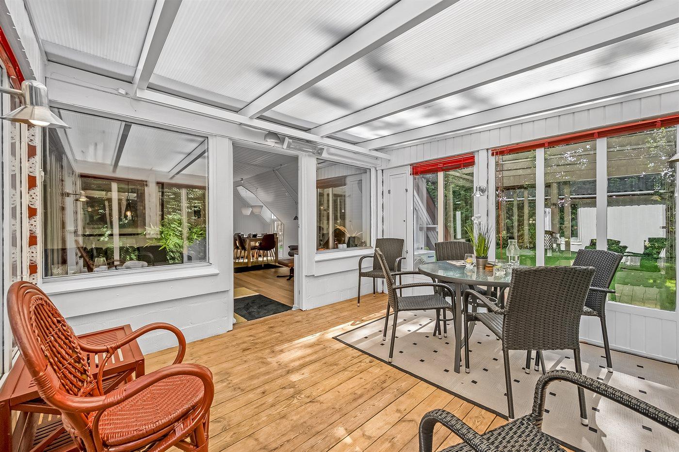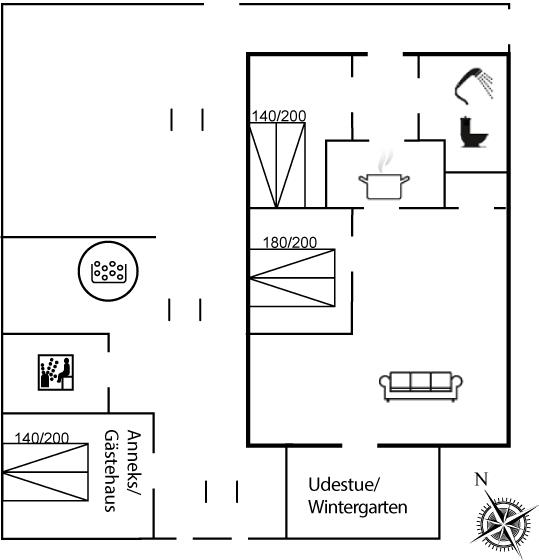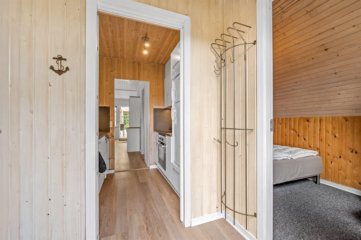 Im Inneren gibt es Holzböden im Wohnzimmer und in der Küche. Im restlichen Haus gibt es Teppichböden – jedoch vinyl im Flur. Das Ferienhaus verfügt über ein gutes Badezimmer mit Fußbodenheizung, Duschnische und Waschmaschine. Nette, kleine Küche mit u. a. Geschirrspüler und Tiefkühlgerät. Gemütliches Wohnzimmer mit Kaminofen, Kabel-TV, digitalem Satellitenanschluss und Stereoanlage mit CD-Spieler. Vom Wohnzimmer direkter Ausgang zu schönem Wintergarten. Außerdem kostenlose ADSL-Internetverbindung vorh. (Computer ist mitzubringen). 2 Schlafzimmer, beide mit Doppelbett. Außerdem Gästehaus mit Doppelbett. Für die kleinen Feriengäste stehen Kinderbett und Kinderhochstuhl zur Verfügung.