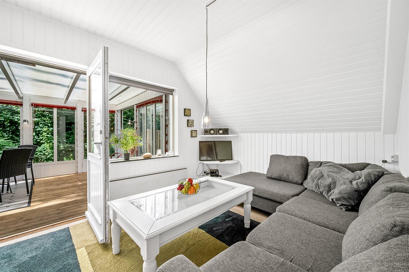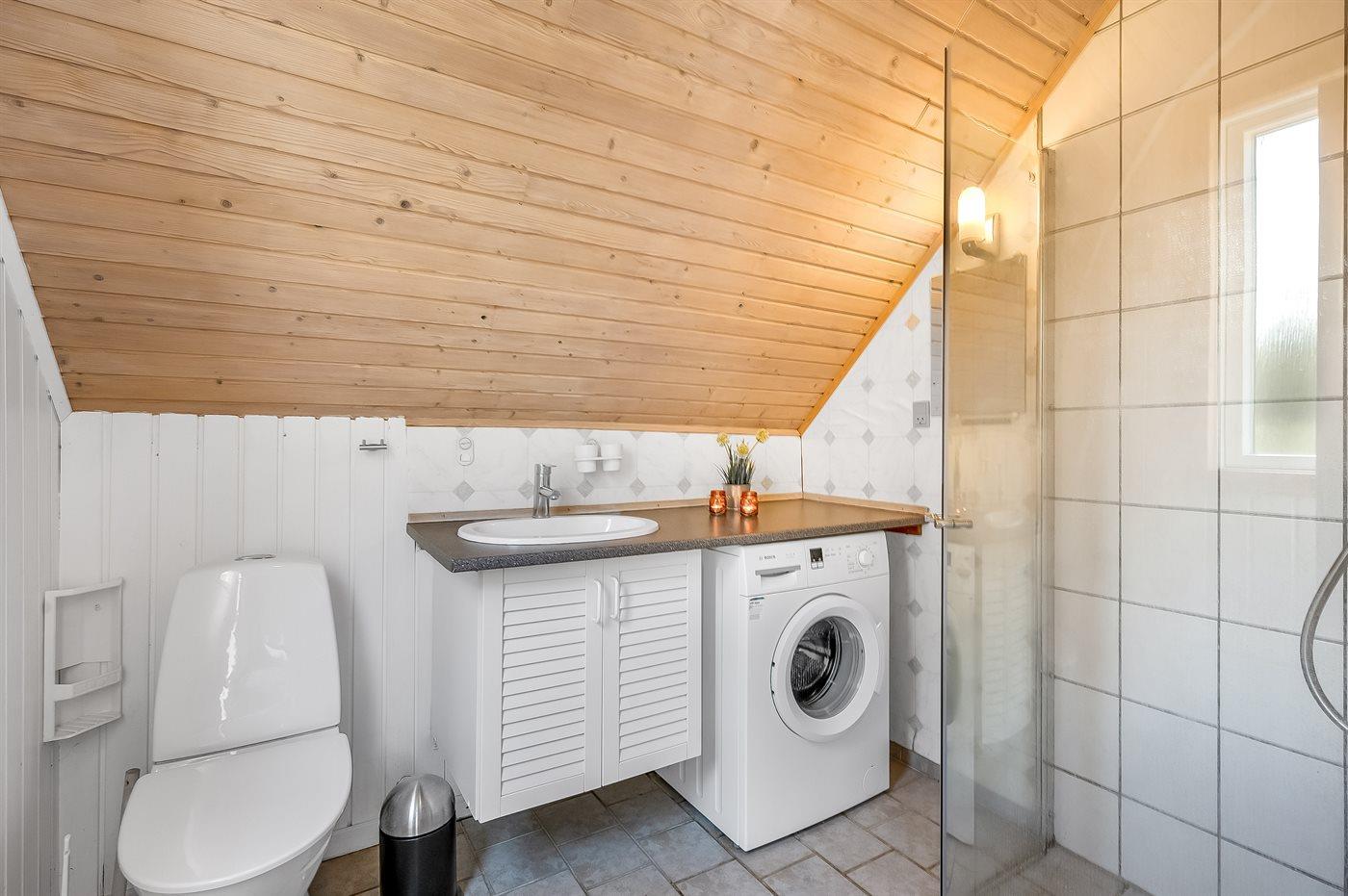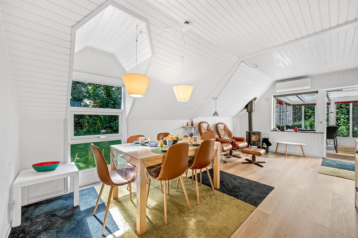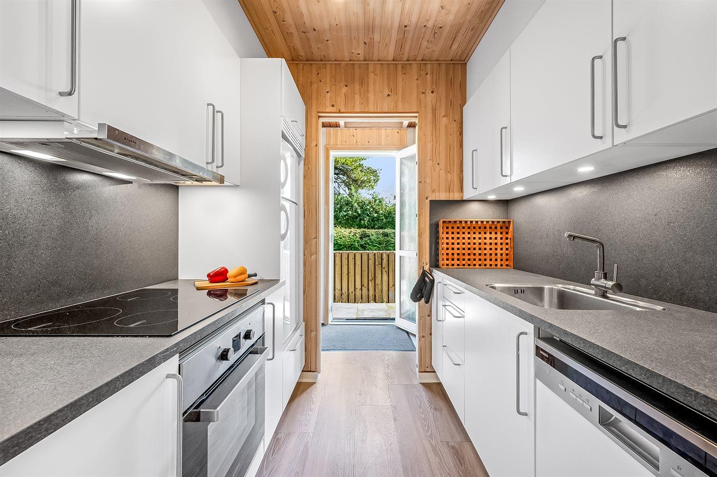 Im Inneren gibt es Holzböden im Wohnzimmer und in der Küche. Im restlichen Haus gibt es Teppichböden – jedoch vinyl im Flur. Das Ferienhaus verfügt über ein gutes Badezimmer mit Fußbodenheizung, Duschnische und Waschmaschine. Nette, kleine Küche mit u. a. Geschirrspüler und Tiefkühlgerät. Gemütliches Wohnzimmer mit Kaminofen, Kabel-TV, digitalem Satellitenanschluss und Stereoanlage mit CD-Spieler. Vom Wohnzimmer direkter Ausgang zu schönem Wintergarten. Außerdem kostenlose ADSL-Internetverbindung vorh. (Computer ist mitzubringen). 2 Schlafzimmer, beide mit Doppelbett. Außerdem Gästehaus mit Doppelbett. Für die kleinen Feriengäste stehen Kinderbett und Kinderhochstuhl zur Verfügung.