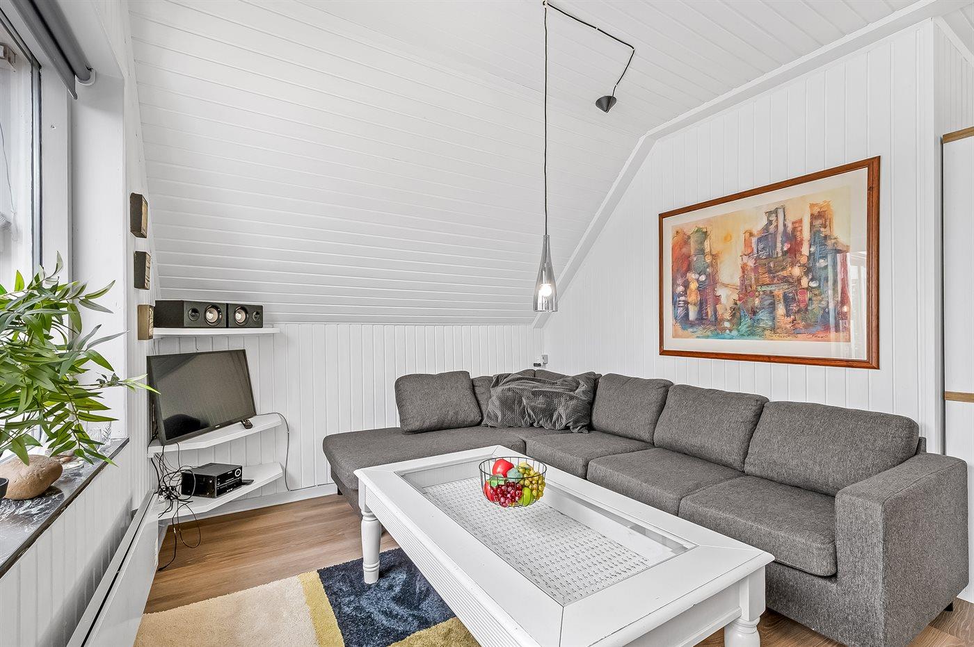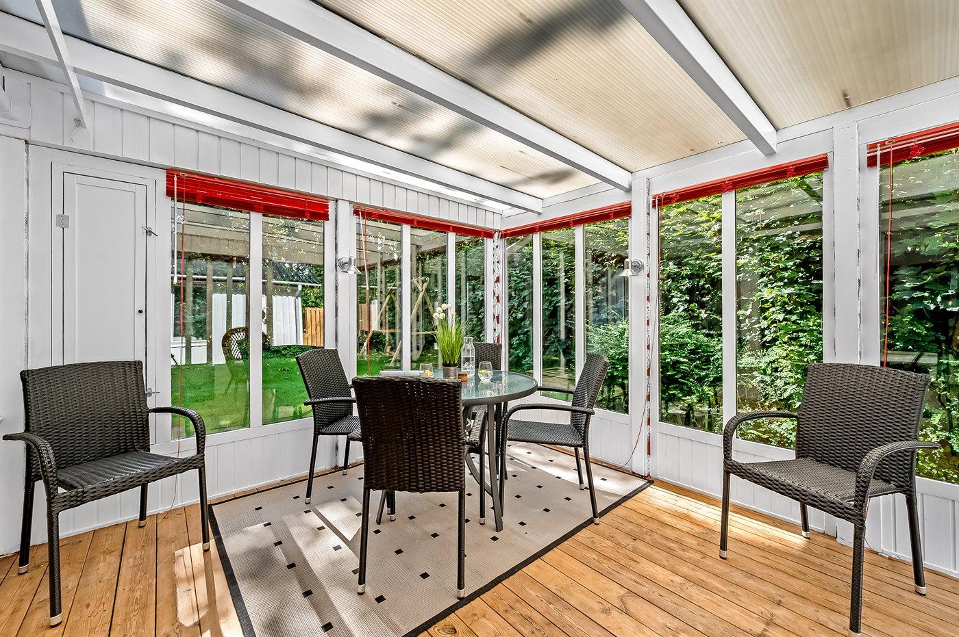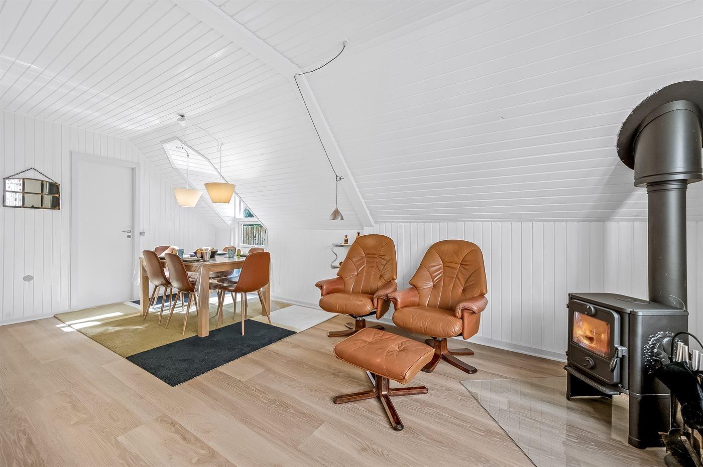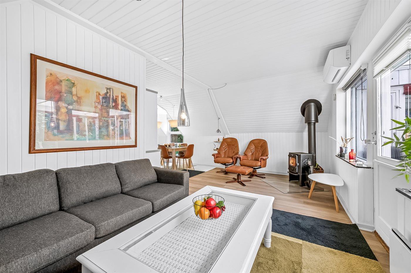 Im Inneren gibt es Holzböden im Wohnzimmer und in der Küche. Im restlichen Haus gibt es Teppichböden – jedoch vinyl im Flur. Das Ferienhaus verfügt über ein gutes Badezimmer mit Fußbodenheizung, Duschnische und Waschmaschine. Nette, kleine Küche mit u. a. Geschirrspüler und Tiefkühlgerät. Gemütliches Wohnzimmer mit Kaminofen, Kabel-TV, digitalem Satellitenanschluss und Stereoanlage mit CD-Spieler. Vom Wohnzimmer direkter Ausgang zu schönem Wintergarten. Außerdem kostenlose ADSL-Internetverbindung vorh. (Computer ist mitzubringen). 2 Schlafzimmer, beide mit Doppelbett. Außerdem Gästehaus mit Doppelbett. Für die kleinen Feriengäste stehen Kinderbett und Kinderhochstuhl zur Verfügung.