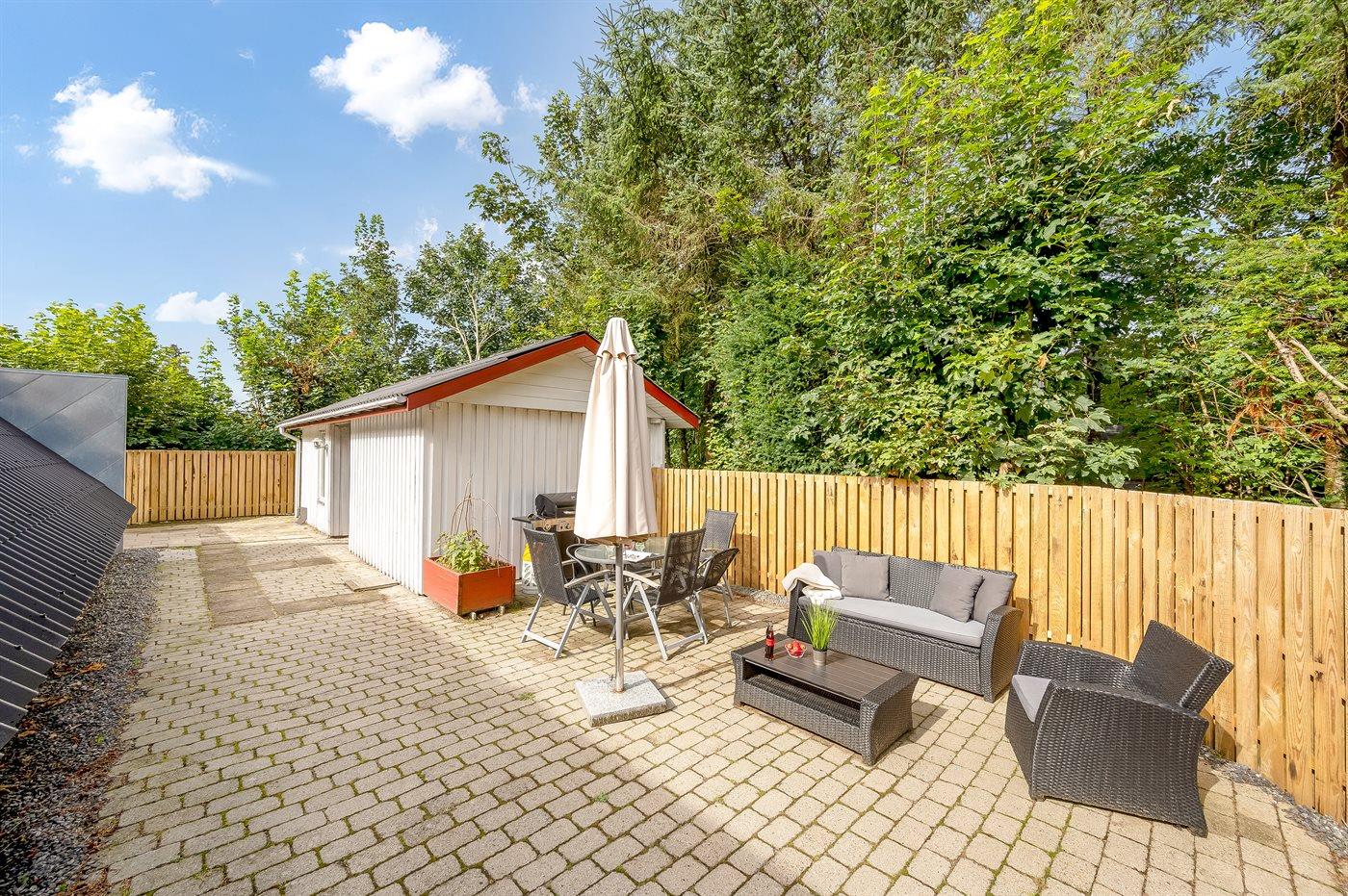 Zum Haus gehört ein großer, offener Sonnenhof mit gutem Windschutz, Außenwhirlpool, infraroter Saunakabine und Gartenmöbeln.